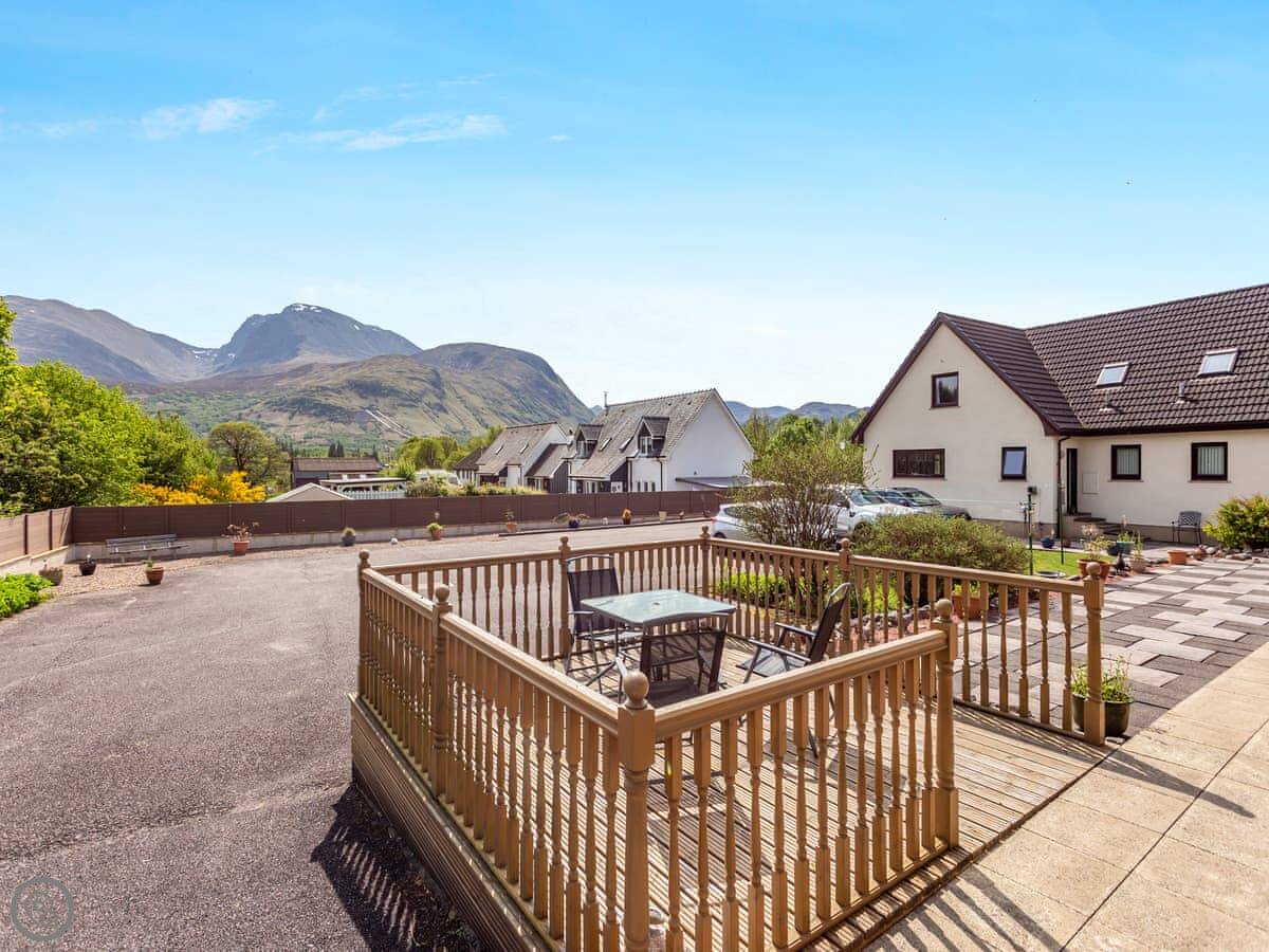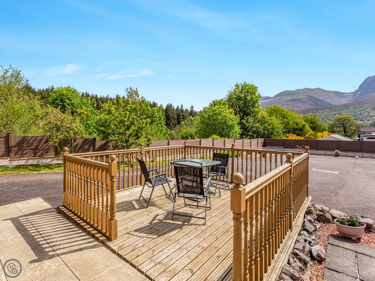 Outside, there's a patio and a bit of decking that's slightly higher up. You get the furniture to sit out there. It's a good spot to look at the mountain.