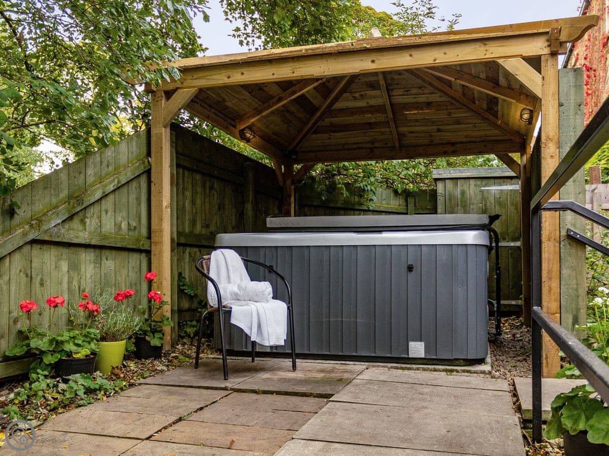 You get a private garden area on two levels. The upper patio has a hot tub for four adults. It's for your use only. The garden looks out over fields.