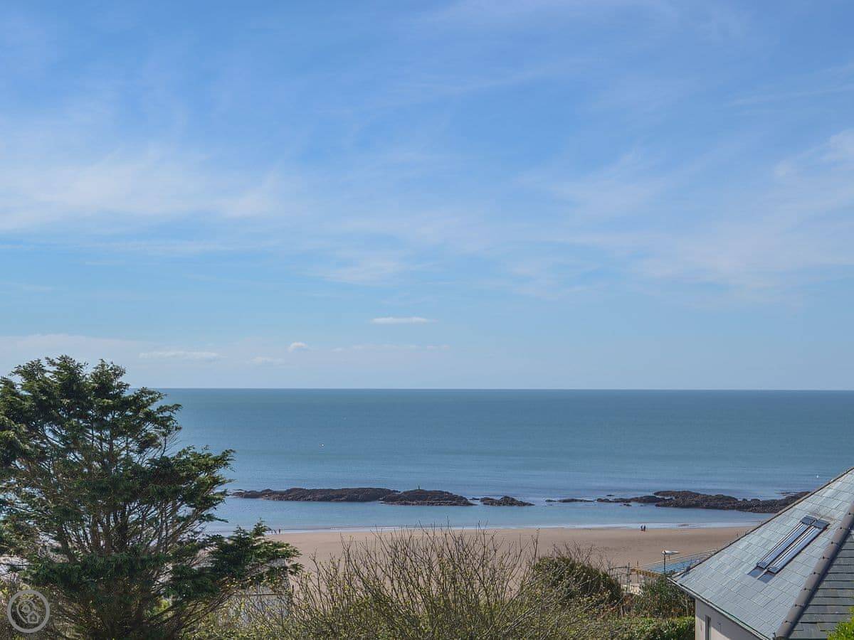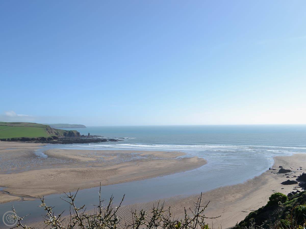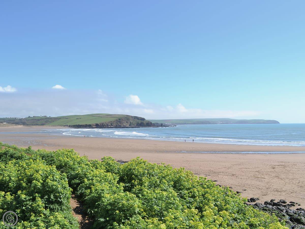 It's a two minute walk to the beach. The beach is sandy, good for families and surfing, and dogs are allowed. The coastal path runs right past. There's a café, a surf shop, a pub, and a restaurant all within a few hundred yards.