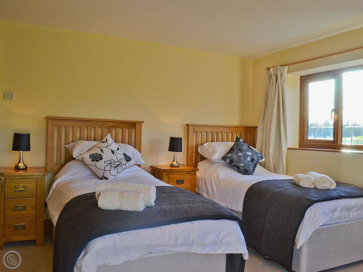 Celyn is in Weston Madoc, near Welshpool in Powys. It's a detached stone house that sleeps sixteen. Seven bedrooms, five bathrooms. It's got a 4 Star rating. It's a big, solid place, good for a group.