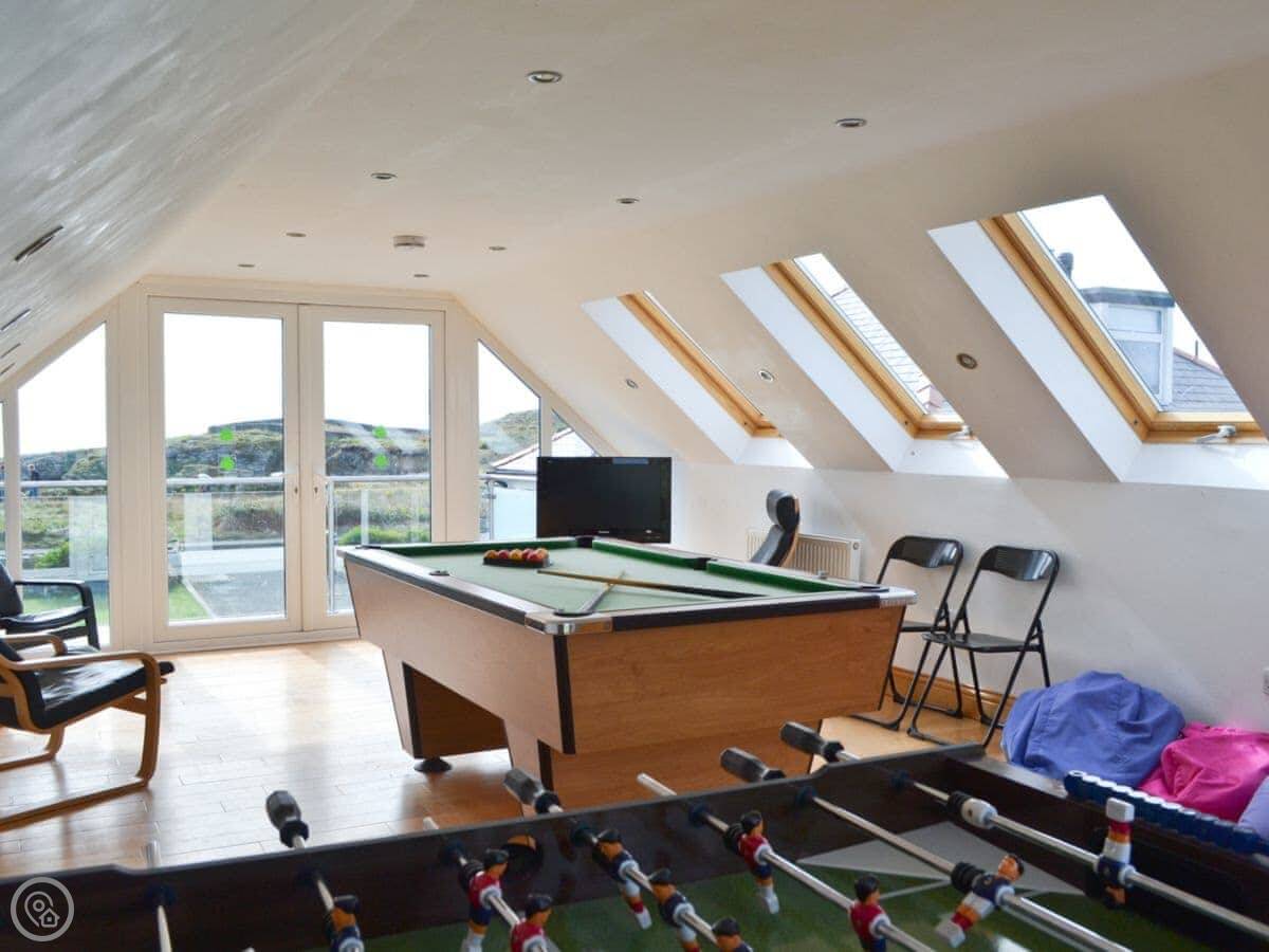 The annexe has a games room with a pool table and table football. There's a seating area with a TV in there too. Gardens front and back, and the driveway's big enough if you want to bring a boat.