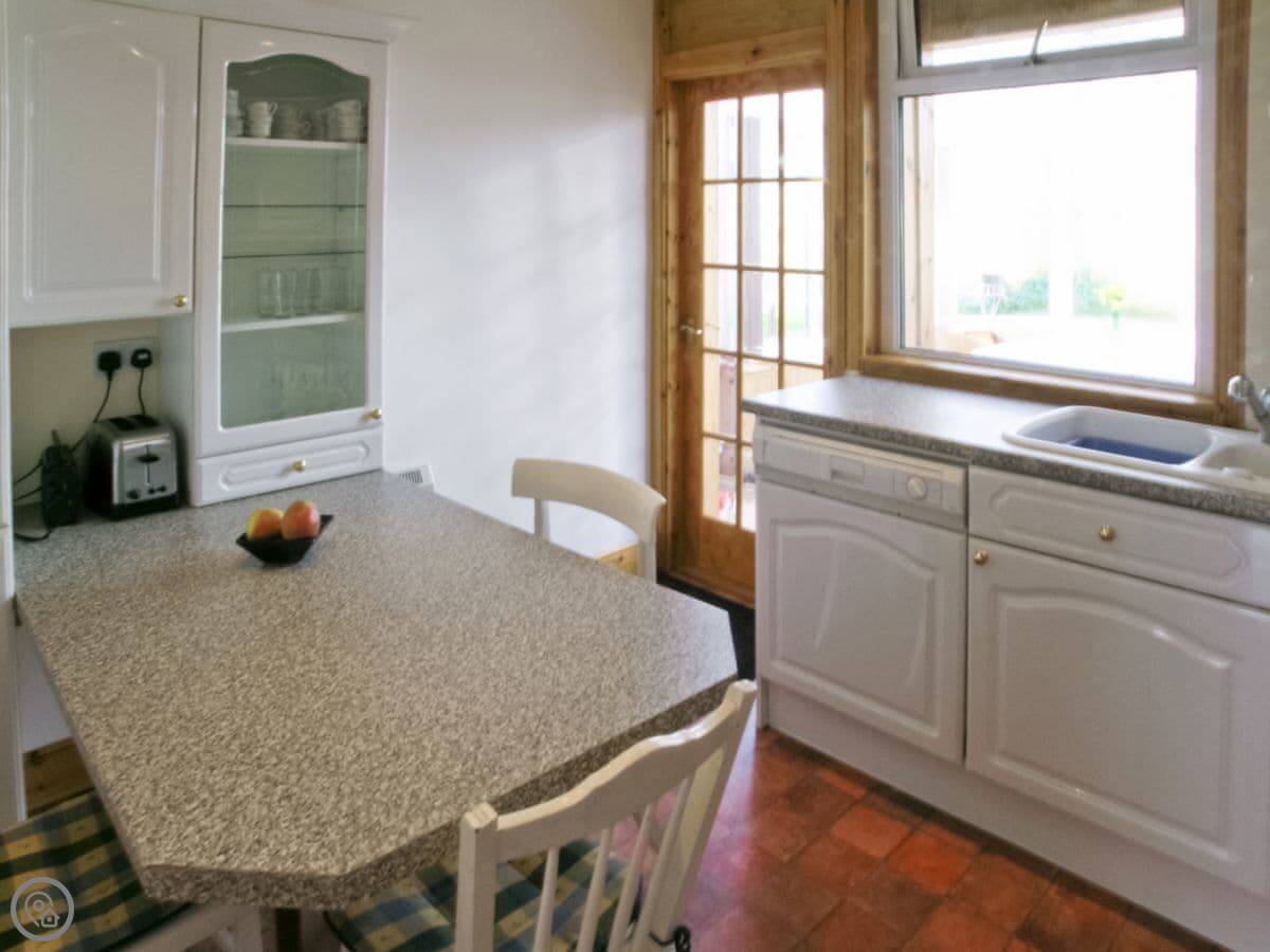 Inside, it's got everything you'd expect: a washing machine, dishwasher, WiFi, TV. Bedding and towels are included. There's a cot if you need one. Parking is right outside.