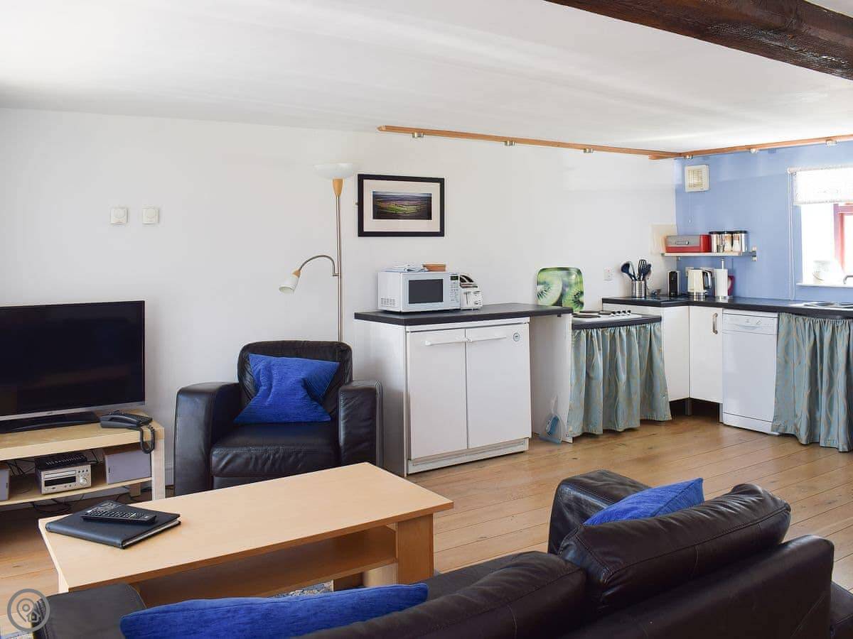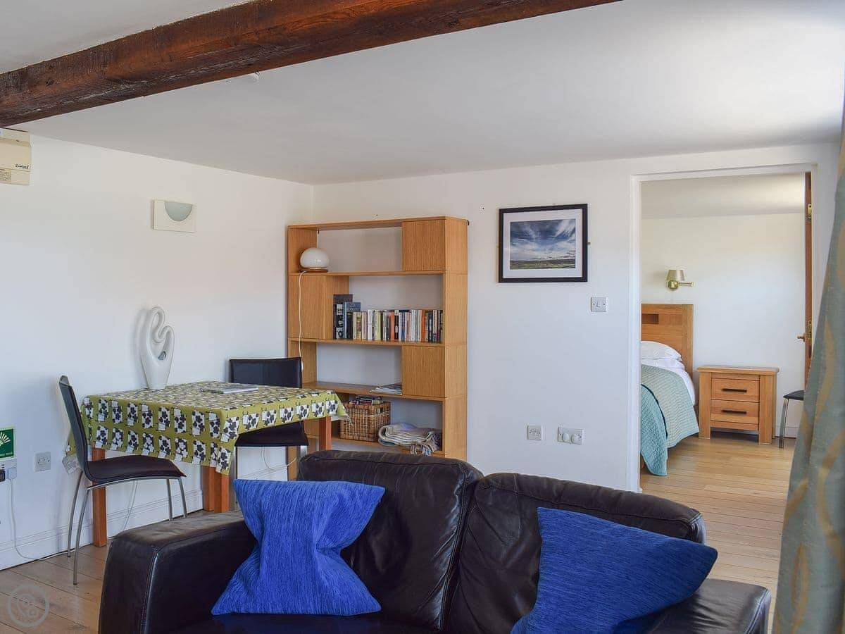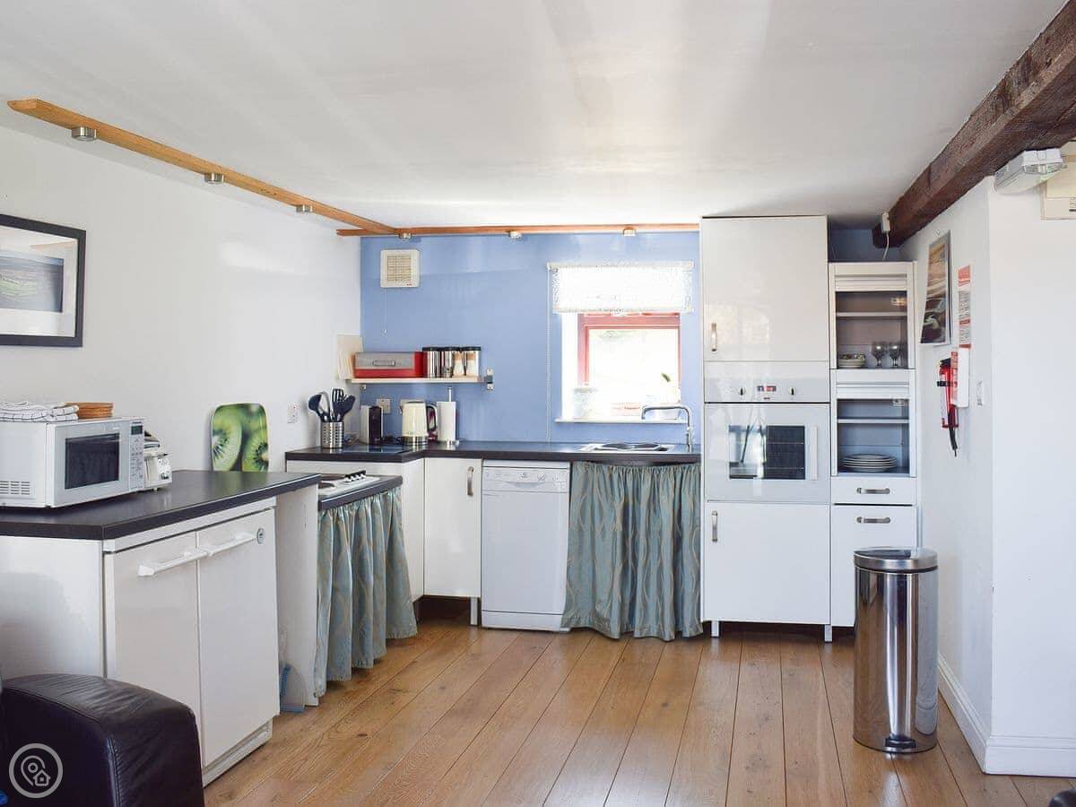 It's open plan inside. The ceiling is high with some old beams. The floor is solid oak. It's a spacious room. There's underfloor heating, a dishwasher, a washing machine, and satellite TV. WiFi's included. All bedding and towels are provided.