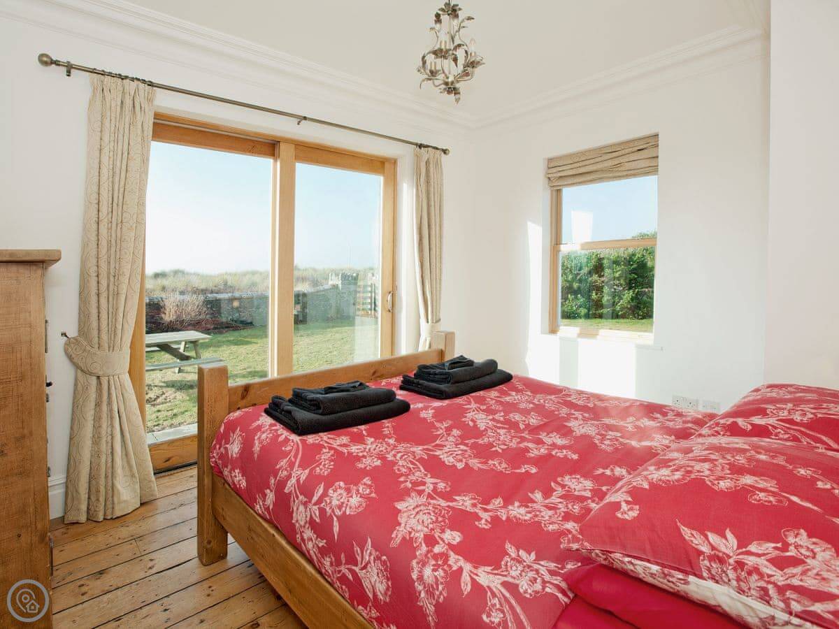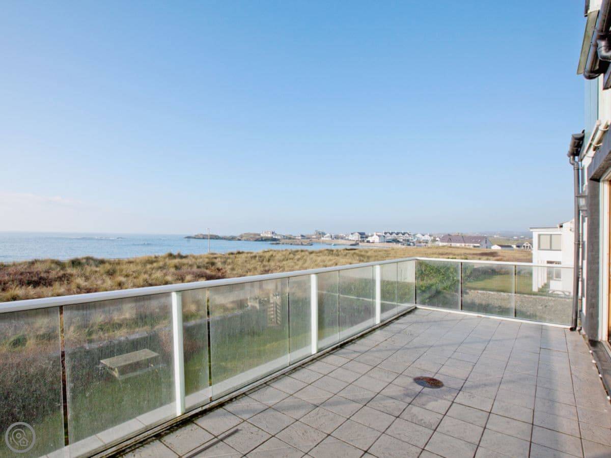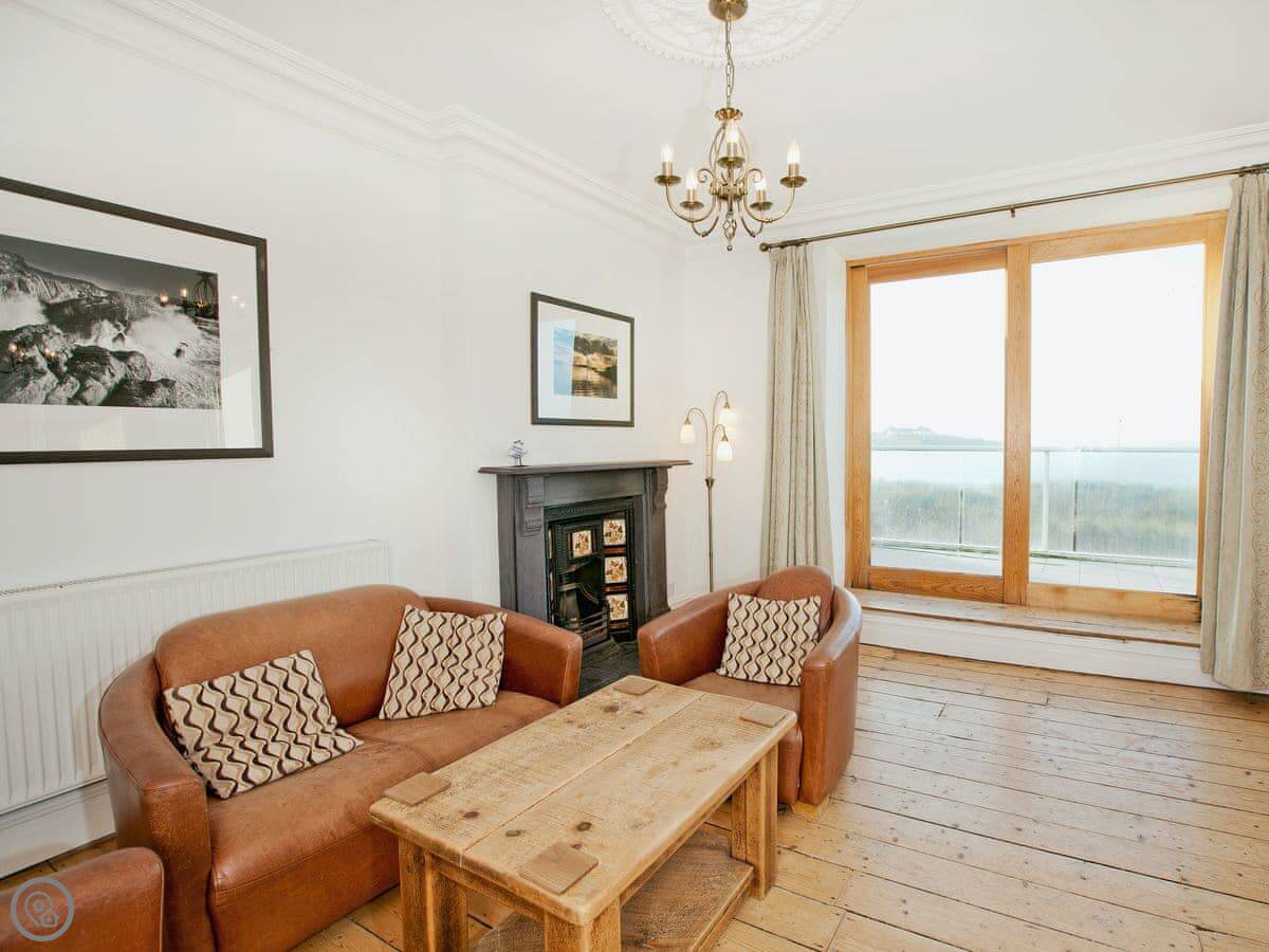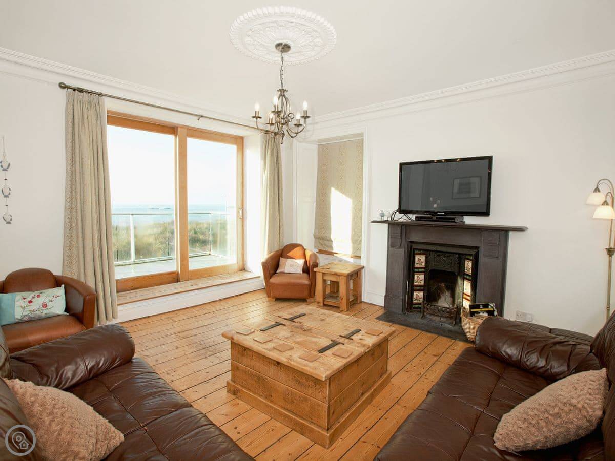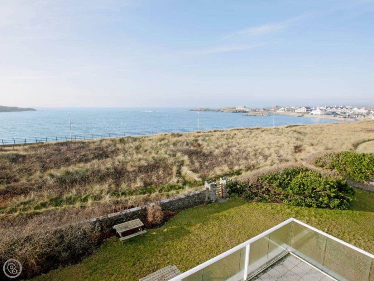 The layout is a bit different. The main living area is on the first floor. That's because it gets the view. From the living room you can go out onto a large balcony. You look right out over Trearddur Bay beach.