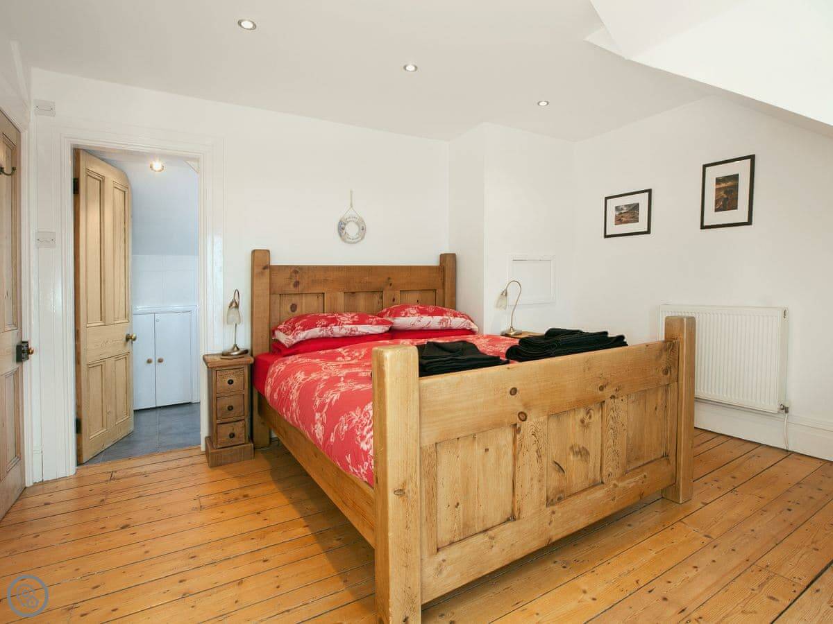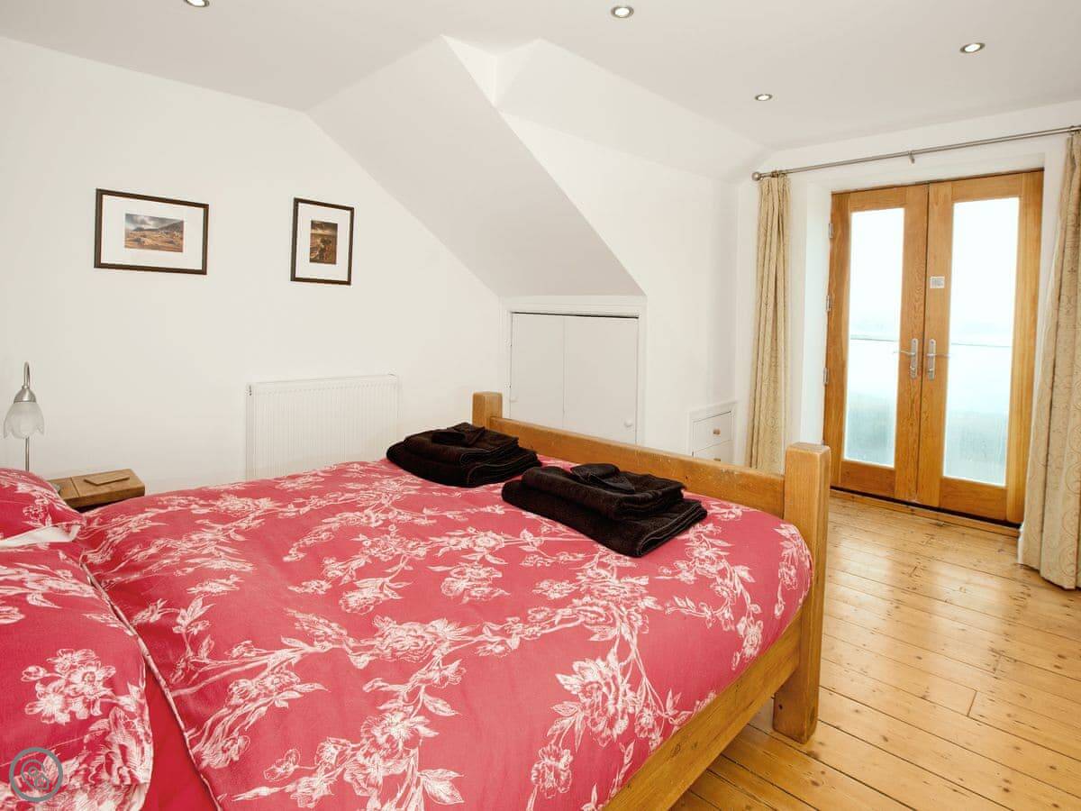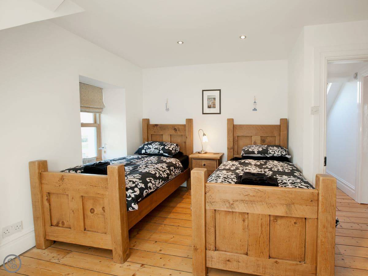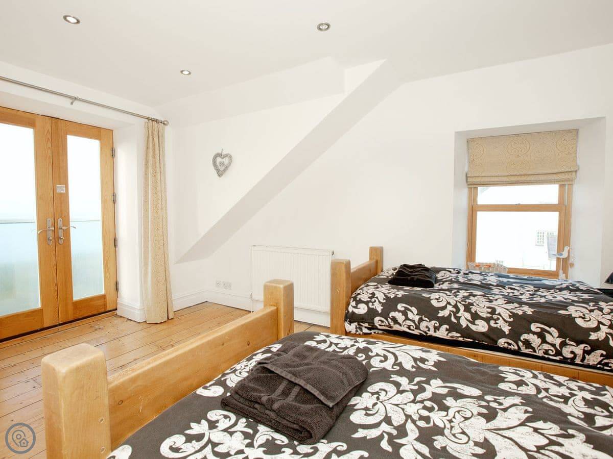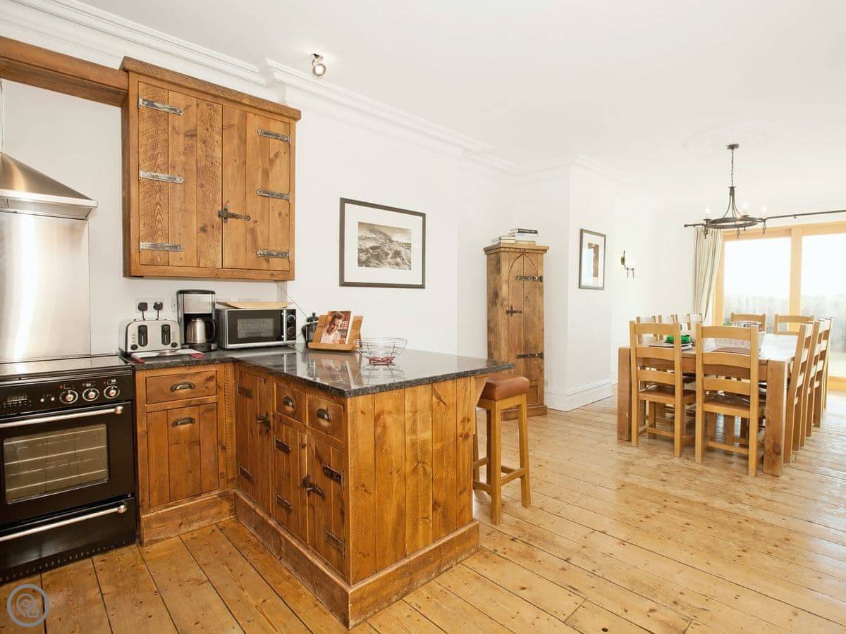 The layout is a bit different. The main living area is on the first floor. That's because it gets the view. From the living room you can go out onto a large balcony. You look right out over Trearddur Bay beach.