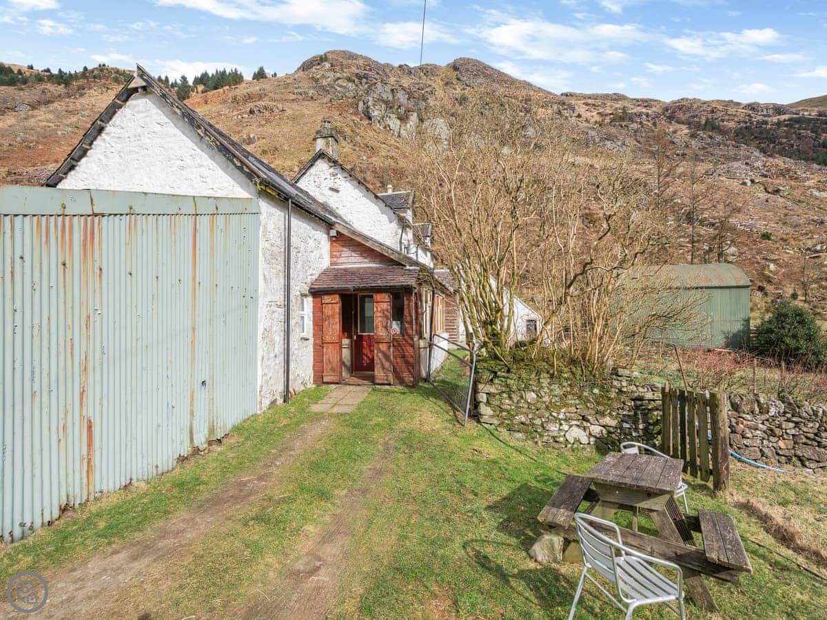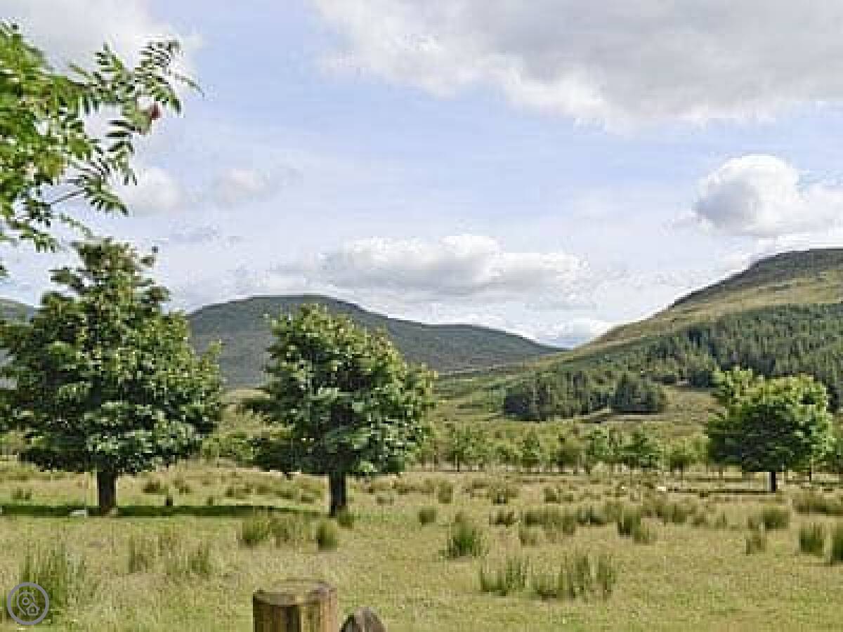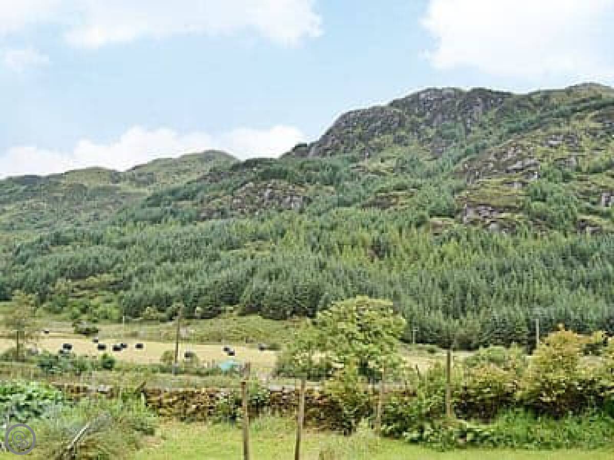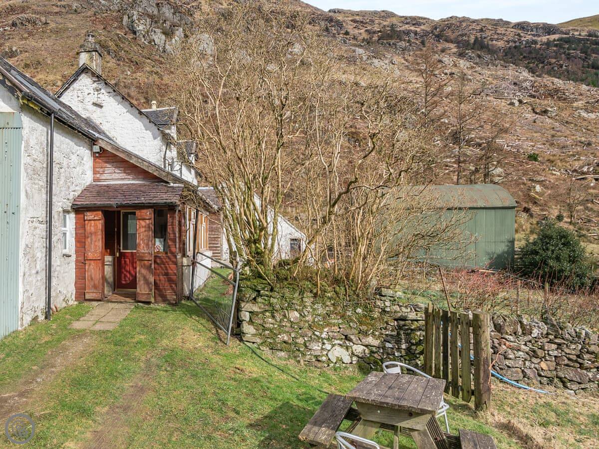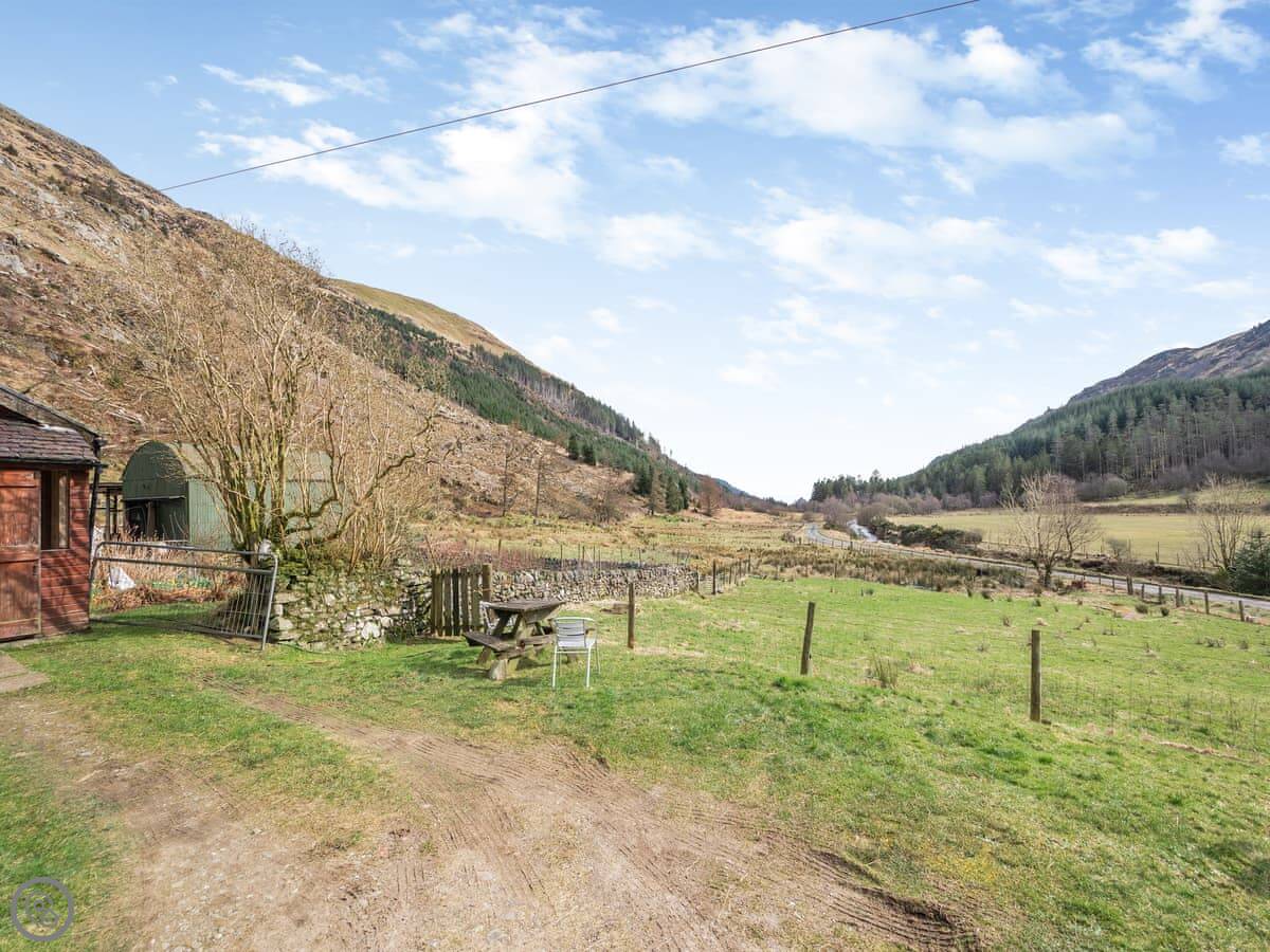 The cottage is attached to the main farmhouse on one side. You get your own front door and a bit of garden to use. It's very quiet. You're in the middle of the glen here, so it's all fields and trees around you.