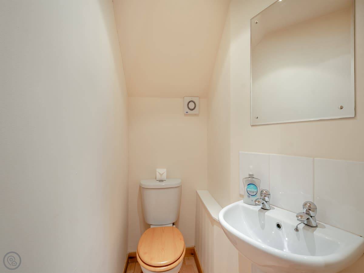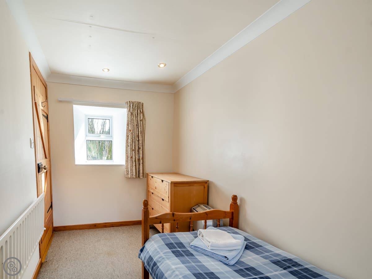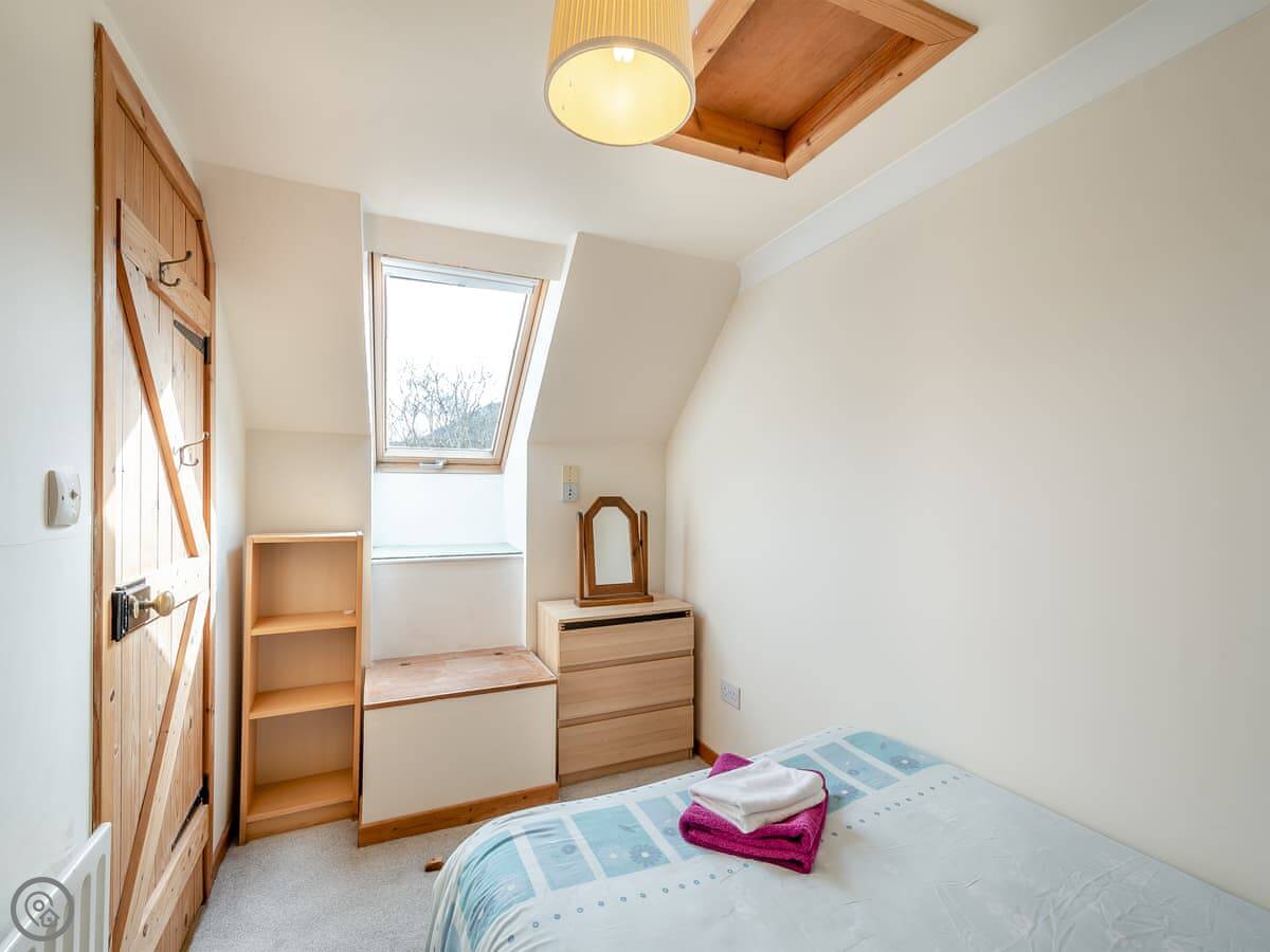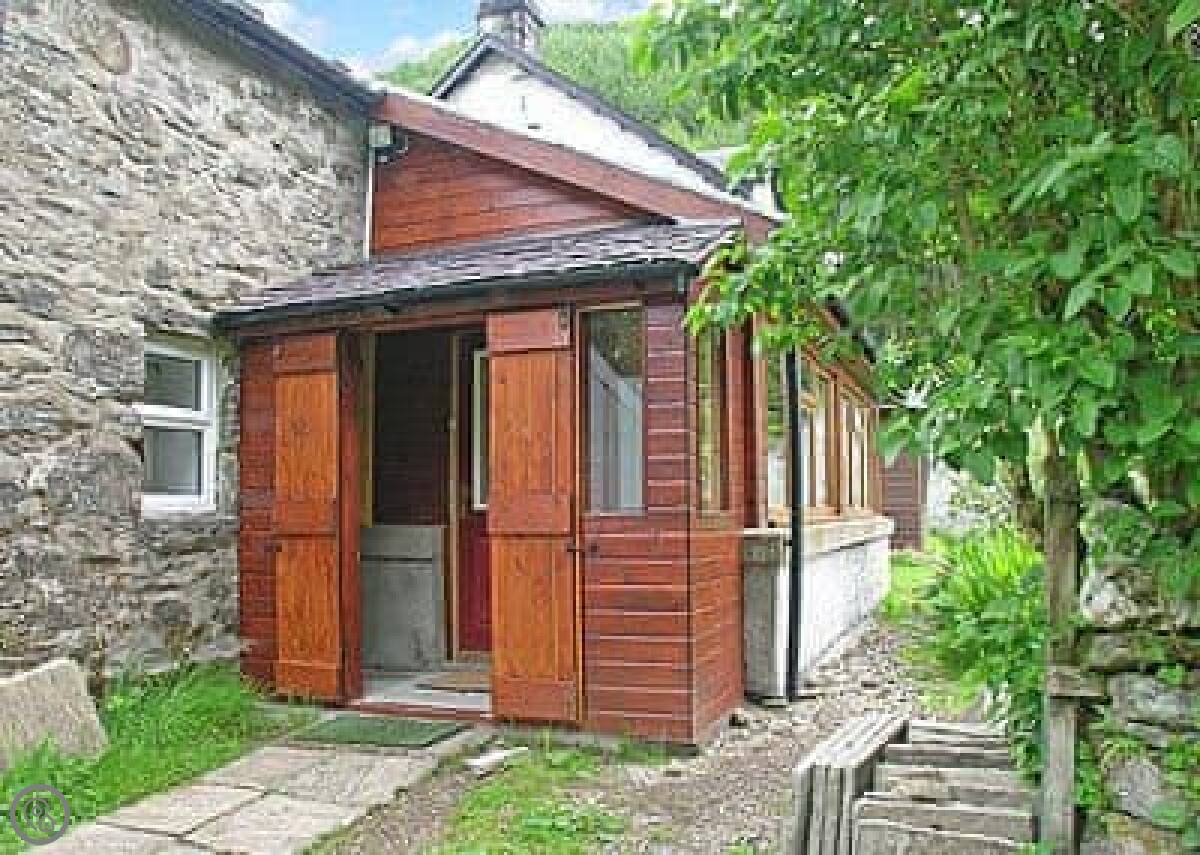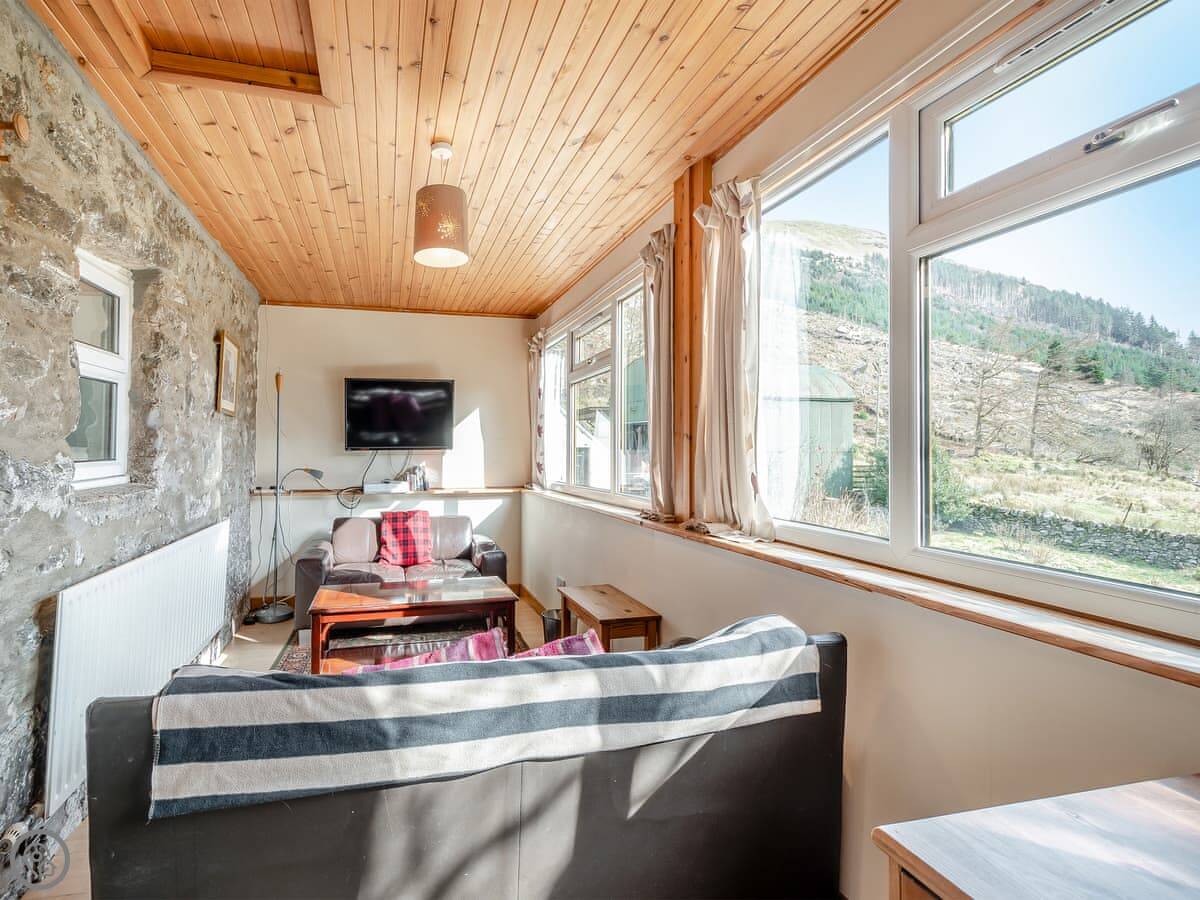The cottage is attached to the main farmhouse on one side. You get your own front door and a bit of garden to use. It's very quiet. You're in the middle of the glen here, so it's all fields and trees around you.