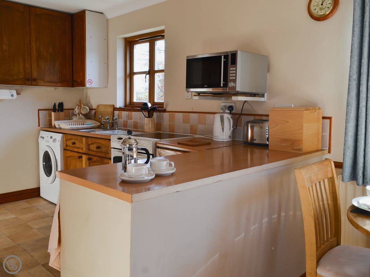 The kitchen and living area are open plan. There's a TV, a washing machine, and a highchair if you need one. You can store bikes.