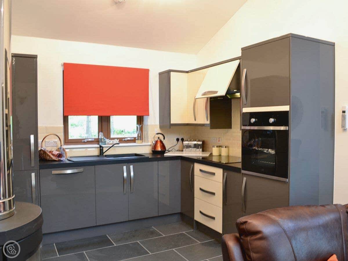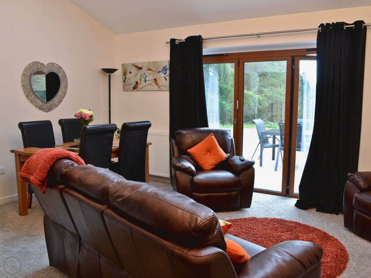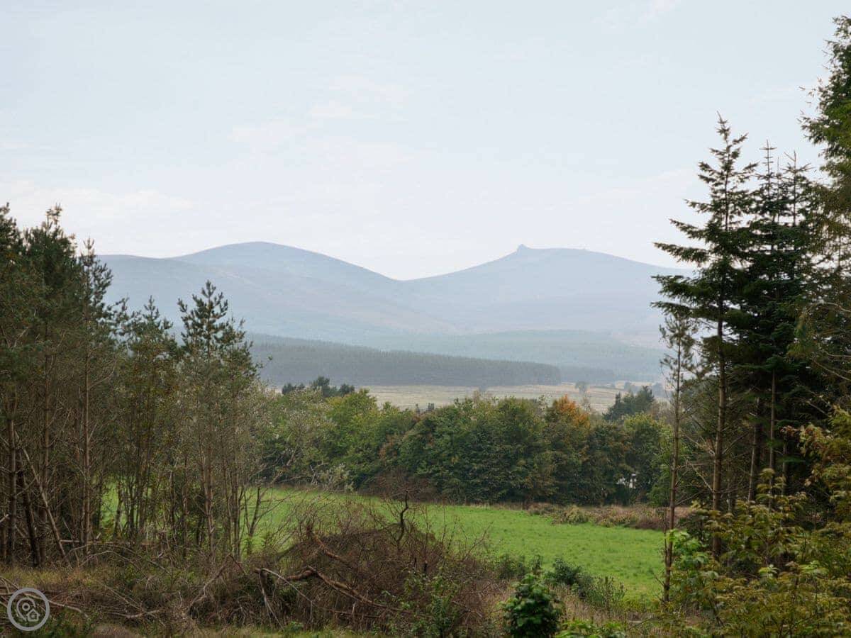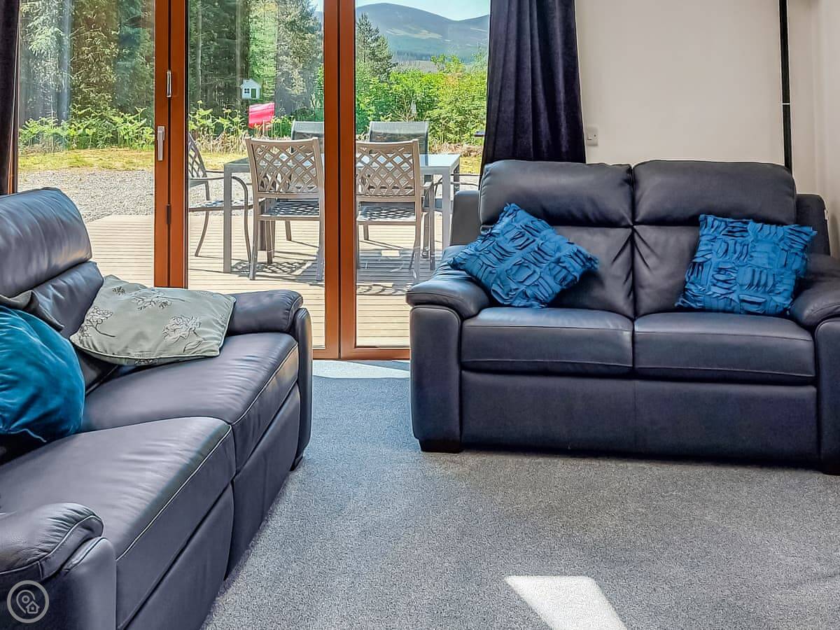 The main thing is the view. It looks straight out towards Cairn O'Mount. The living room has big doors that open up onto a deck, so you can sit outside with that view. It's an open-plan room with a high ceiling.
