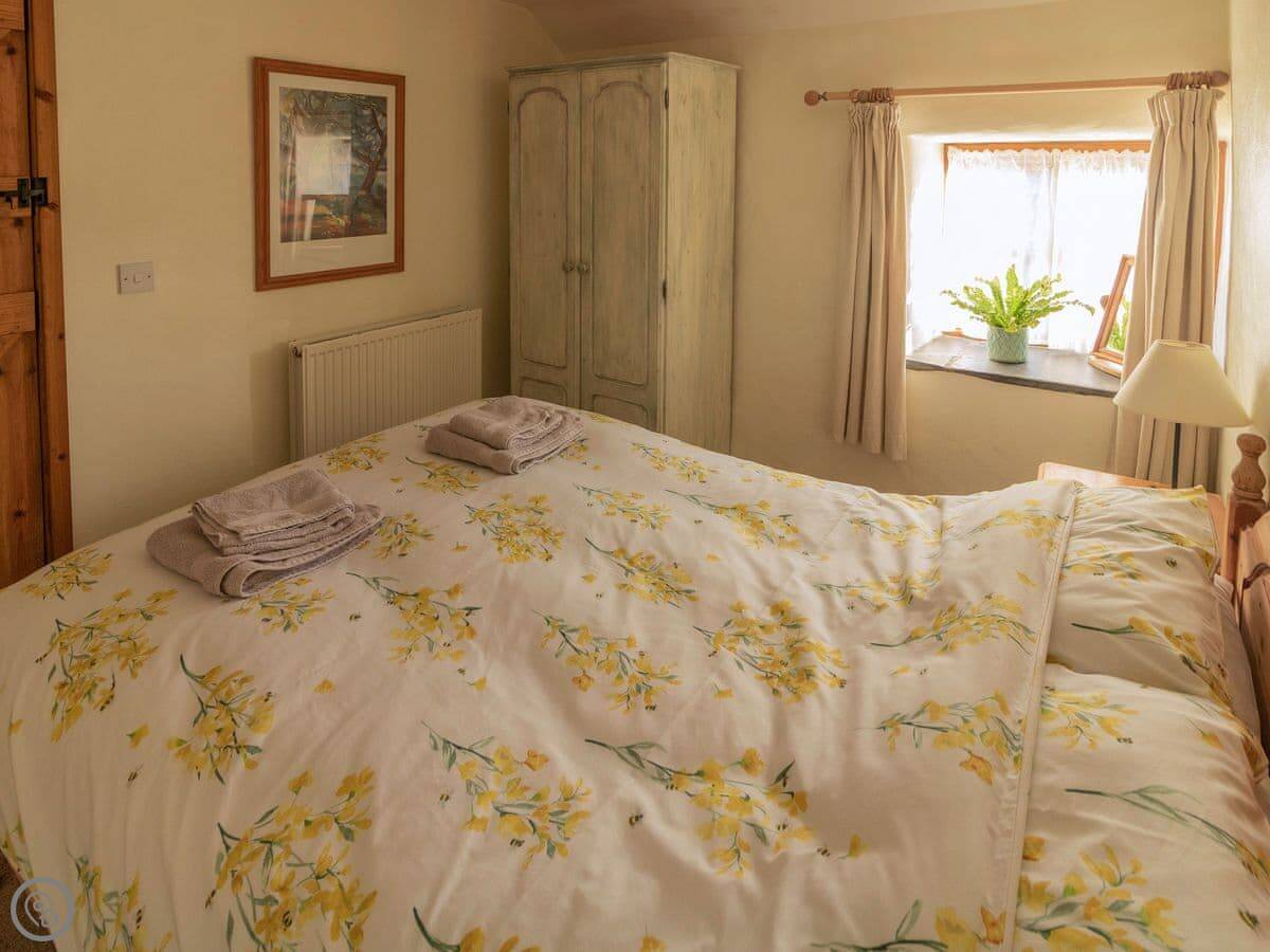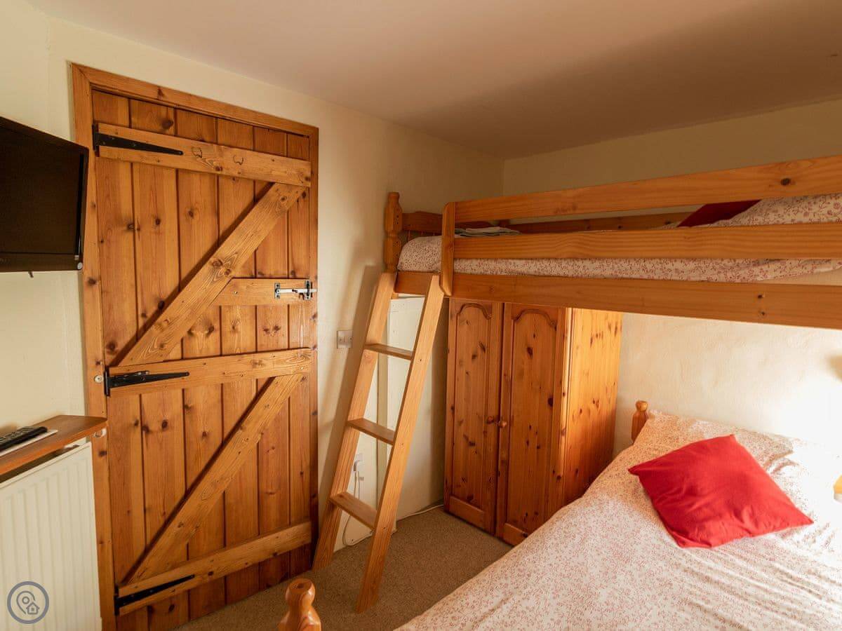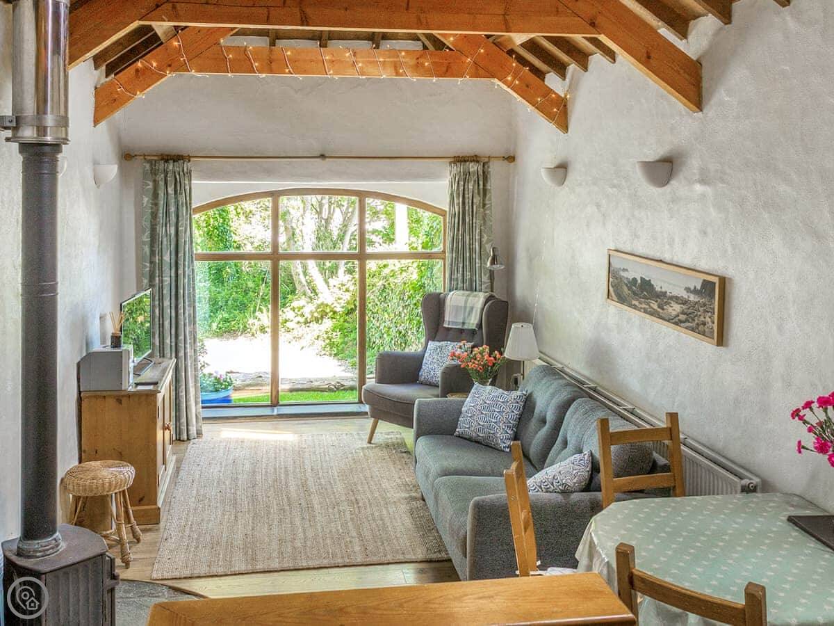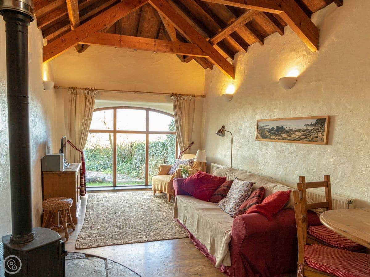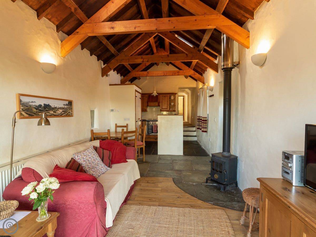 It sleeps four. Two bedrooms, one bathroom. The beds are made up for you. It's got a 4 Star rating, which means it's comfortable and has everything you need. There's a woodburning stove for colder evenings.