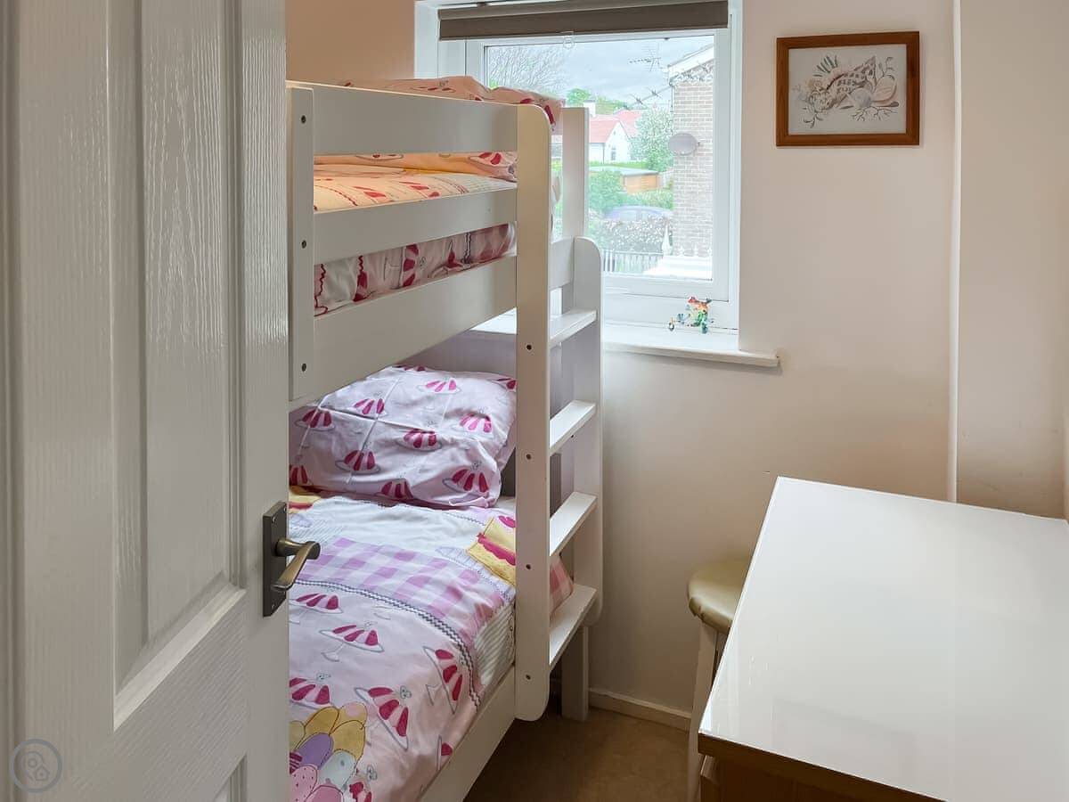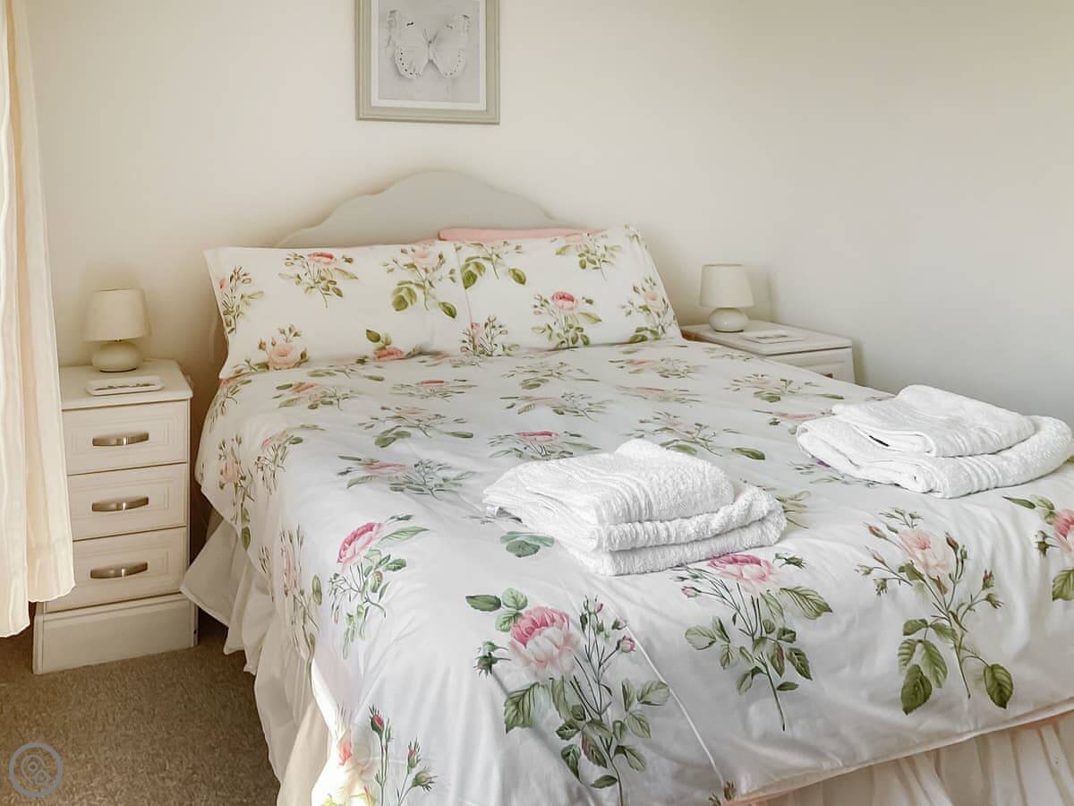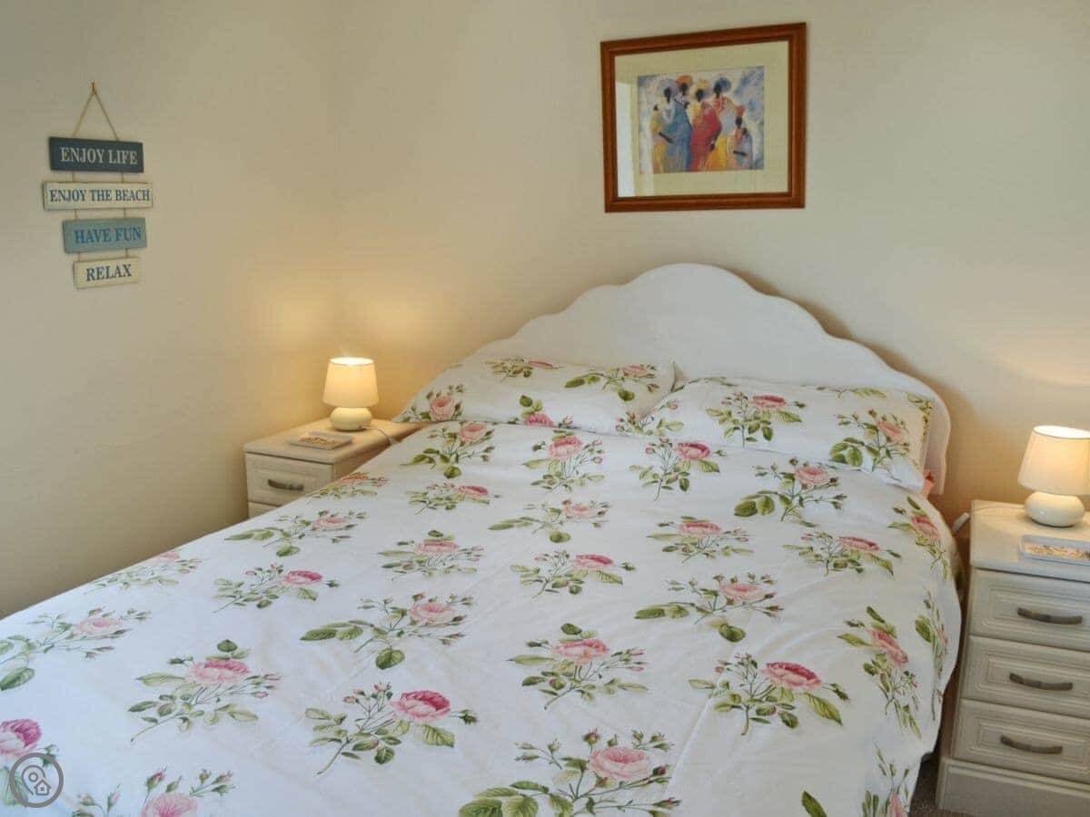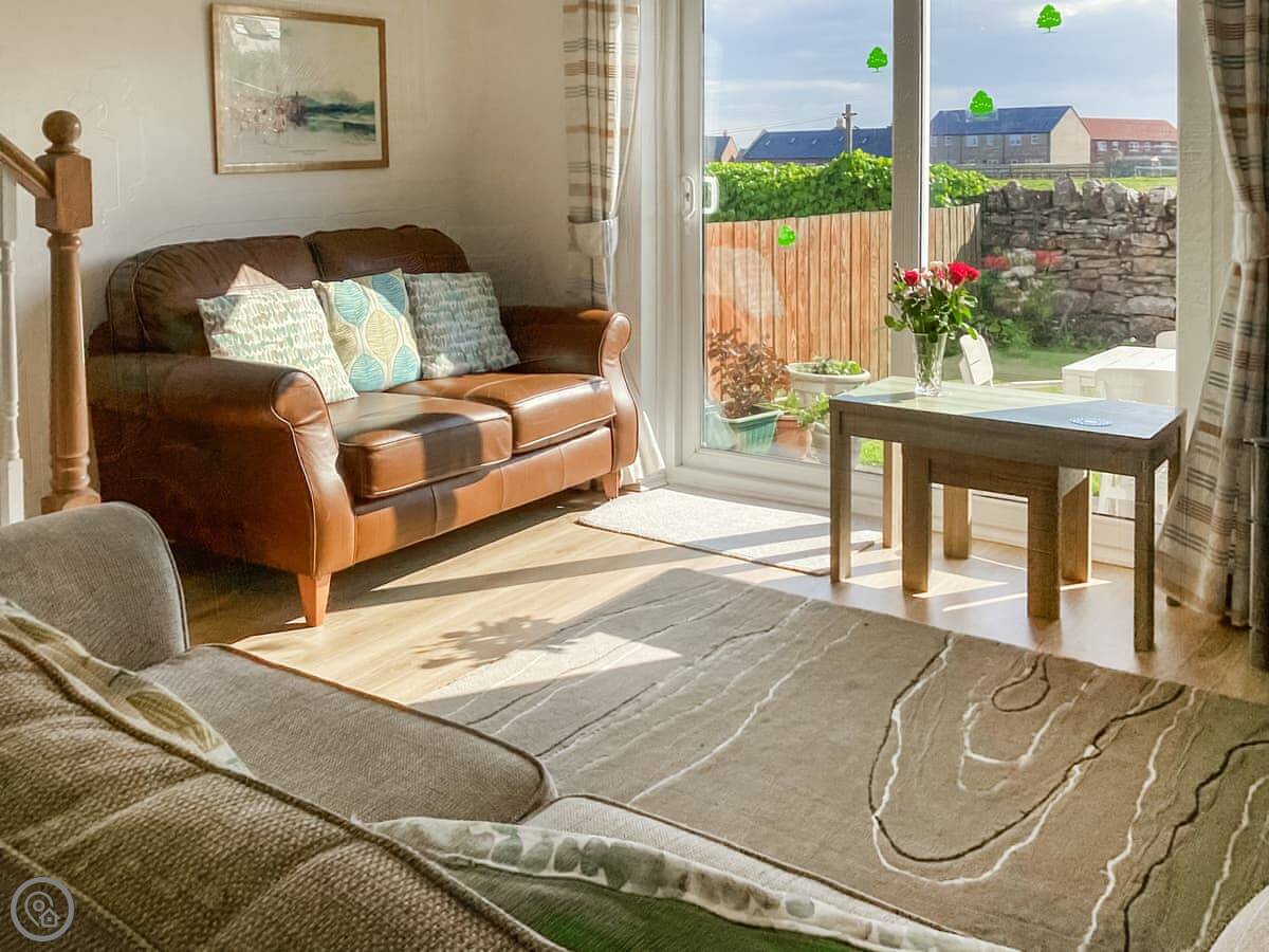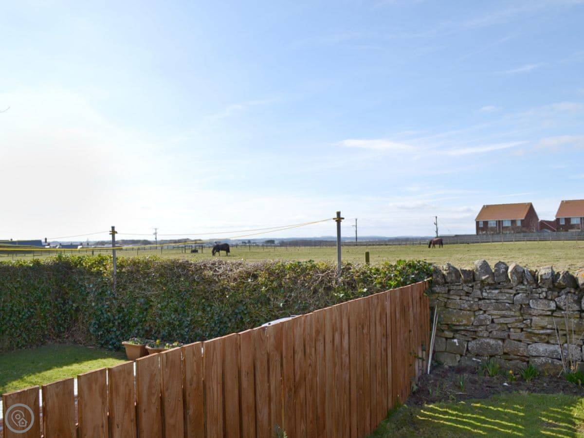 It sleeps two. Two bedrooms, one bathroom. It's got a 3 Star rating, so it's clean and comfortable but not luxury. The main thing is the view from the garden. You look over the fields to the beach. The garden itself is sunny and sheltered.