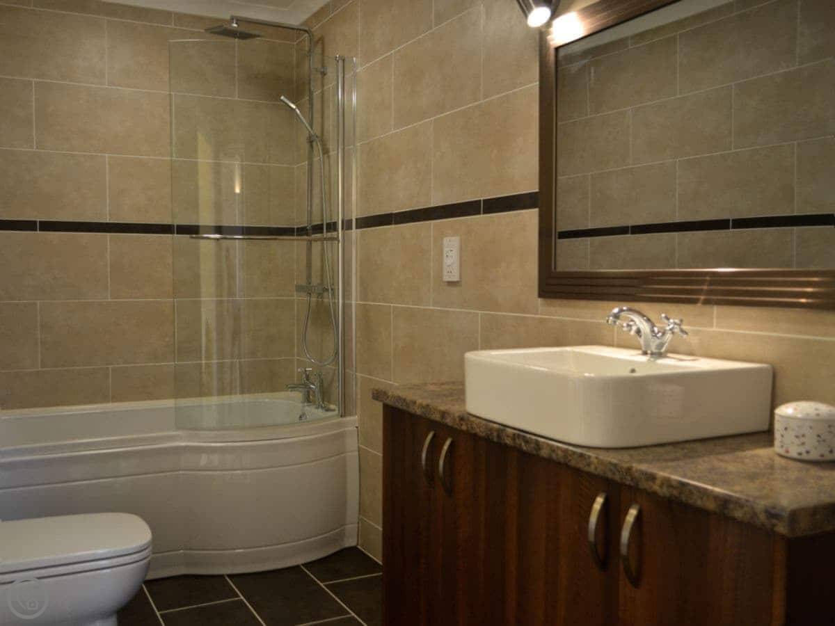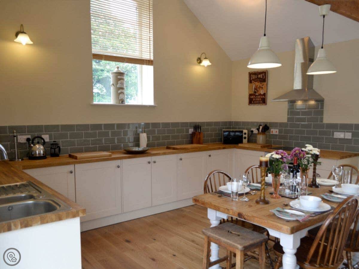 It's all on the ground floor, which they call 'ground floor facilities'. The main living area is open plan, kitchen, dining, sitting room. The floor is stone. There's underfloor heating. It's wheelchair accessible at the entrance and inside, and both bathrooms have walk-in showers.