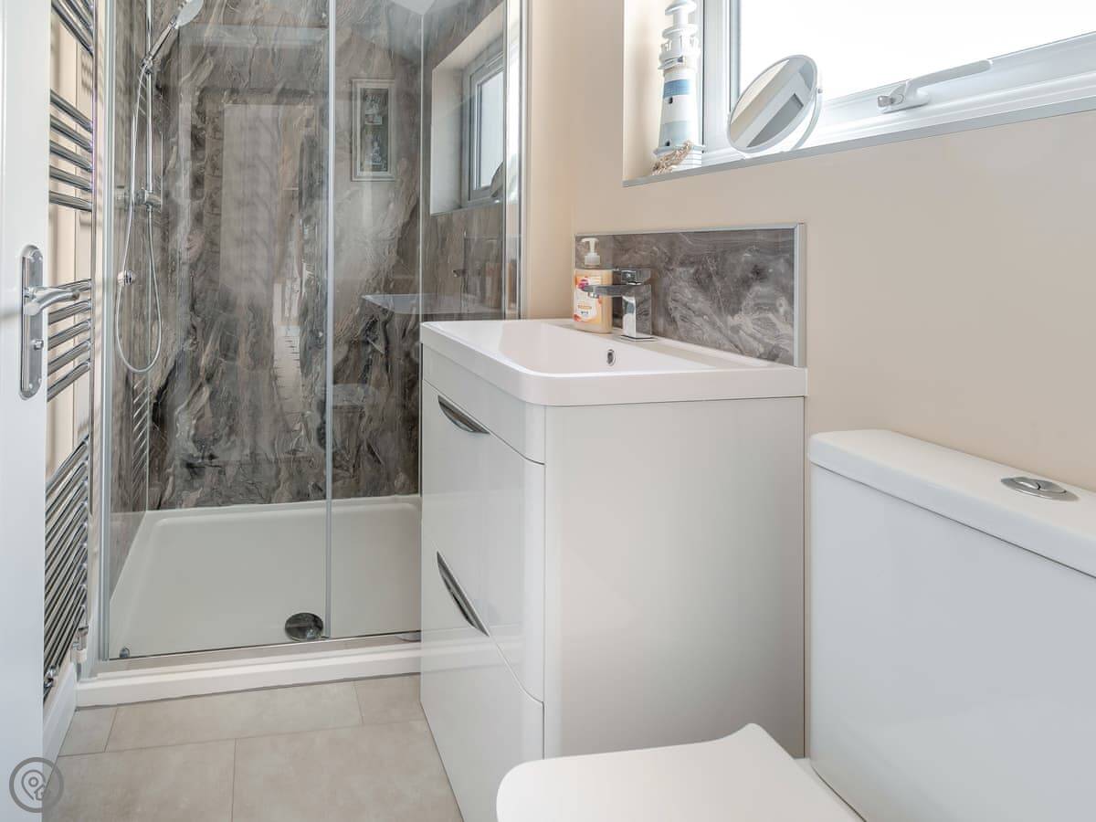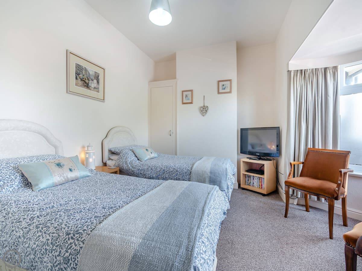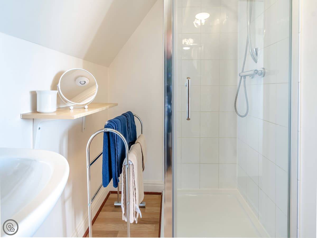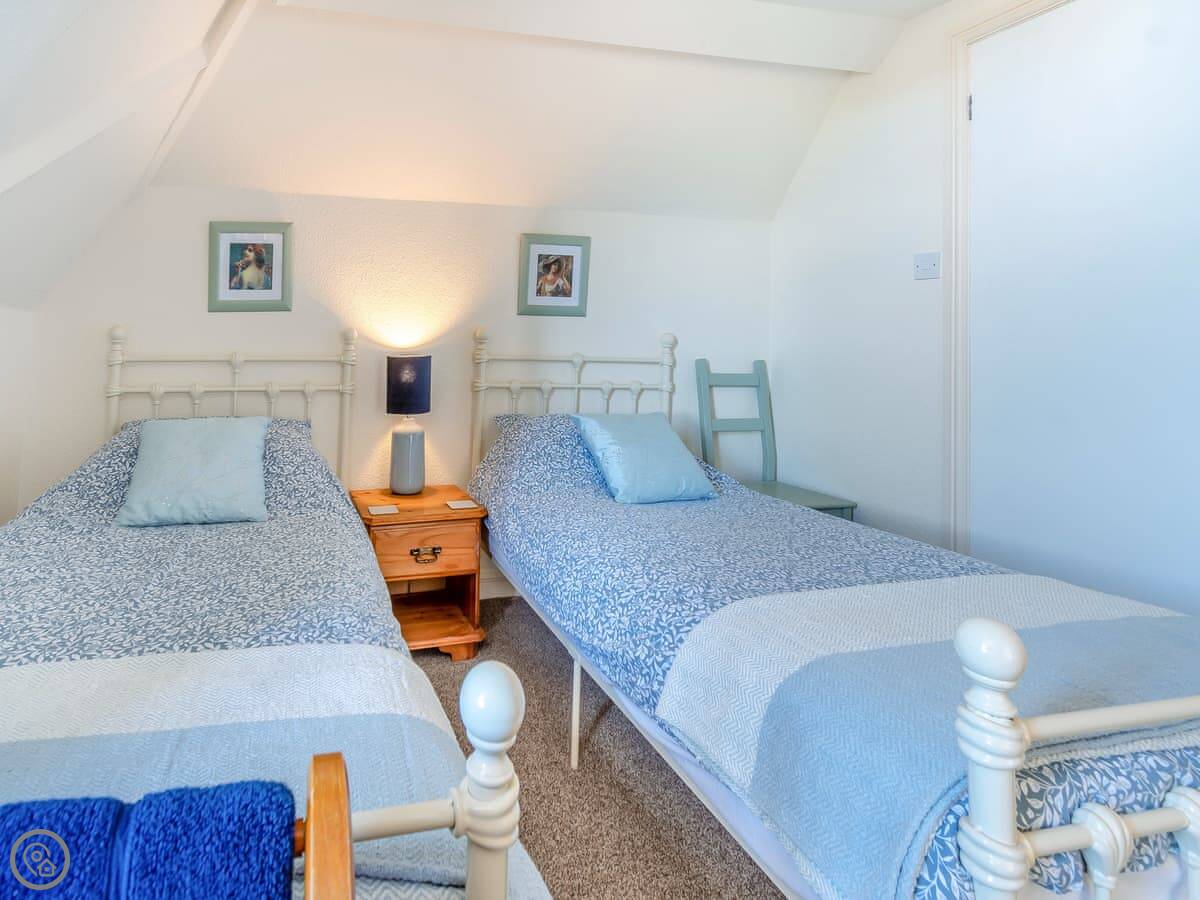 It sleeps six. Three bedrooms, with two bathrooms. One's an ensuite. It's got a 4 Star rating, so it's well-equipped and comfortable. It's a dormer, so the ceilings in the two front bedrooms slope quite a bit. You get used to it.