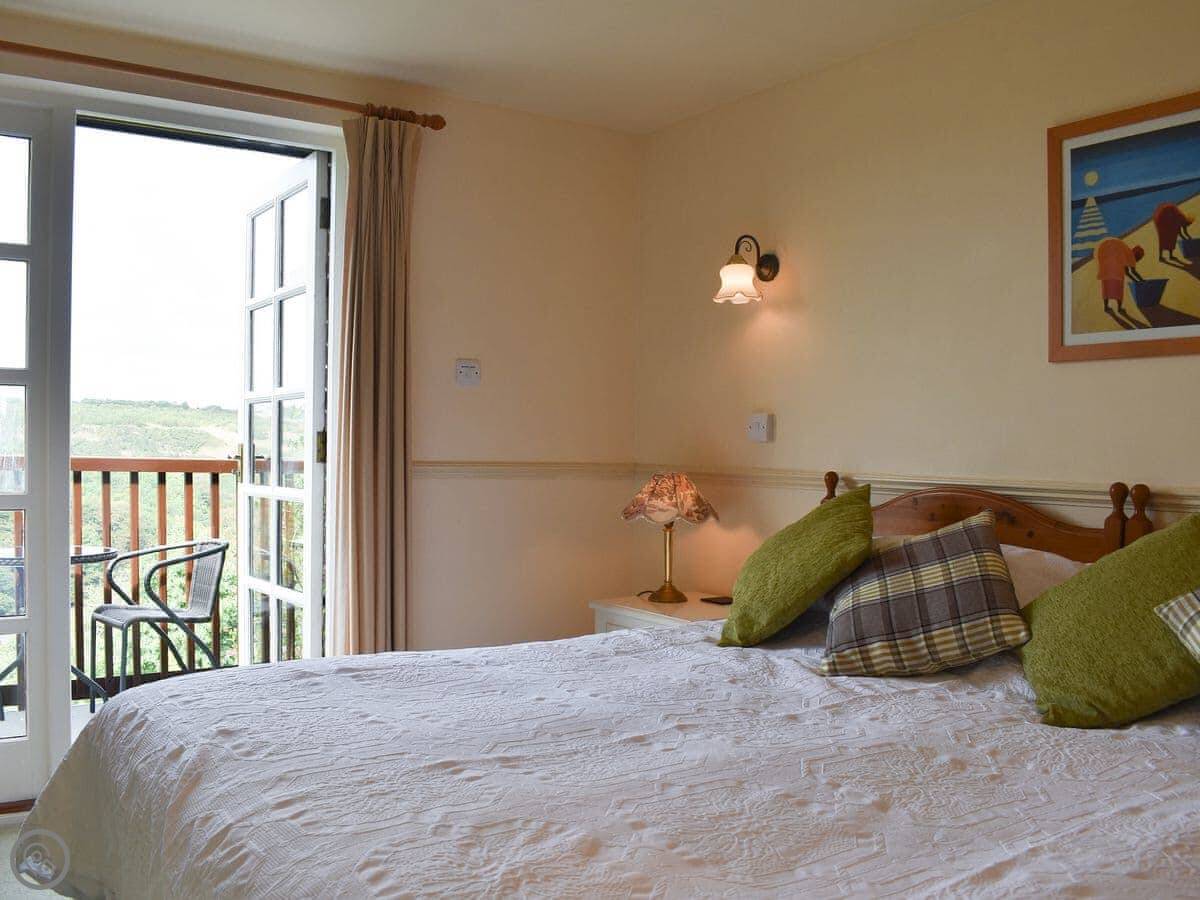 It's a one-bedroom place, sleeps two. The bedroom has its own bathroom and doors that open onto a little balcony. The main room has French doors that go out to a patio area. It's got a 4 Star rating, so it's comfortable and well-equipped.