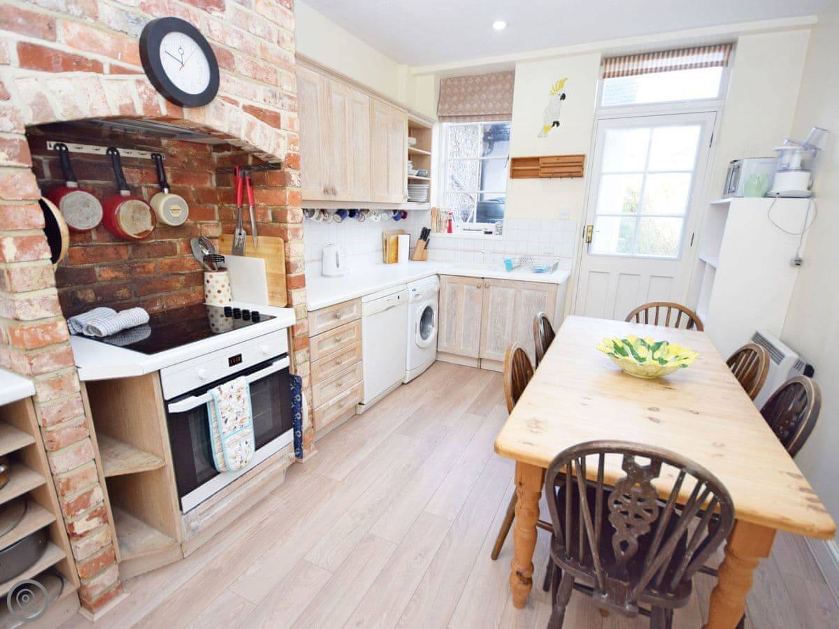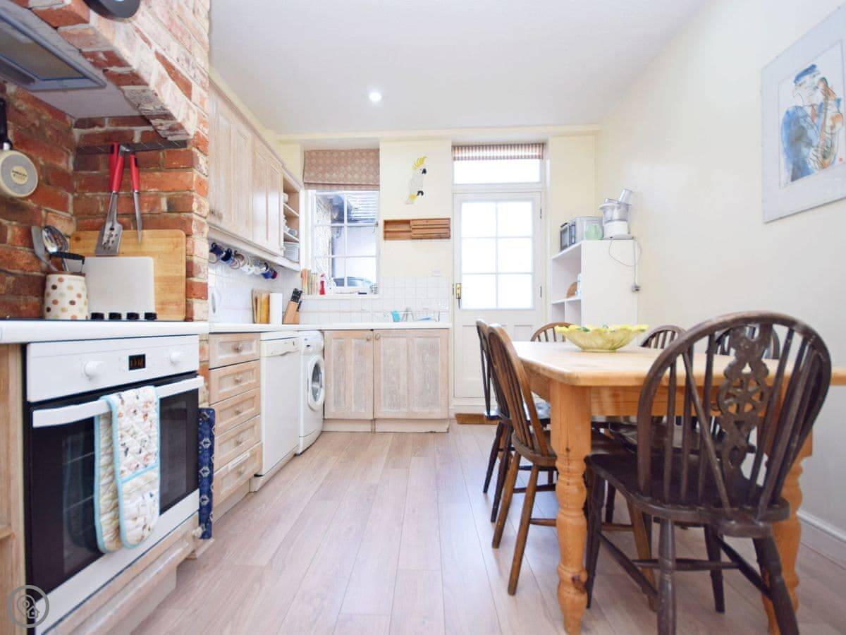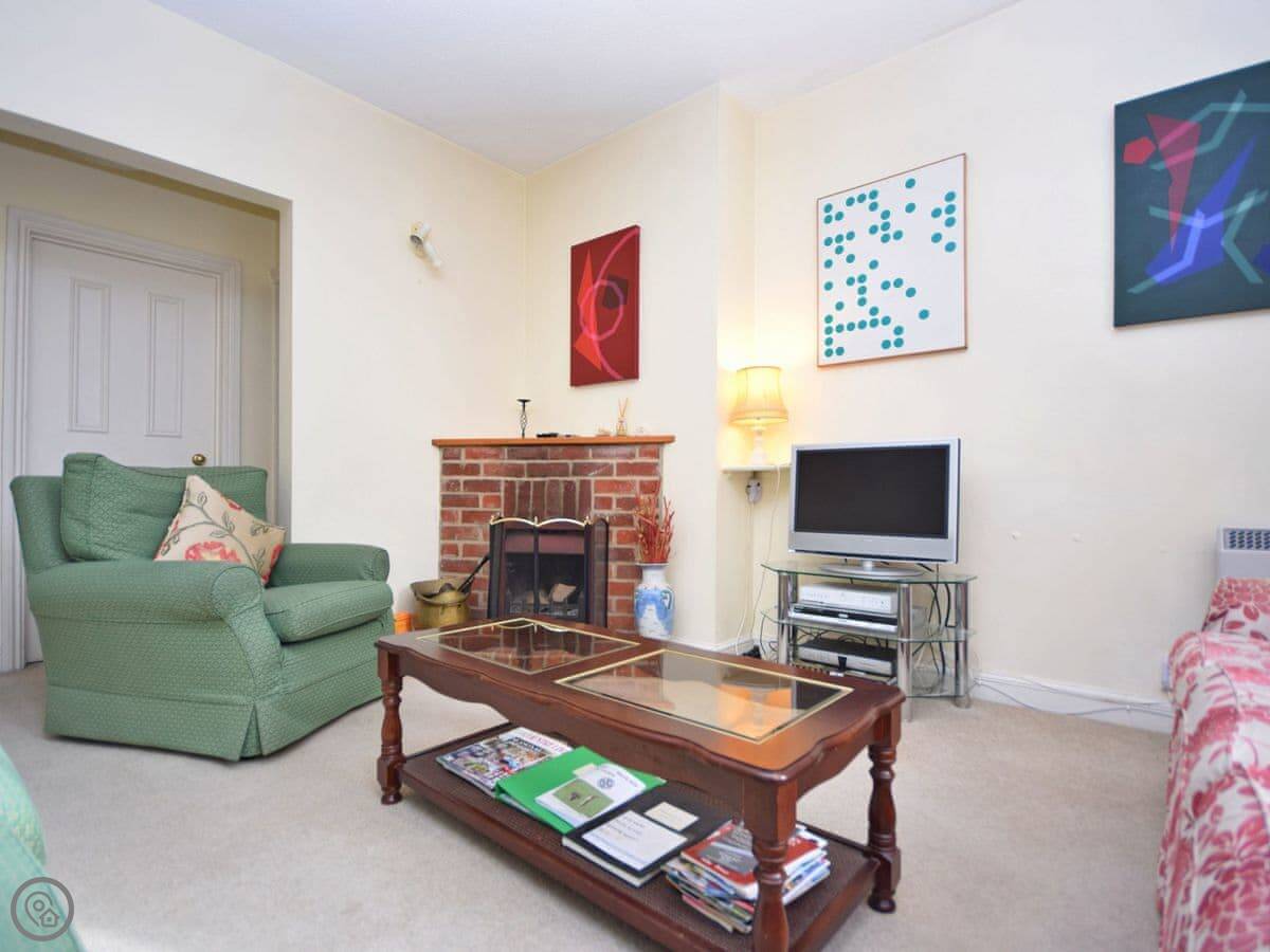 The living room has an open fire. The kitchen has what you need. The garden faces south, so it gets the sun. There’s a patio with a table and a barbecue. The garden is enclosed. You get one parking space.