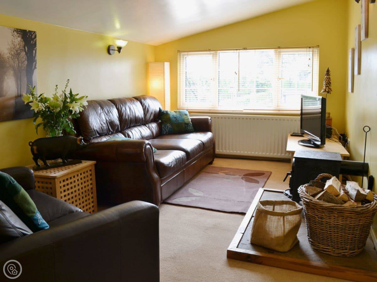 The place is fairly straightforward inside. There's a main living room and a smaller second sitting room too, so people can spread out. There's a wood burner. The decking outside looks onto some woodland. You get all sorts of birds coming through.