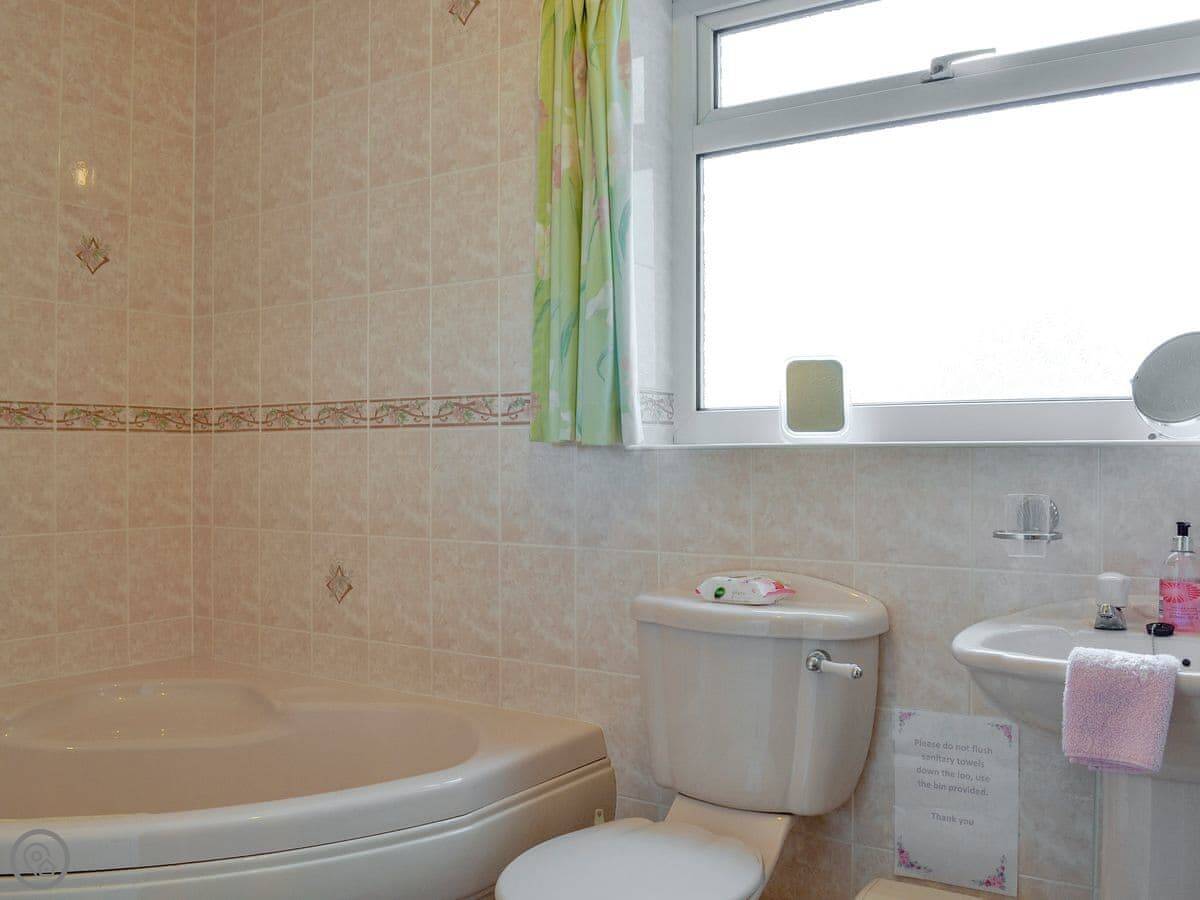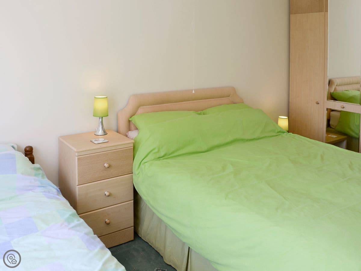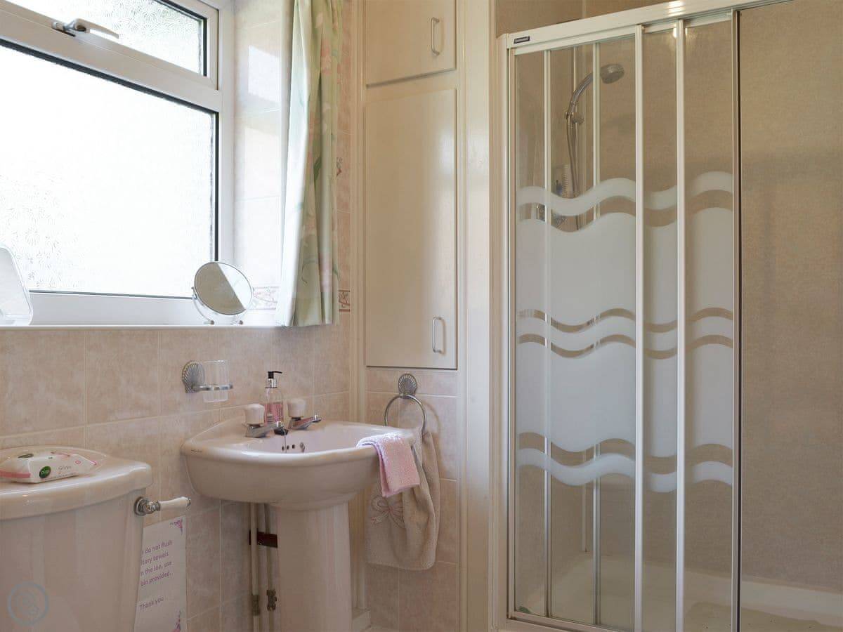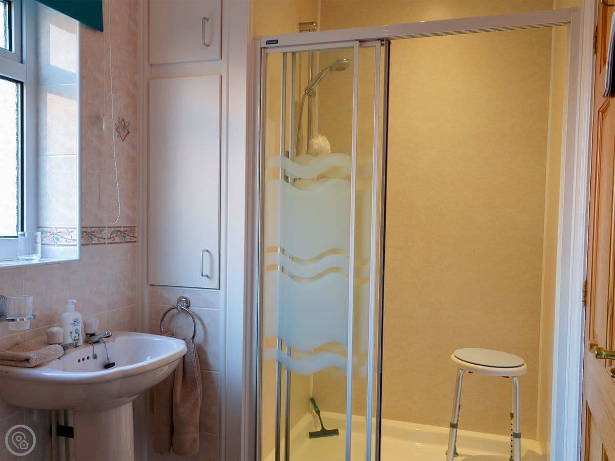 It sleeps five, which is two bedrooms really. One has a double bed, the other has a single and some bunk beds. There's one bathroom with a shower over the bath. There's a grab rail and a seat in there.