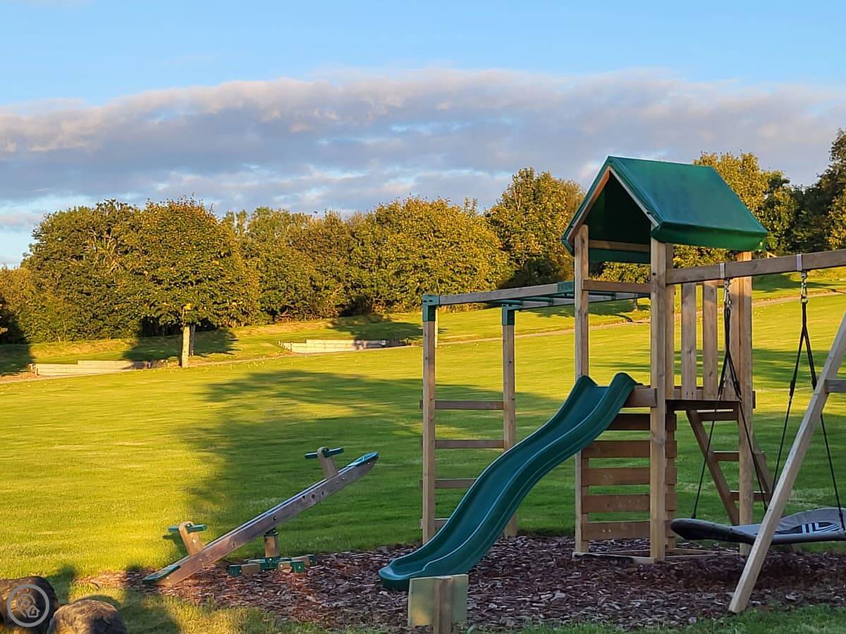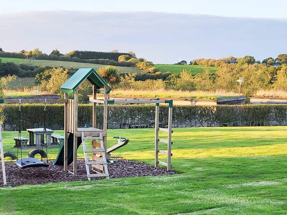 The lodge is built with a grass roof and is meant to be eco-friendly. It's all very modern inside, open plan. The owners have about 19 acres here. There are a couple of fishing lakes if you're into that, and some nature walks marked out. There's a play area for kids with a boat thing.