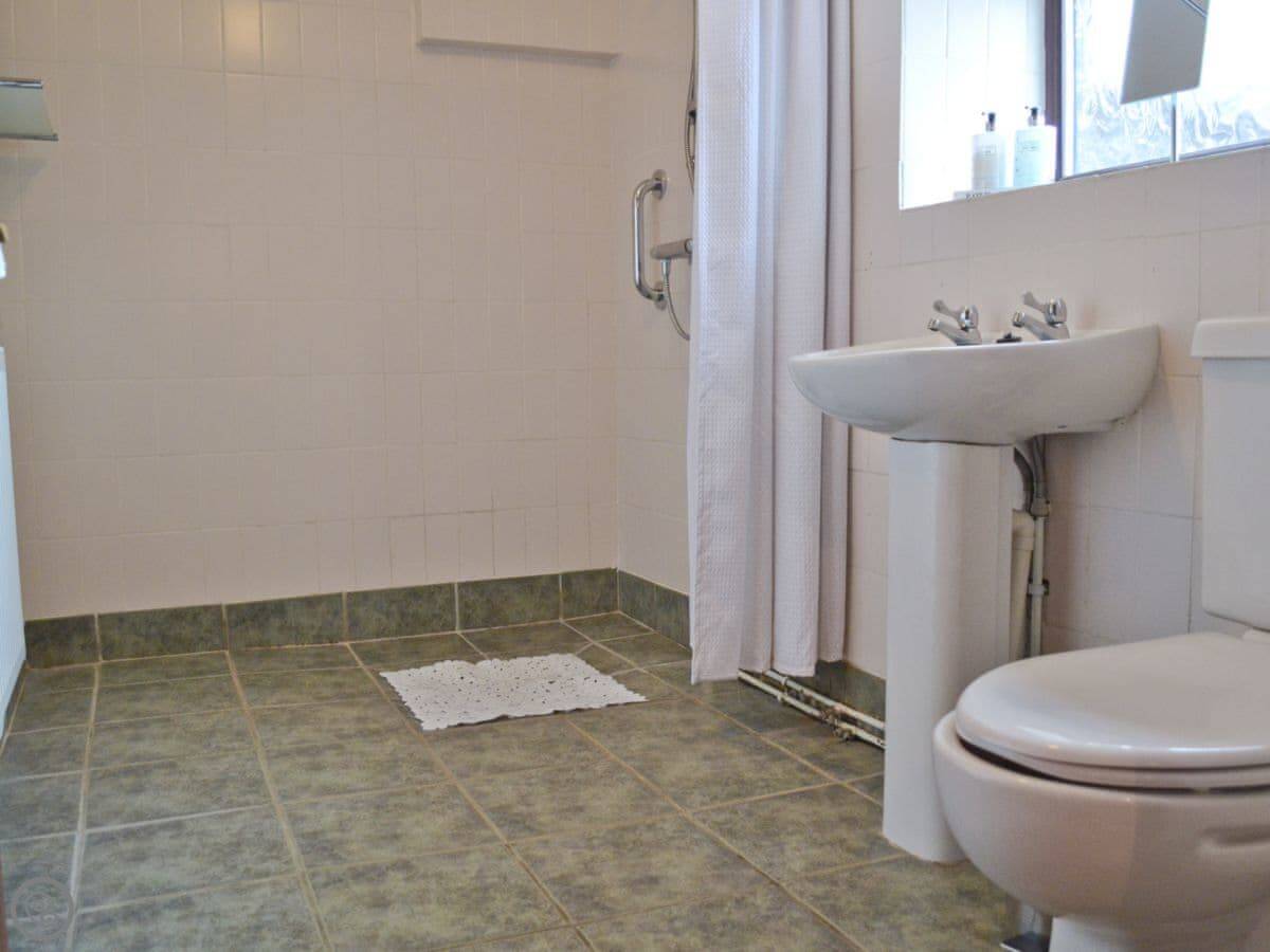 It sleeps four. Two bedrooms, one bathroom. The bedroom and bathroom are on the ground floor and the layout is wheelchair accessible. There's a wet room with a walk in shower and grab rails. The stairs up to the living area are there, but they're internal and quite steep. There's parking right outside.