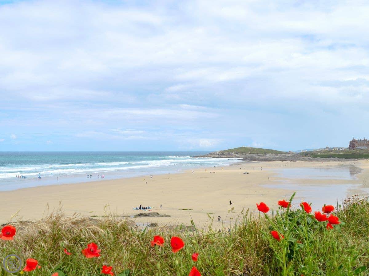Fistral Beach is just across the road. It's about a three minute walk. The beach is good for surfing, or just walking. The golf course is right next to it. Rick Stein's fish and chip shop is down there too, by the beach.