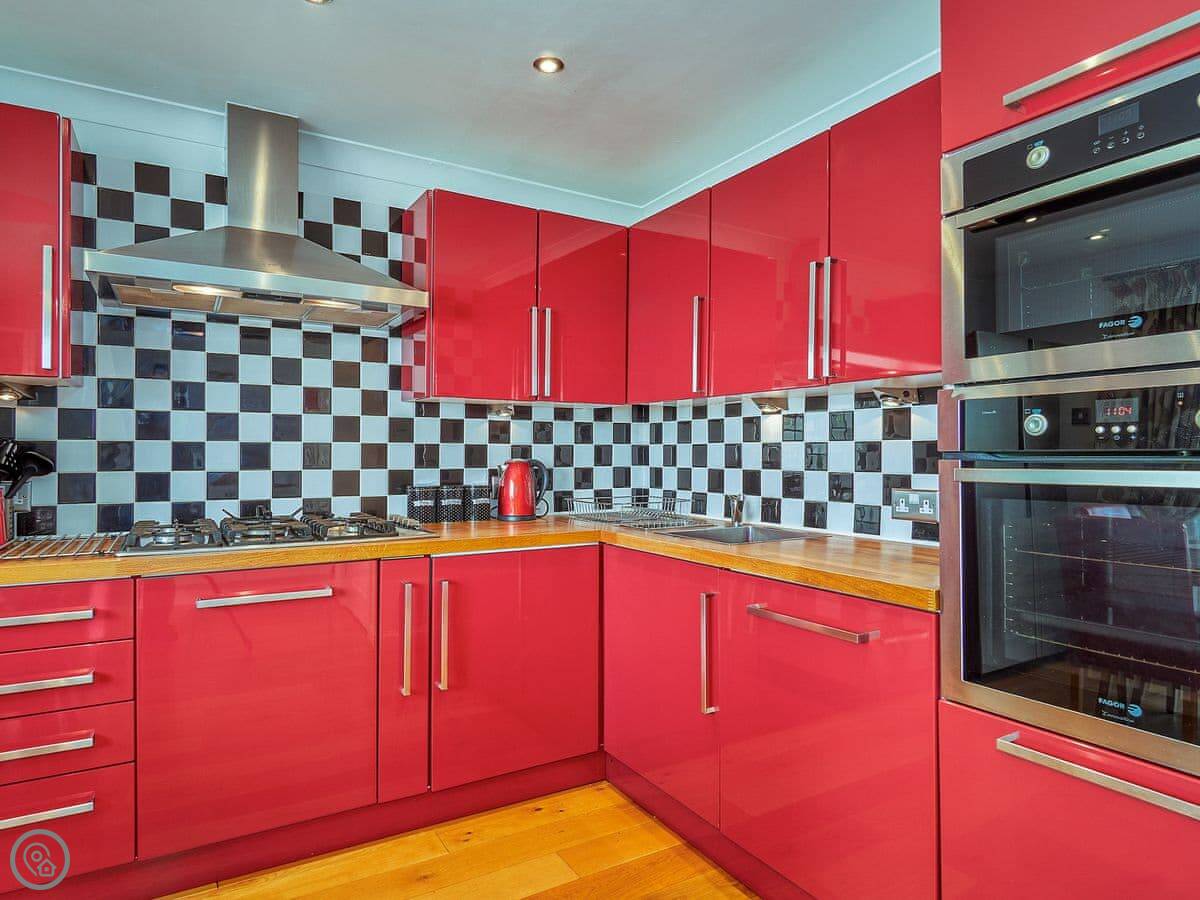 It sleeps eight over five bedrooms. There are three bathrooms. One is attached to the main bedroom. It's a 4 Star place, so it's well-equipped and modern. The kitchen is quite bright.