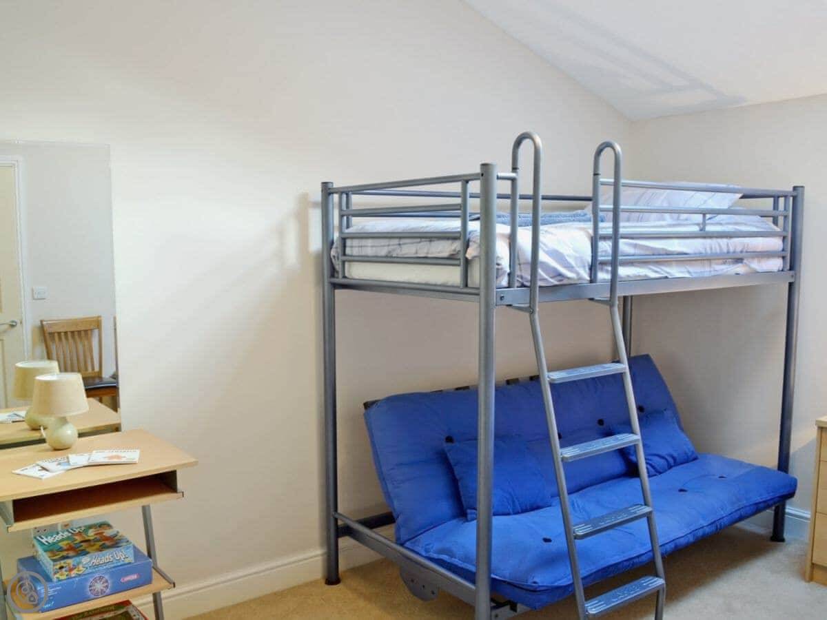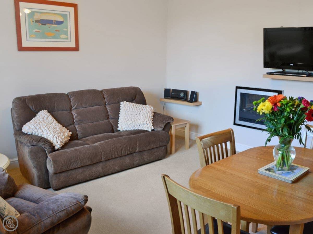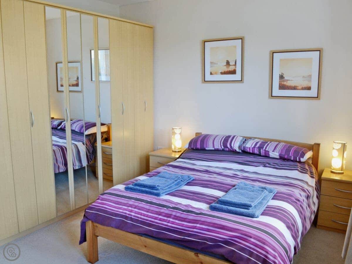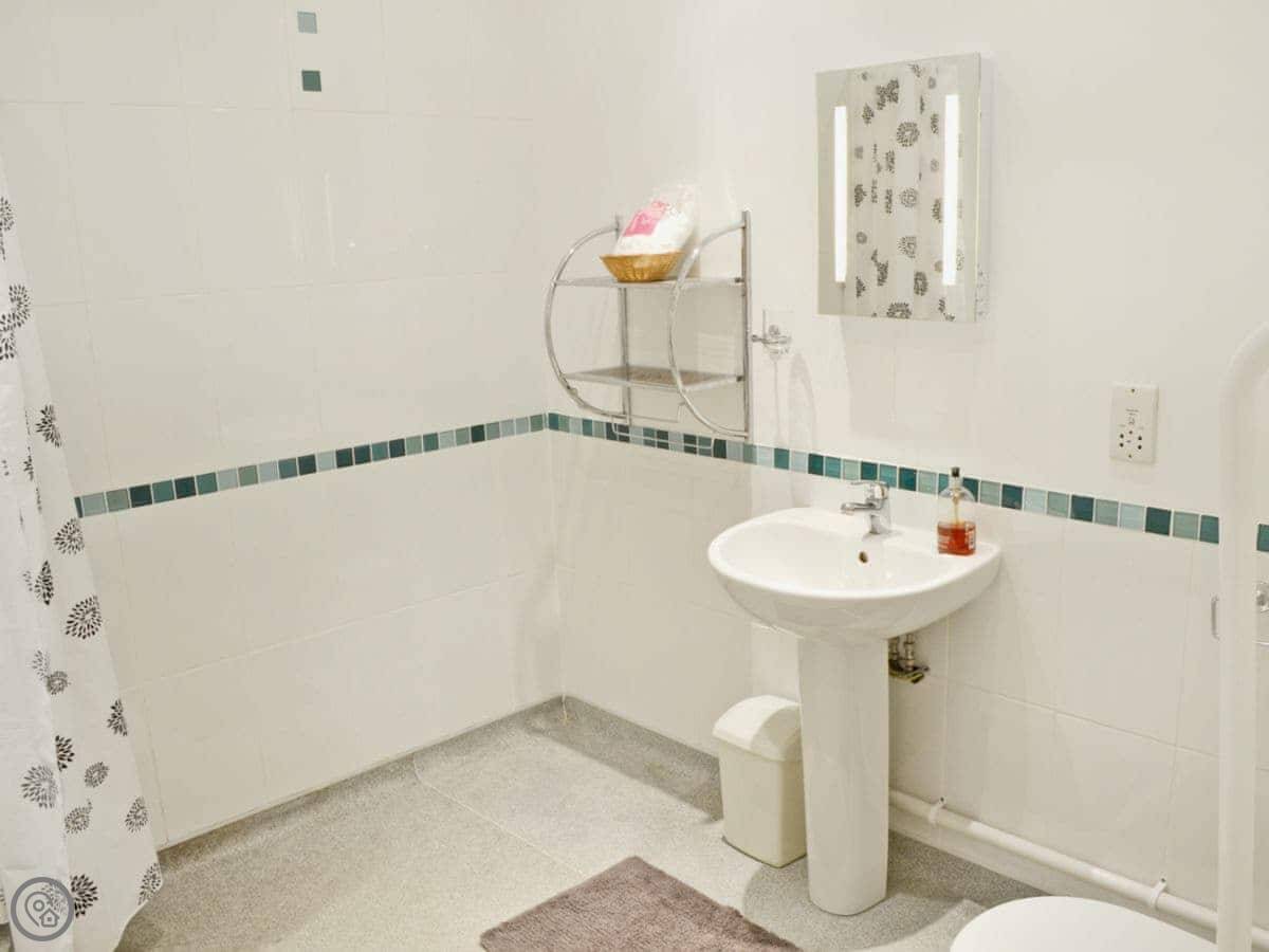 It sleeps five in two bedrooms. There's one bathroom, which is a wet room on the ground floor. It has a 4 Star rating. The whole place is wheelchair accessible, with ramps, wide doors, and grab rails in the wet room.