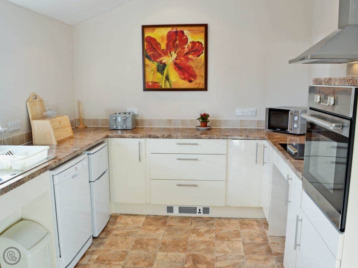 There’s a kids' play area on site. The facilities list is accurate: it's got a dishwasher, washing machine, WiFi, TV, and an electric vehicle charger. Bedding and towels are included. You can borrow a cot and highchair. No pets, sorry.