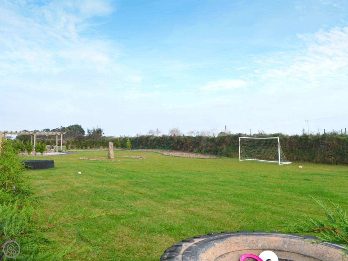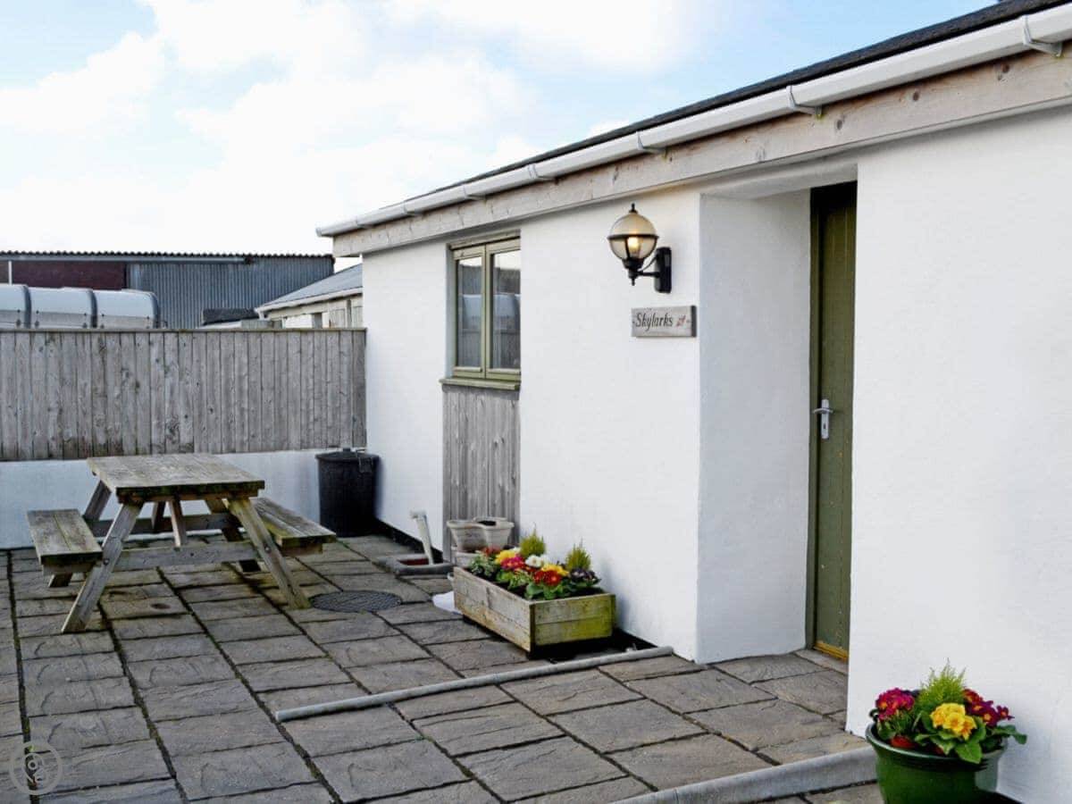 Skylarks is in Porthtowan, Cornwall. It's a bungalow on a smallholding, so there are some fields with animals around. You get a decent sized garden and patio to yourselves. The view is over National Trust land towards the sea.