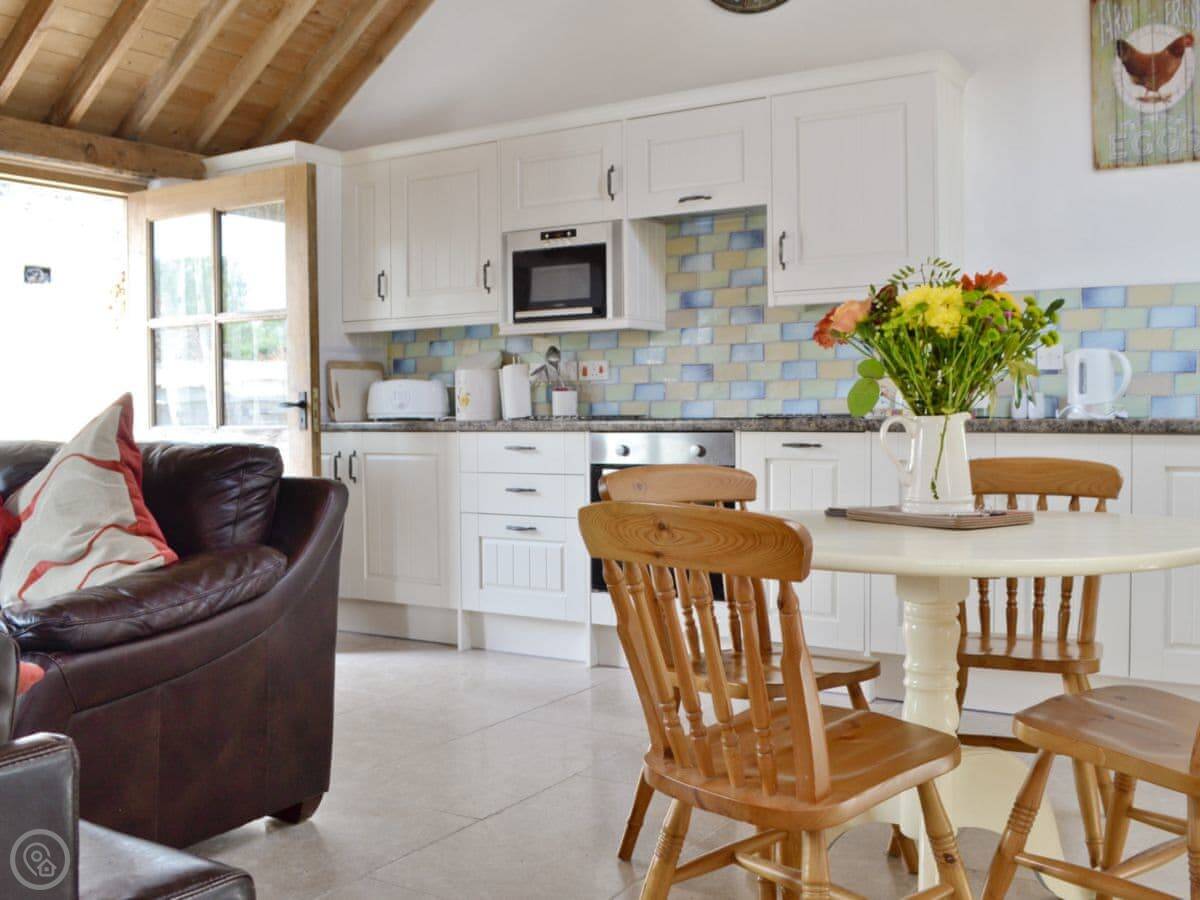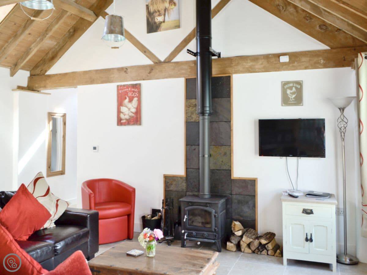 The facilities are what you'd expect. There's a woodburning stove, which we'll leave you some logs for. WiFi, TV, dishwasher, washing machine. Bedding and towels are included. You can bring one dog. There's parking right outside.