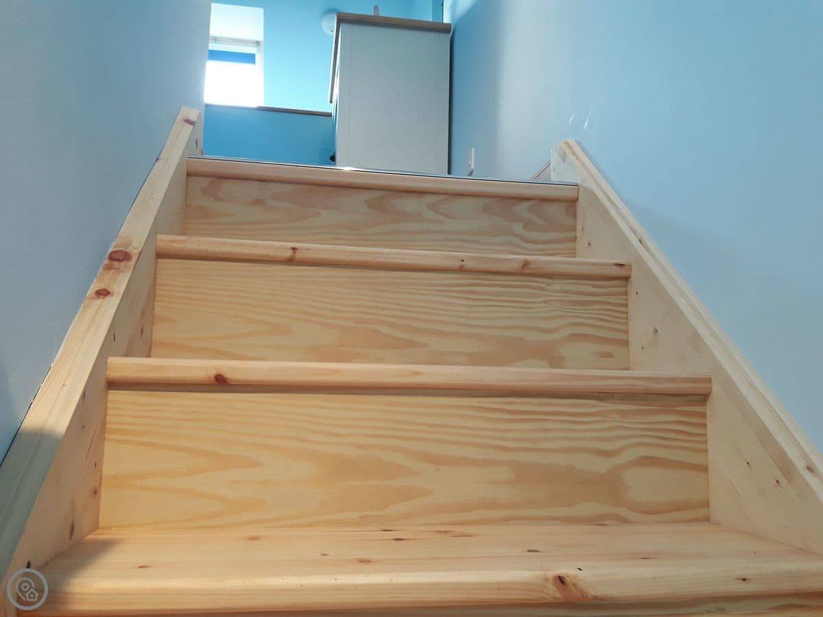 It's an open-plan space downstairs with the kitchen, dining, and living area all together. There's a wood burner, which is useful in the evenings. The bedroom is up a set of wooden stairs. They're a typical cottage staircase, so they're a bit steep and tight.
