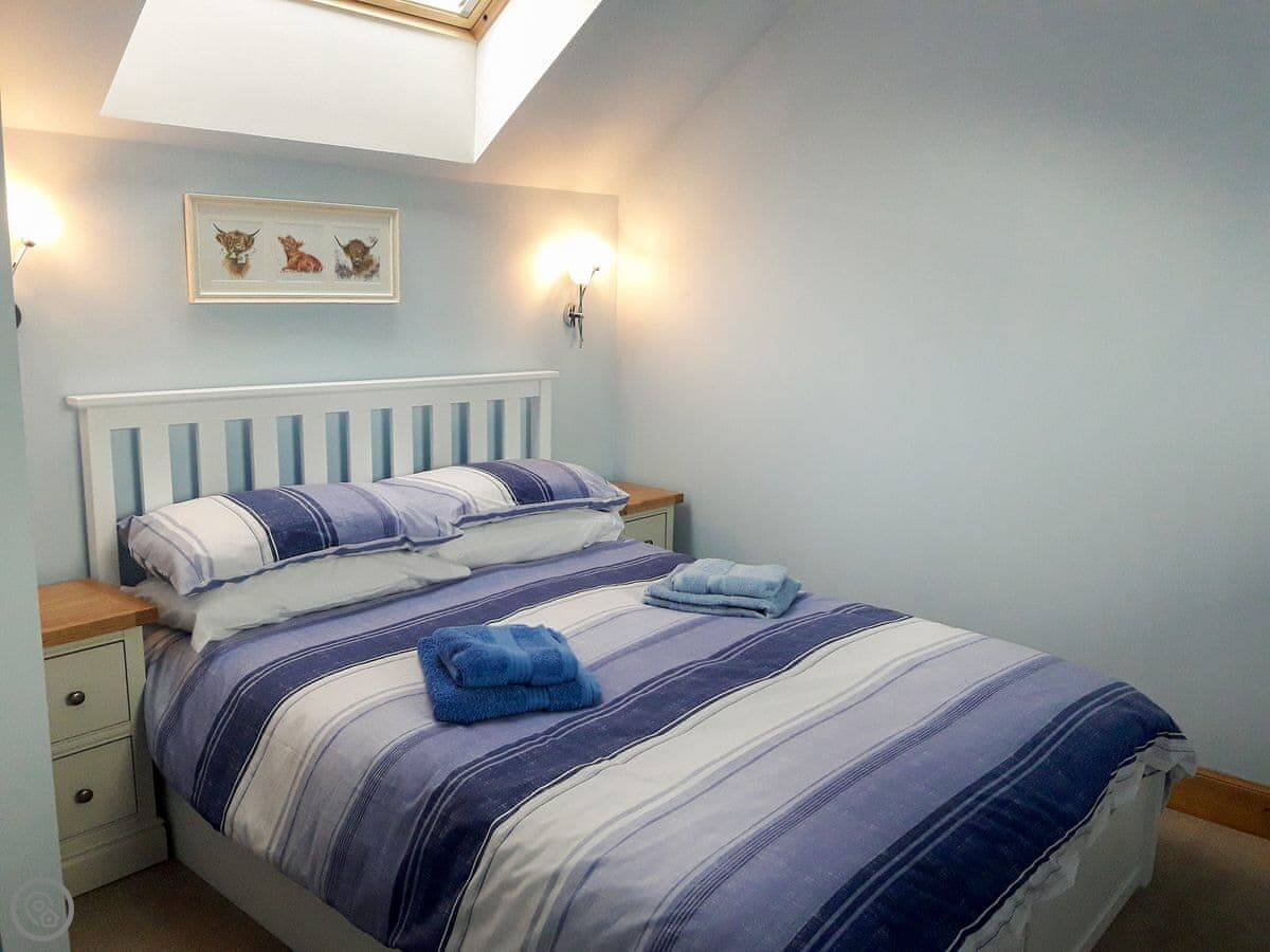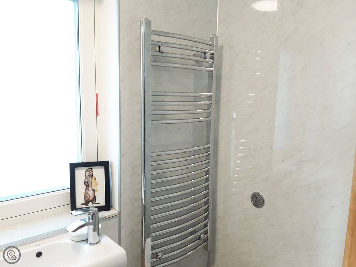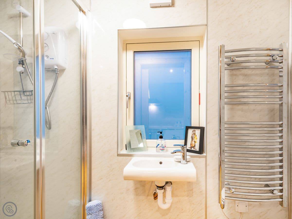 Facilities are what you'd expect: heating, hot water, Wi-Fi, a TV, a washing machine. Bedding and towels are included. The shower is a walk-in type. The entrance is wheelchair accessible, but the internal stairs to the bedroom mean it's not suitable for full wheelchair use inside.