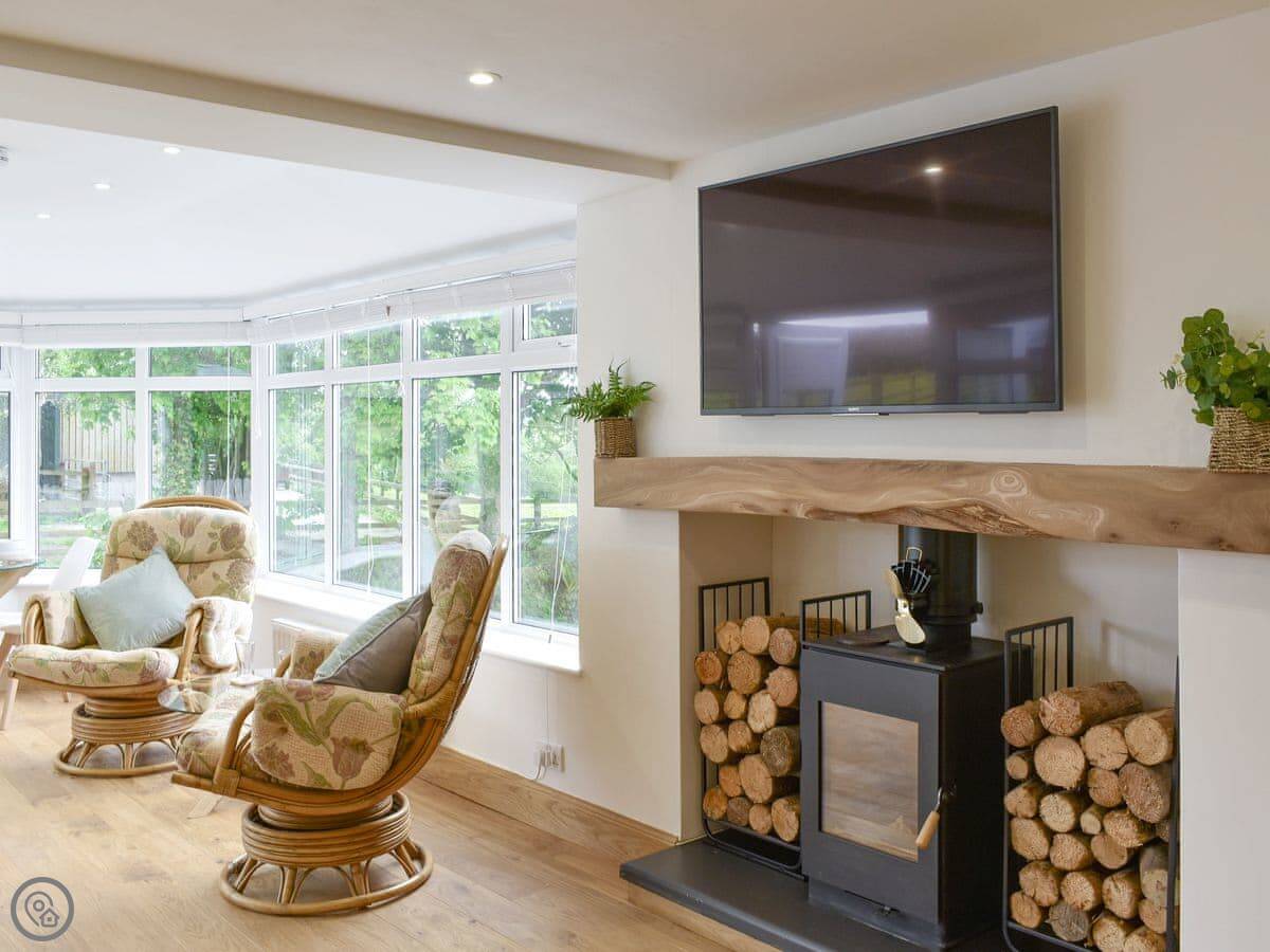 Outside, there's a private, enclosed garden with a patio. A little stream runs past it. You can park right outside.