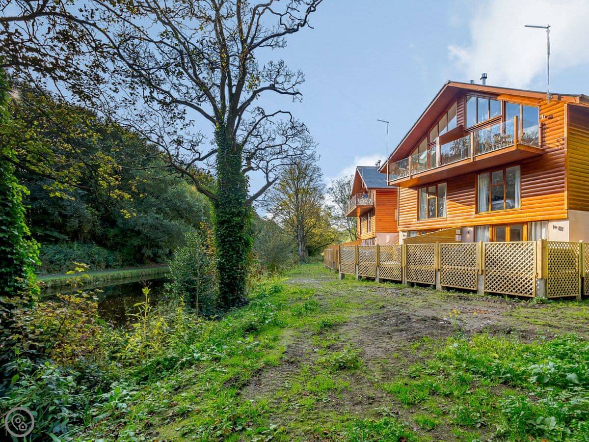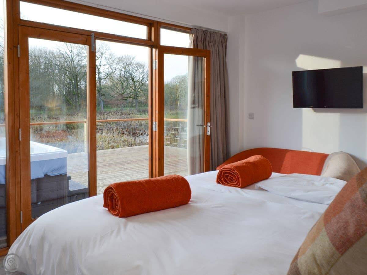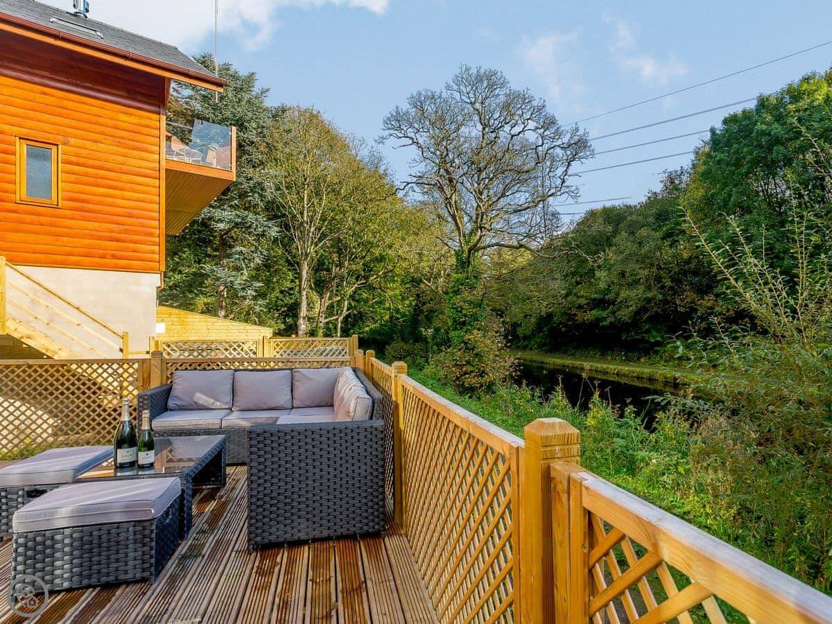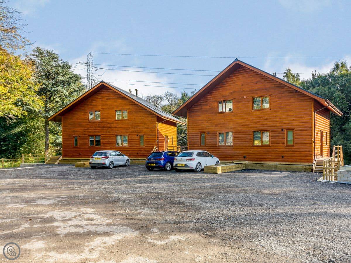 Waterside Lodge Three is in Elland, West Yorkshire. It's a wooden lodge set in a country park. The views over the lakes and trees are the main thing. It's quiet.