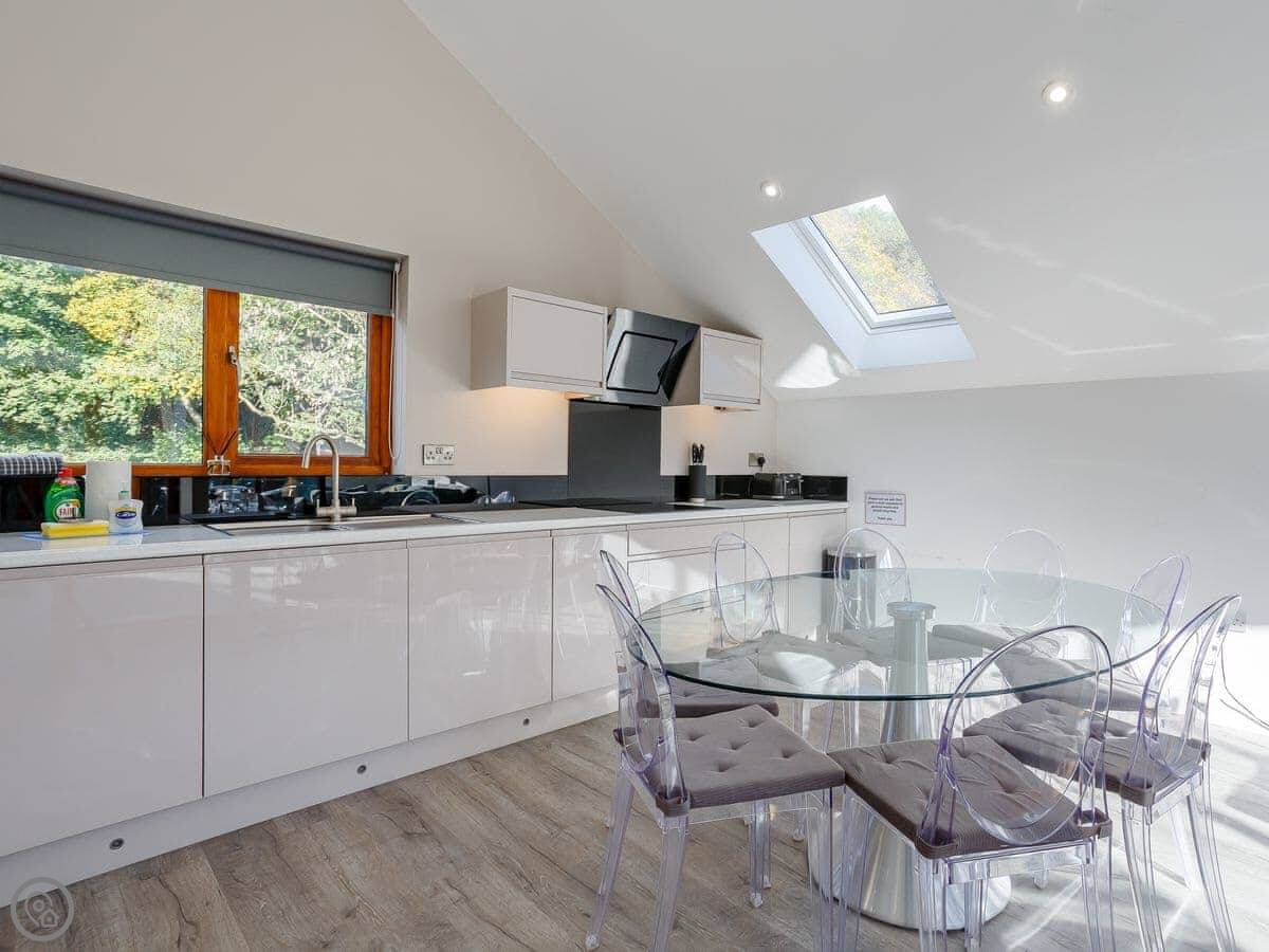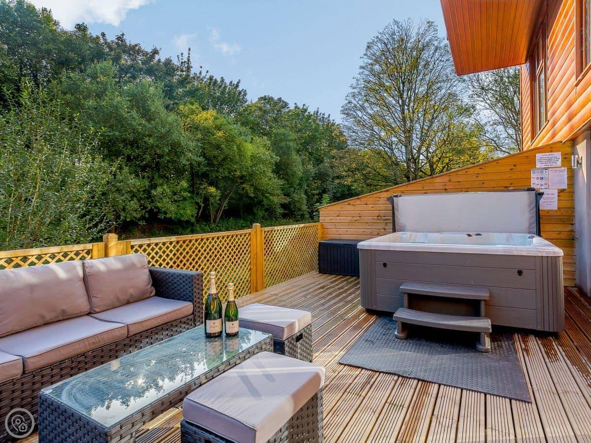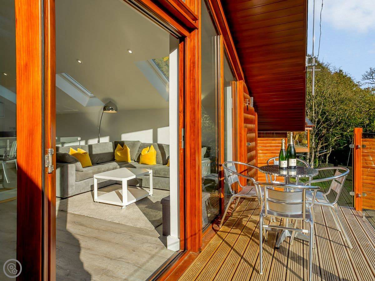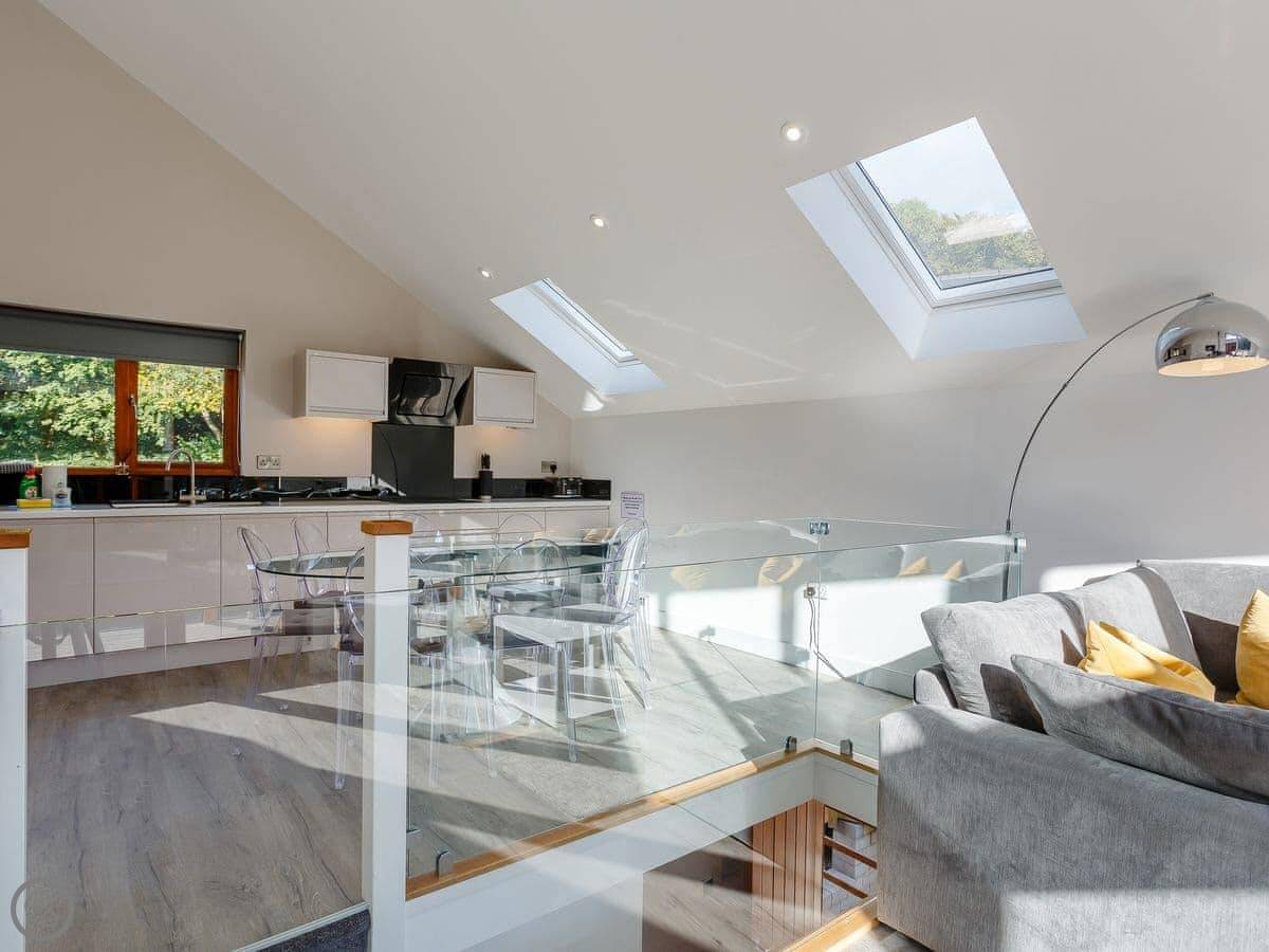 Waterside Lodge Three is in Elland, West Yorkshire. It's a wooden lodge set in a country park. The views over the lakes and trees are the main thing. It's quiet.