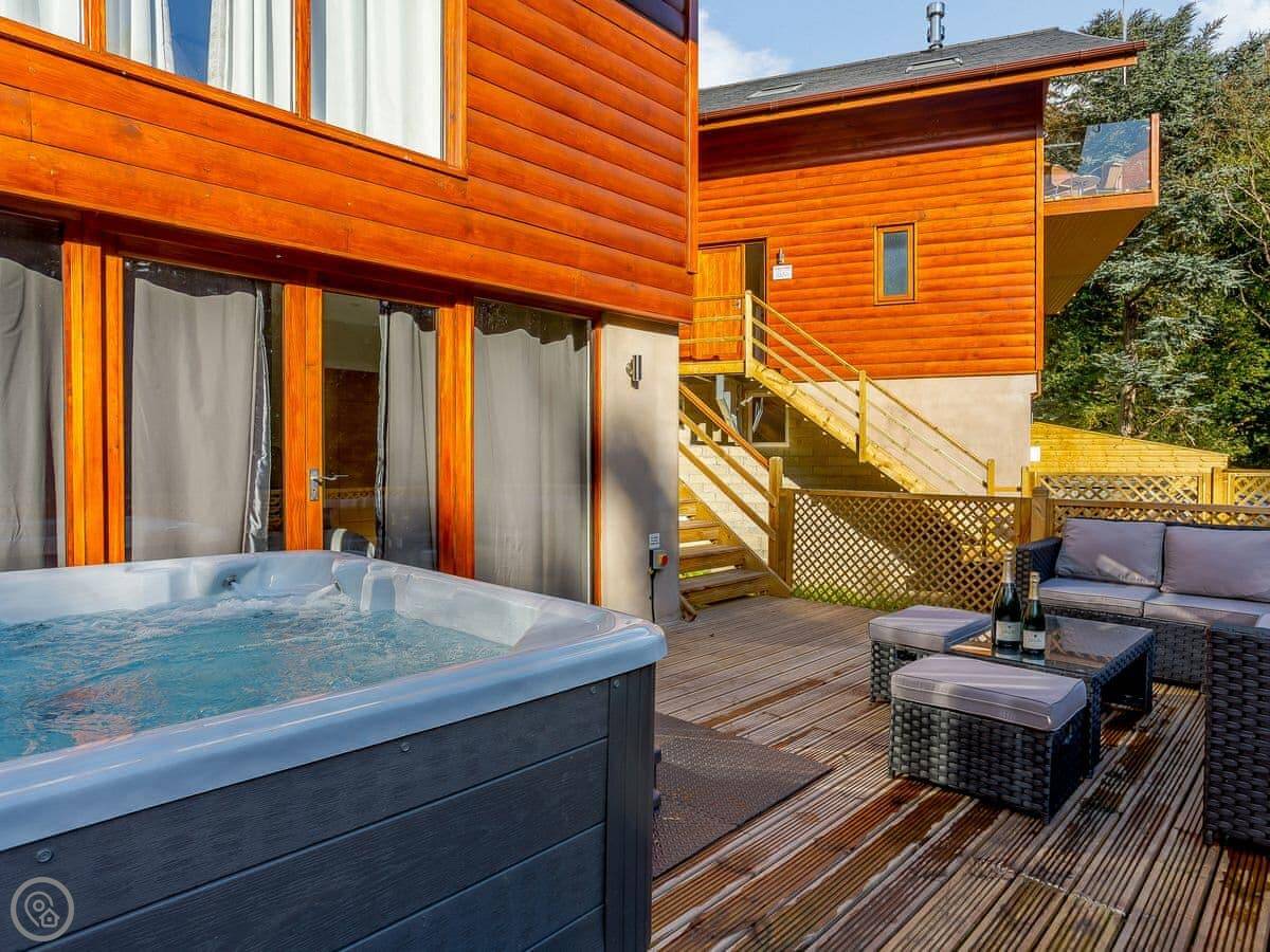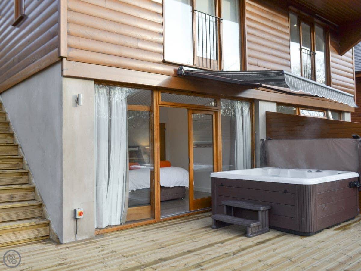 There's a hot tub on the deck. It looks out over the water. The stairs inside are a typical lodge style, so they're a bit steeper than in a normal house.
