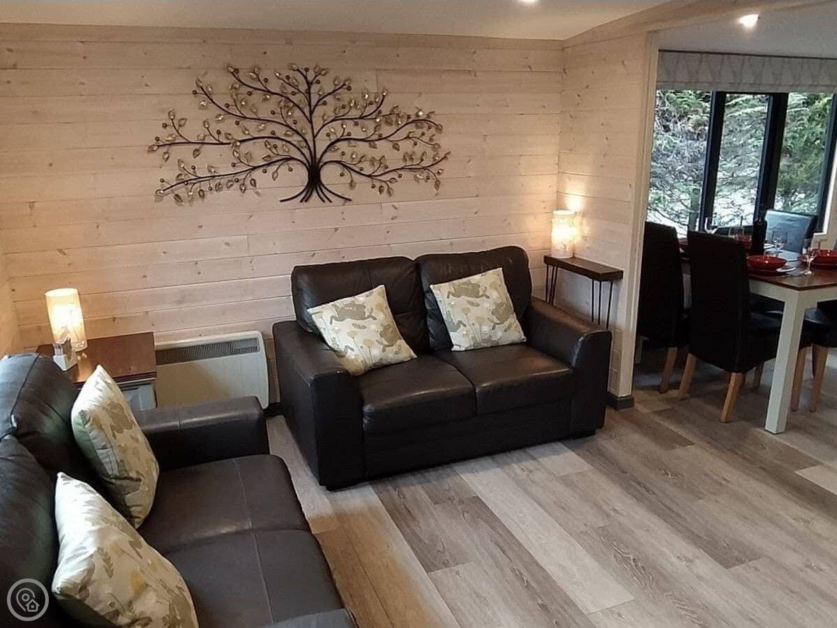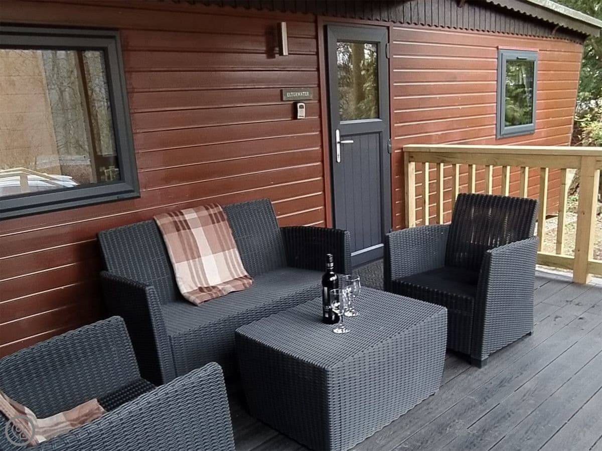 Outside, there's a large veranda with seating and a heater. The lodge is in a woodland setting, which means deer and other animals sometimes wander past. The woods and grounds are shared, but your outdoor space is private.