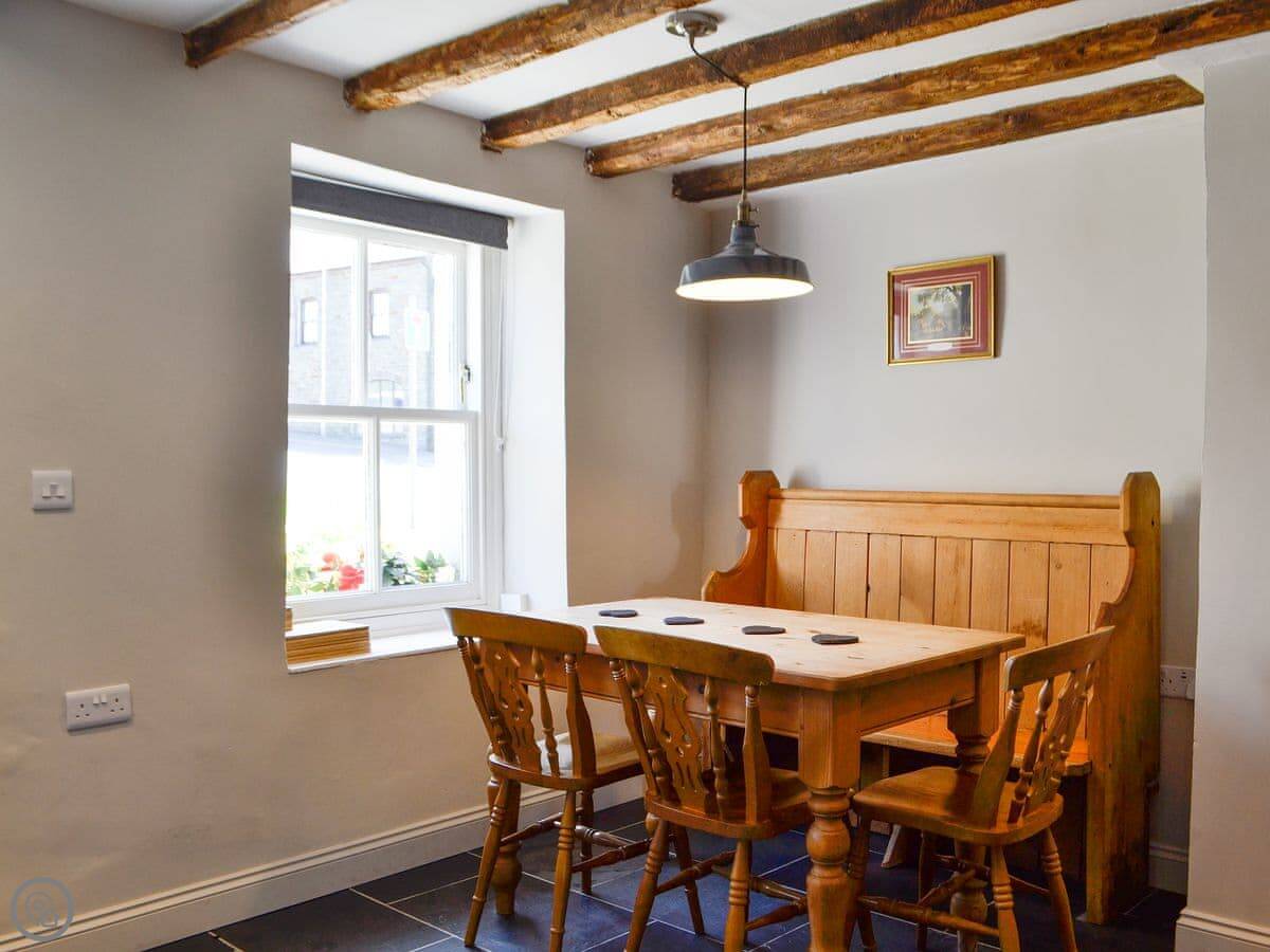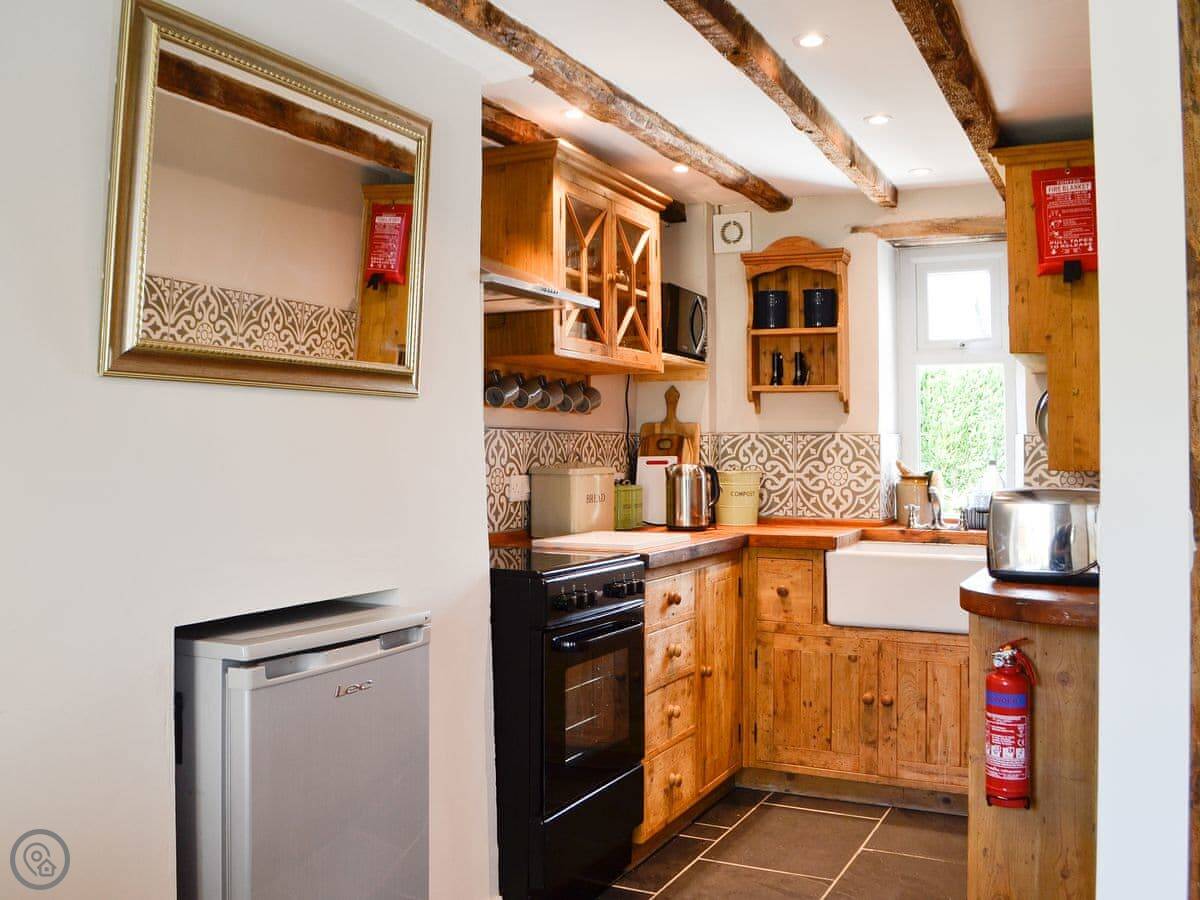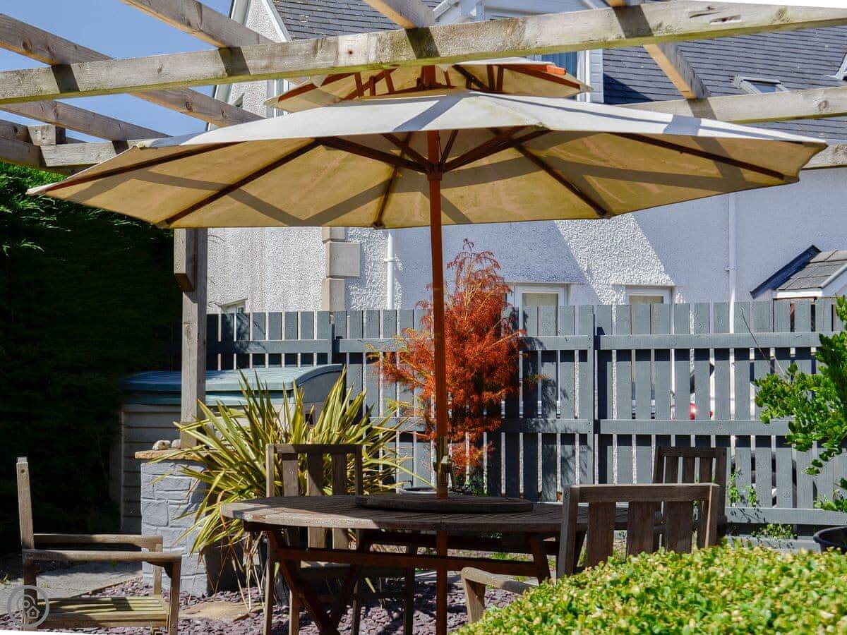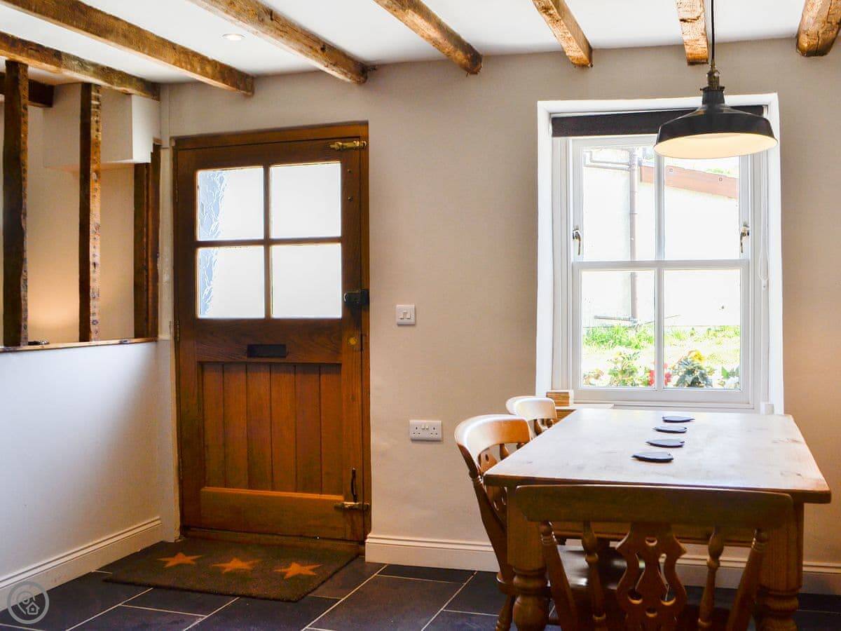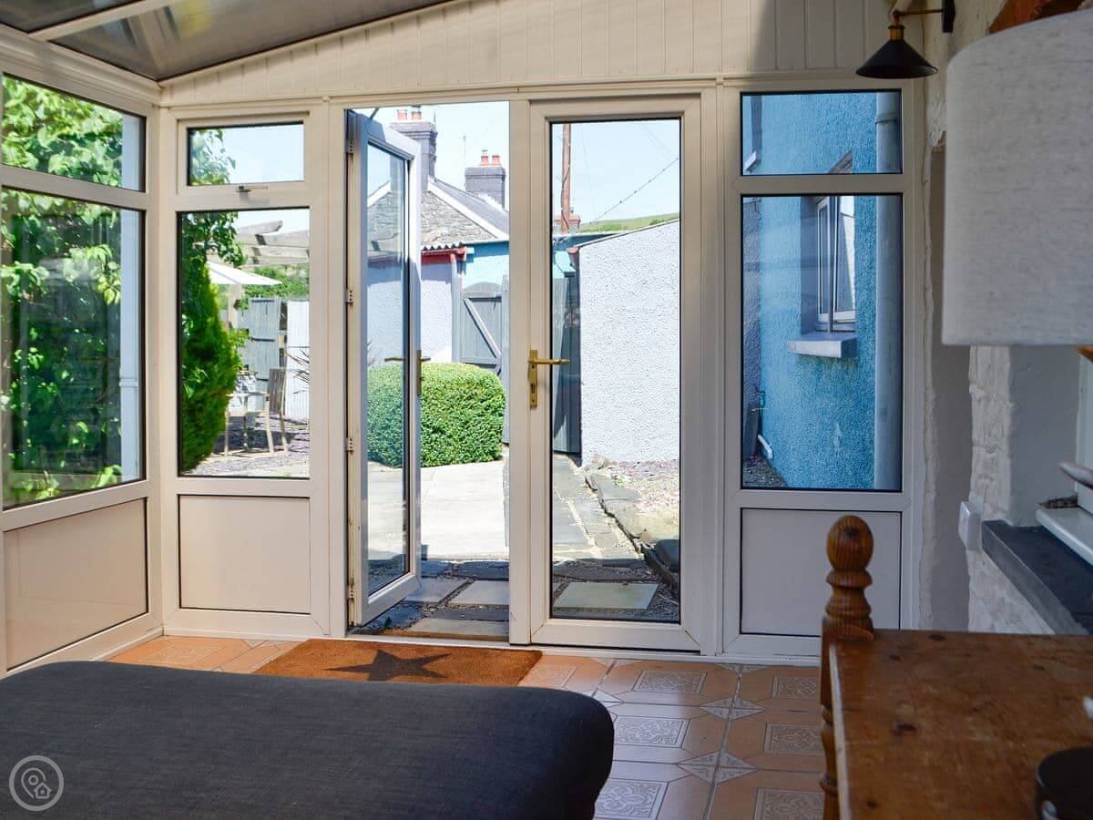 Downstairs there's a kitchen, a sitting room with a wood burner and a smart TV, a dining room, and a conservatory. The conservatory opens onto a little courtyard with a table and chairs. There's a washing machine and bedding is included.