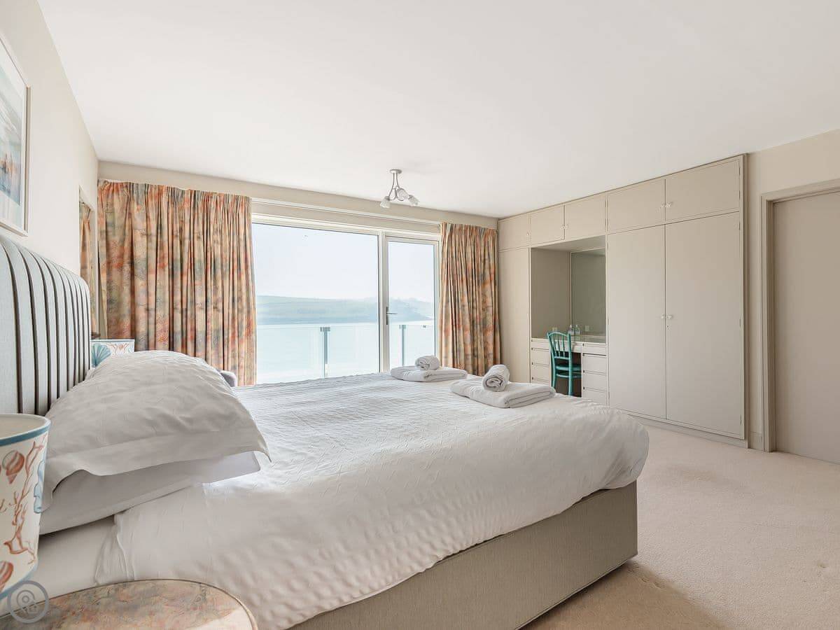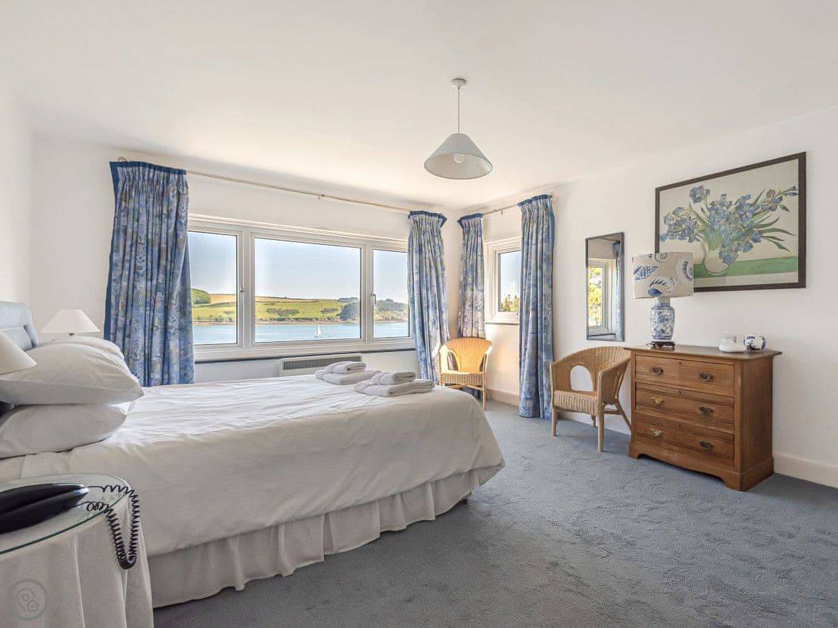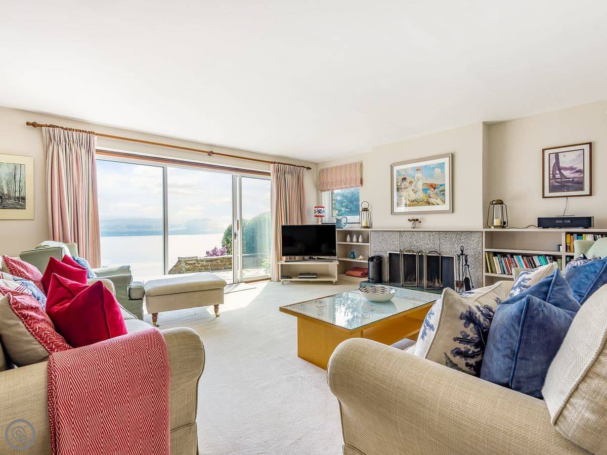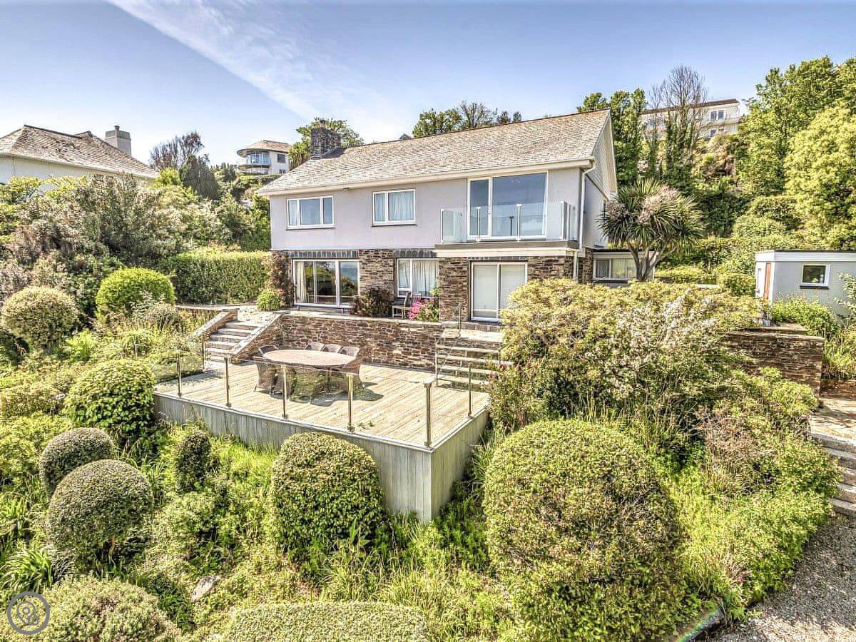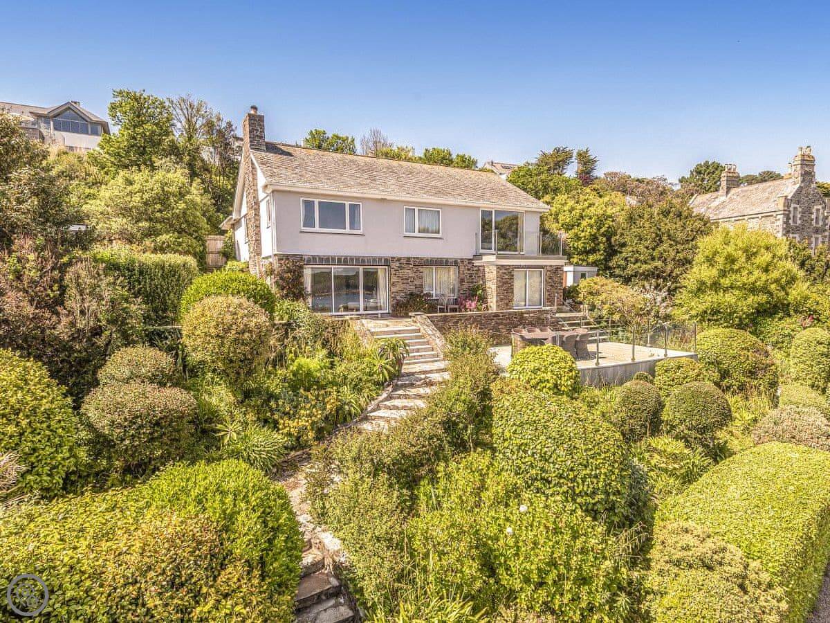From the entrance hall off which there is a cloakroom with toilet you ascend to the large landing off which are a shower room, super kingsize bedroom with glorious sea views and balcony. A zip and link super kingsize bedroom with great sea views, kingsize bedroom again with super sea views and a family bathroom with over bath shower and toilet. A short flight of stairs leads to two single bedrooms. Stairs from the lobby lead down to the spacious hallway off which are the utility room, kitchen with good sea and harbour views and patio doors out to the terrace. The large living/dining room have lovely sea views and patio doors leading off both to the terrace with the most lovely sea views and there is an open fire in the living room. The terraced garden leads down to the foreshore but please take care with children on the terraces and around the fish pond. Beach ½ mile.