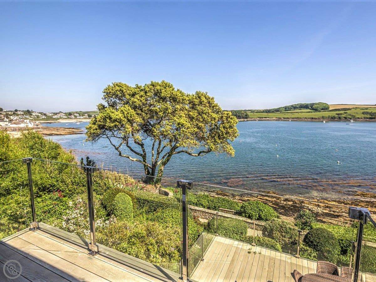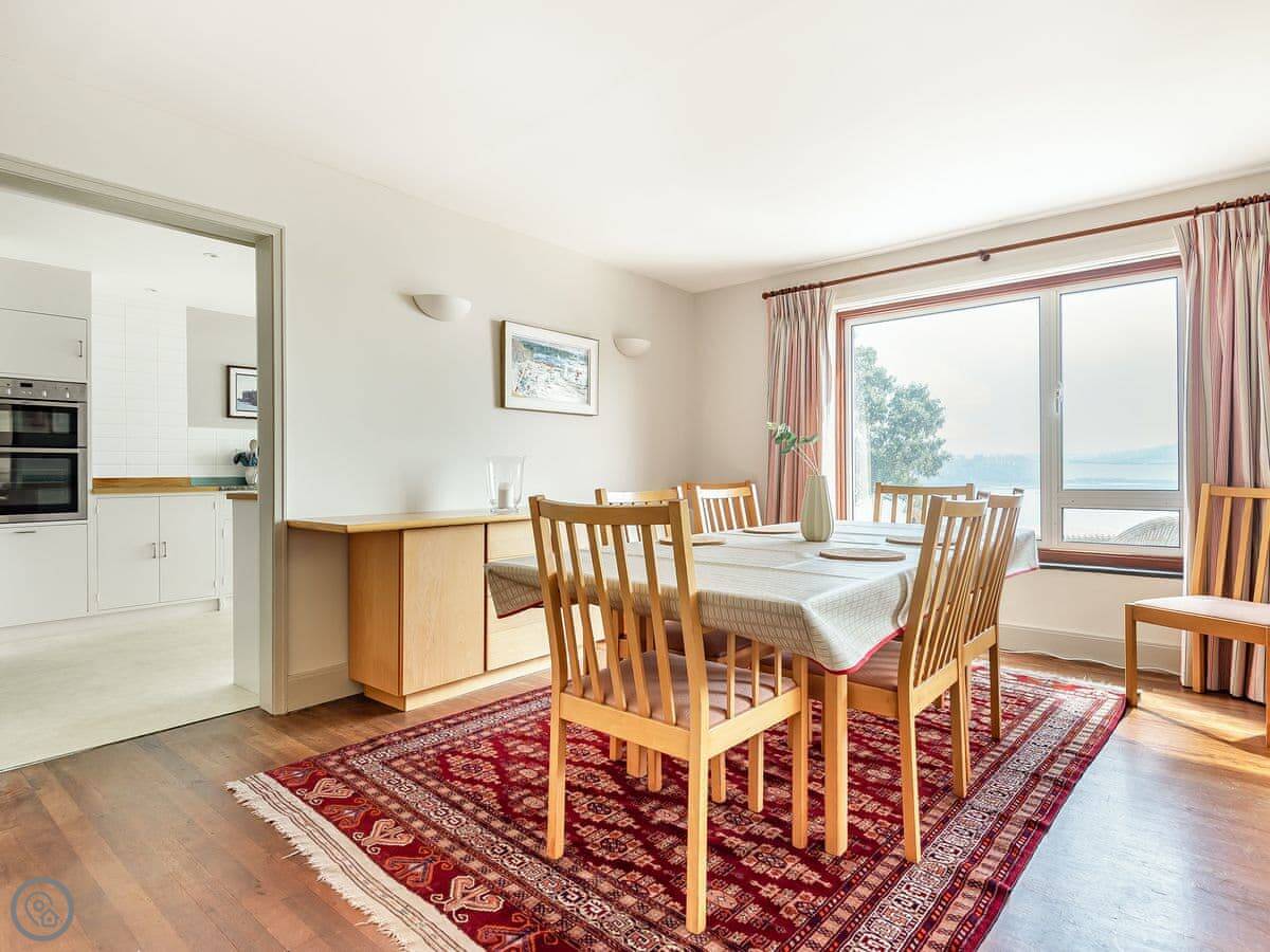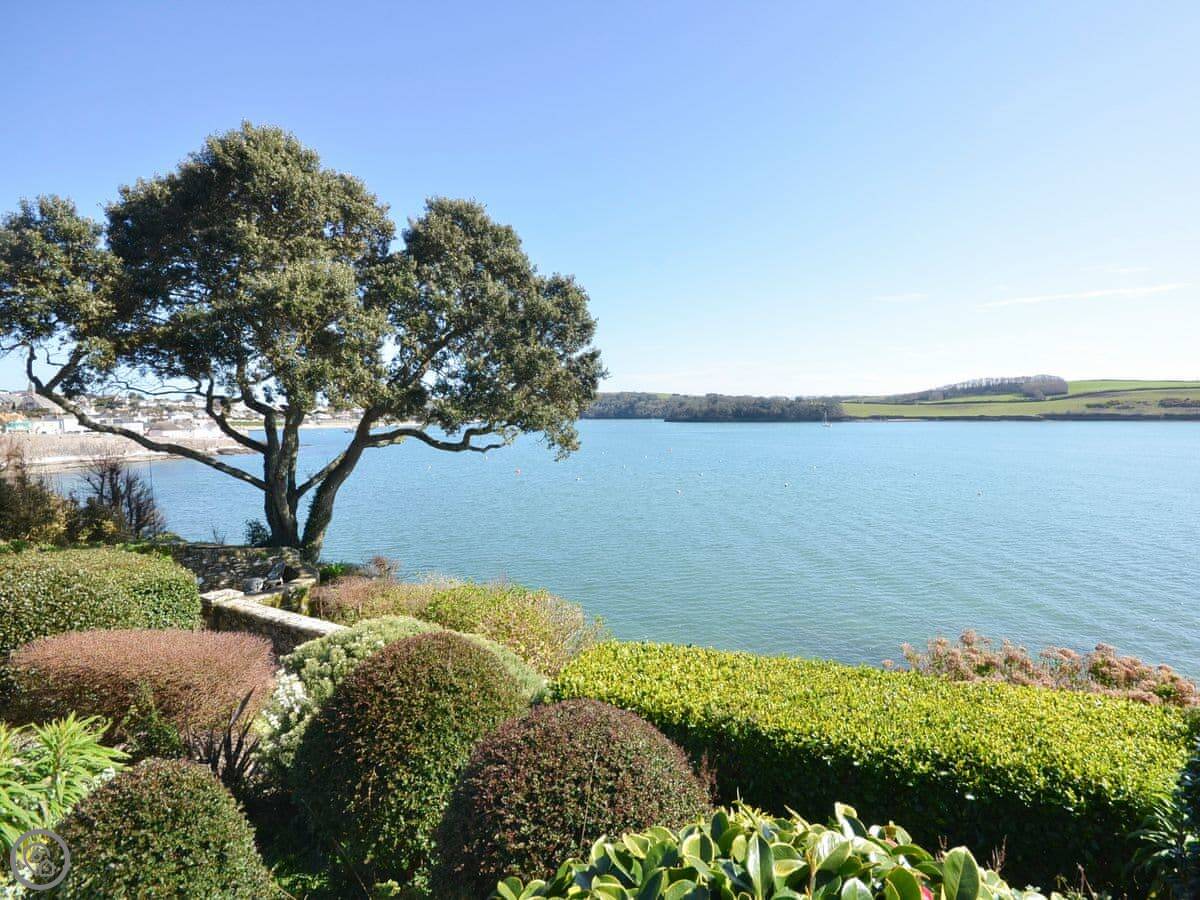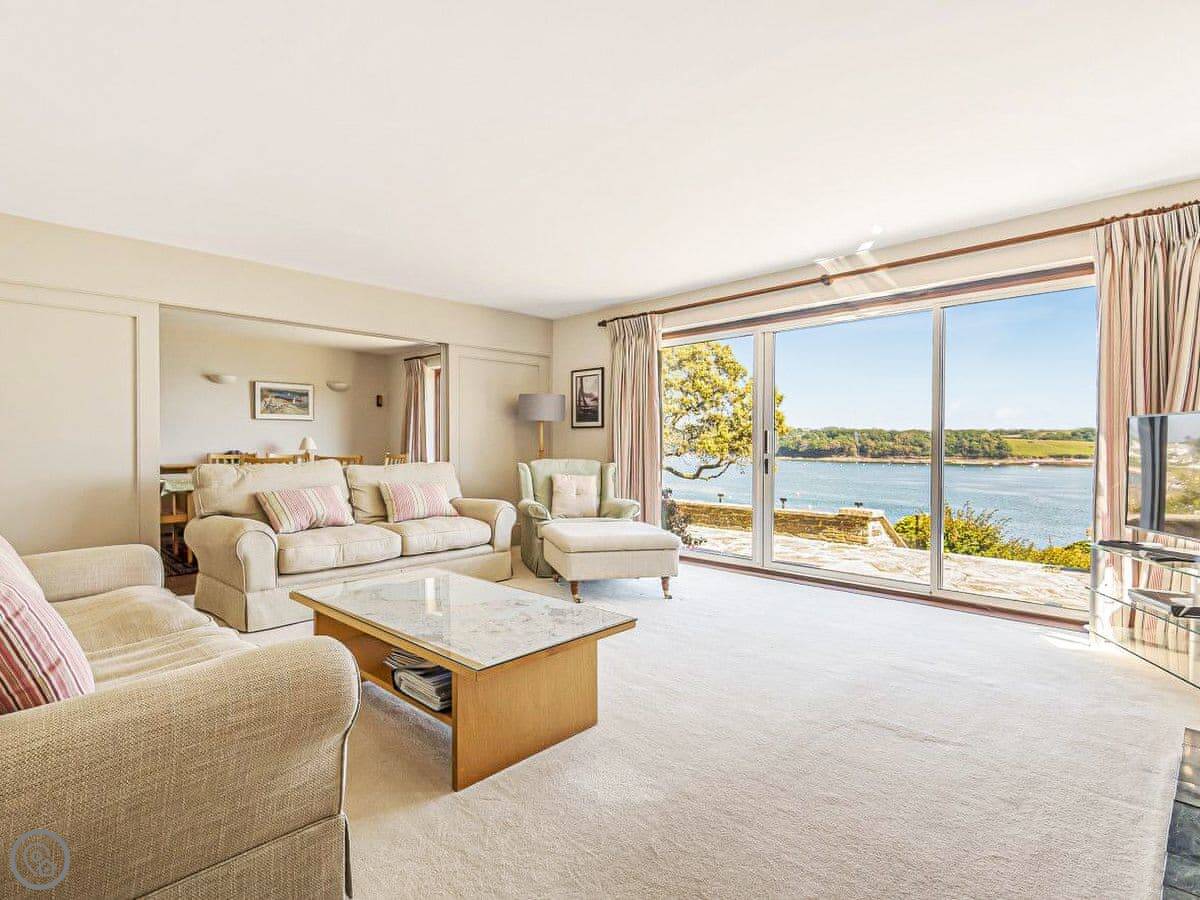 From the entrance hall off which there is a cloakroom with toilet you ascend to the large landing off which are a shower room, super kingsize bedroom with glorious sea views and balcony. A zip and link super kingsize bedroom with great sea views, kingsize bedroom again with super sea views and a family bathroom with over bath shower and toilet. A short flight of stairs leads to two single bedrooms. Stairs from the lobby lead down to the spacious hallway off which are the utility room, kitchen with good sea and harbour views and patio doors out to the terrace. The large living/dining room have lovely sea views and patio doors leading off both to the terrace with the most lovely sea views and there is an open fire in the living room. The terraced garden leads down to the foreshore but please take care with children on the terraces and around the fish pond. Beach ½ mile.