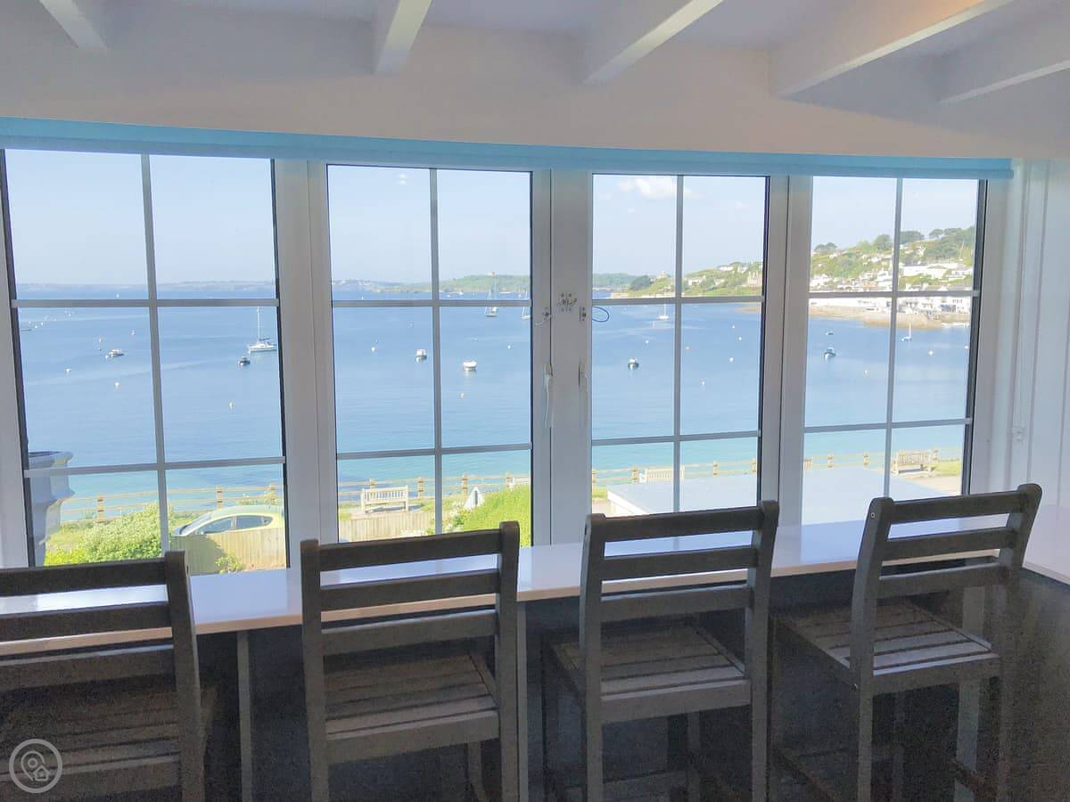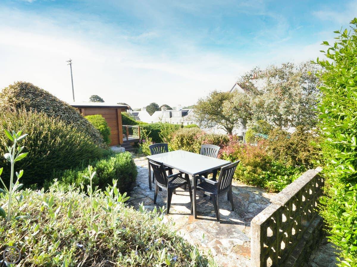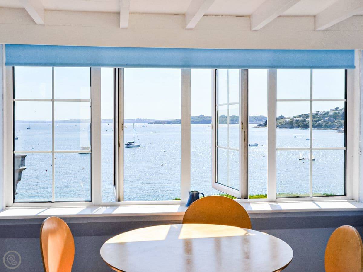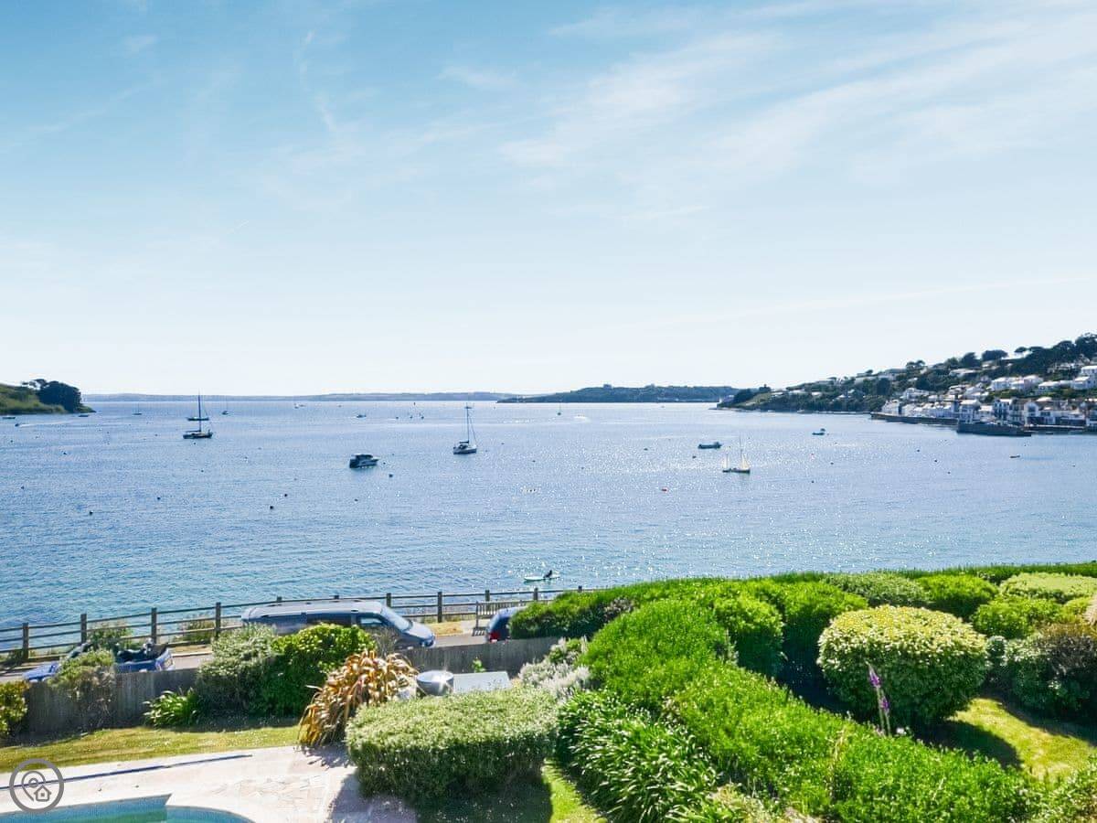 The living room and main bedroom look straight out over the sea to St Mawes harbour. You can see the castles and right across to the Lizard on a clear day. The garden has a raised patio with a table and chairs. You can sit out there and it's a nice spot.