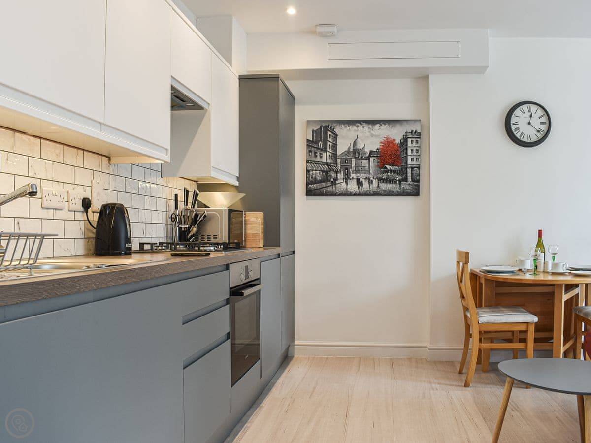 The place is modern inside. It's an open plan living, kitchen, and dining area. Big bay window at the front. The kitchen has a dishwasher. There's a fold-out table for eating.