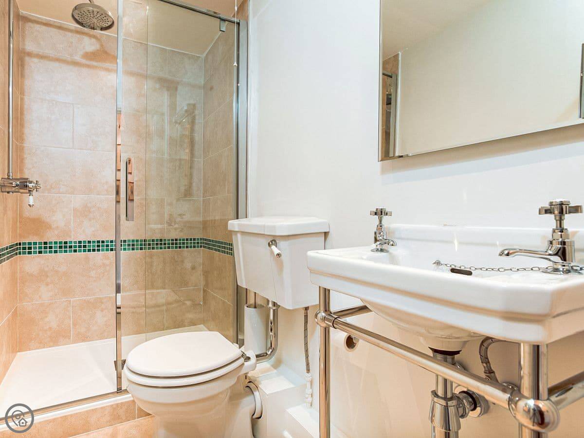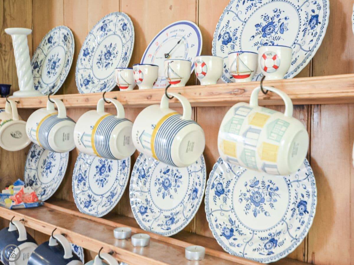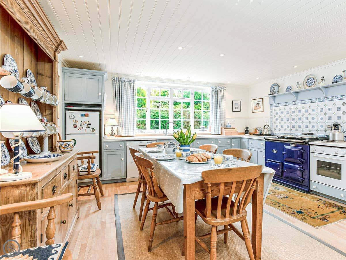 Inside, the kitchen has a big table that fits everyone. It's got an Aga, which keeps the place warm, and there's a dishwasher and a washing machine in a utility room. Bedding and towels are included.