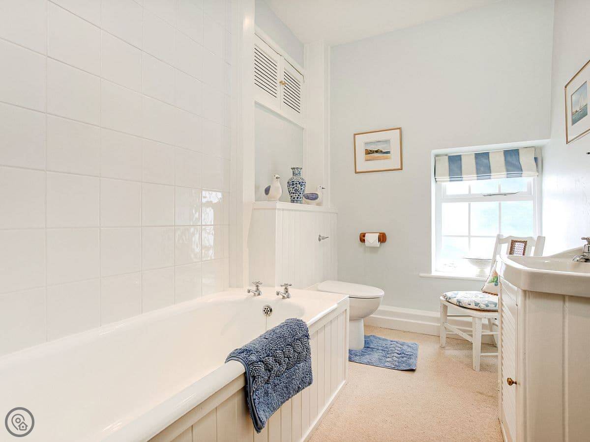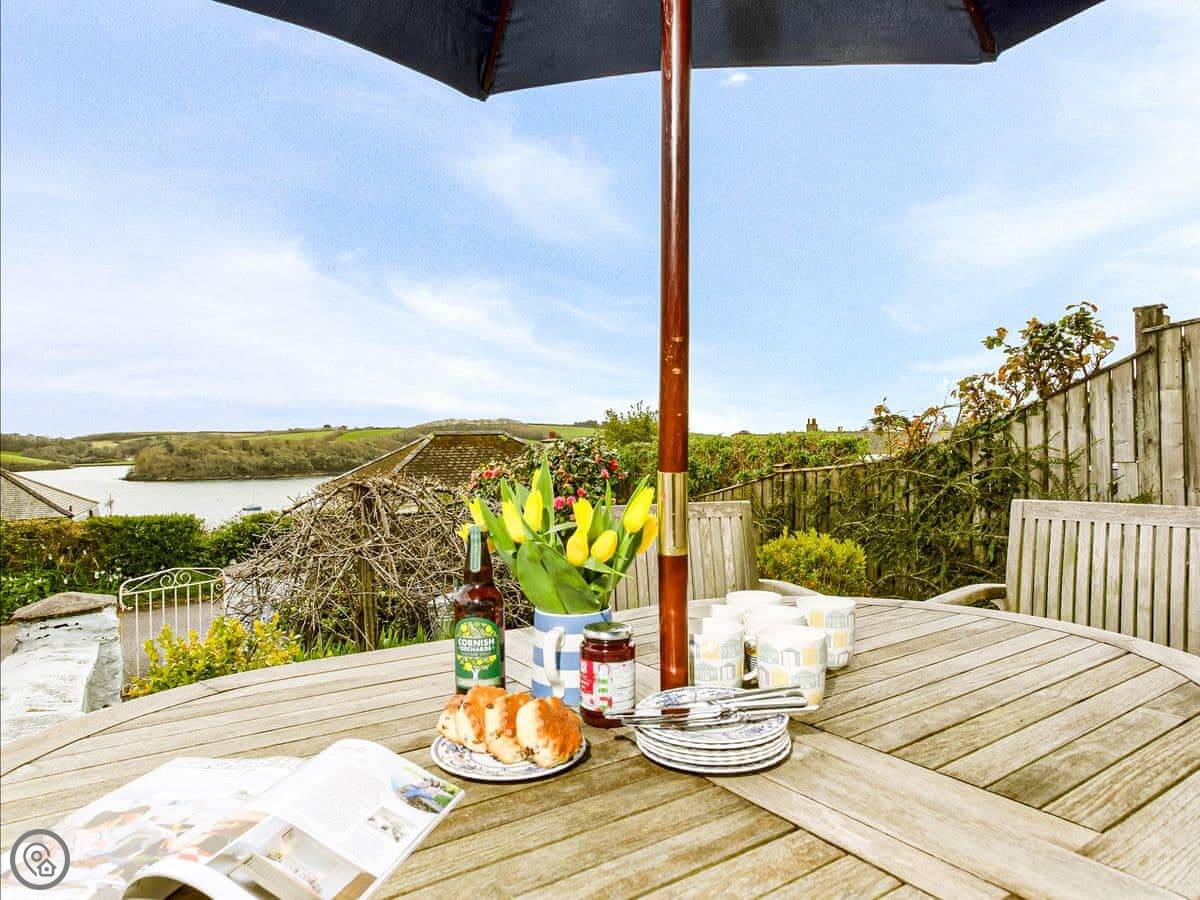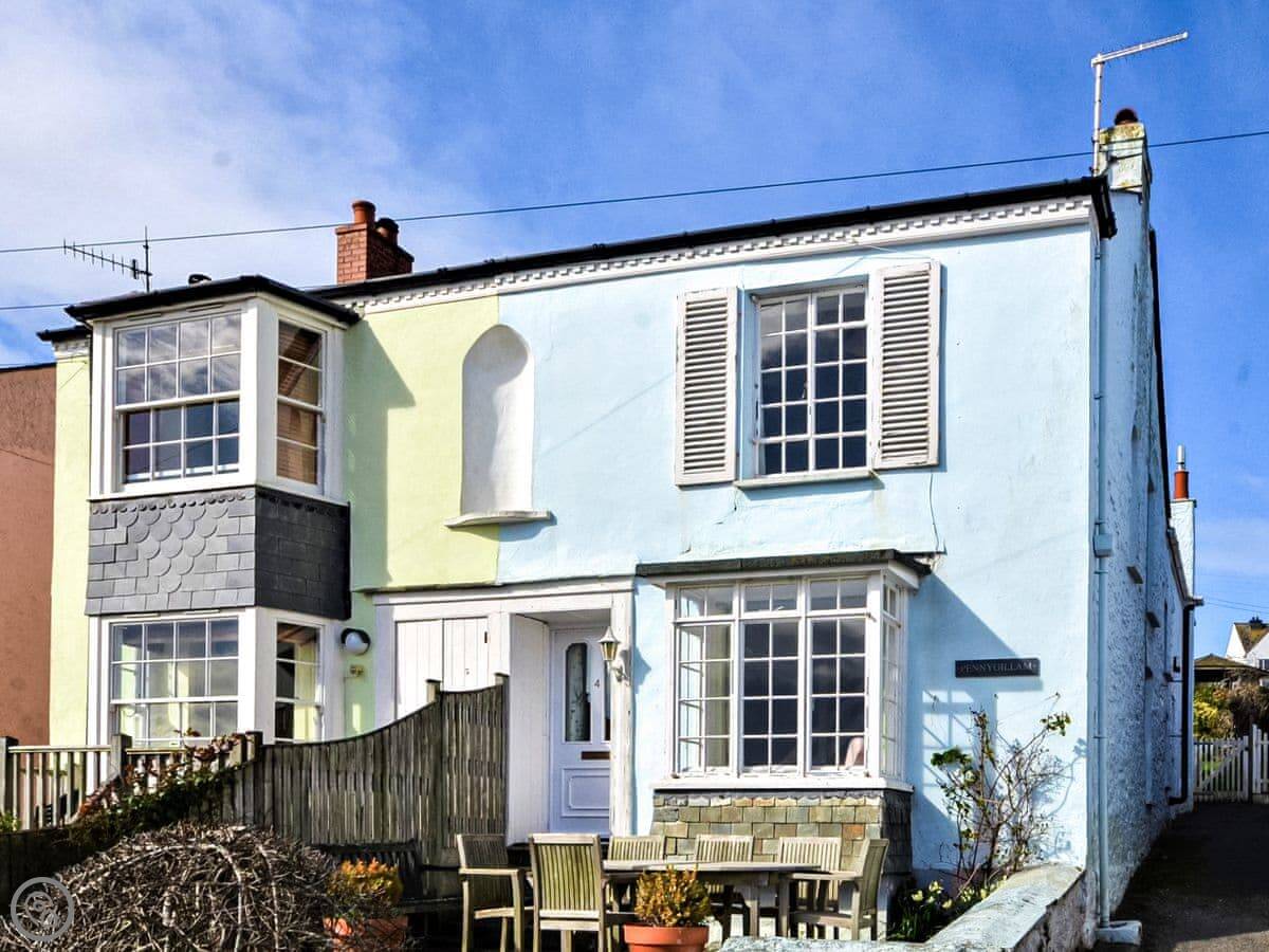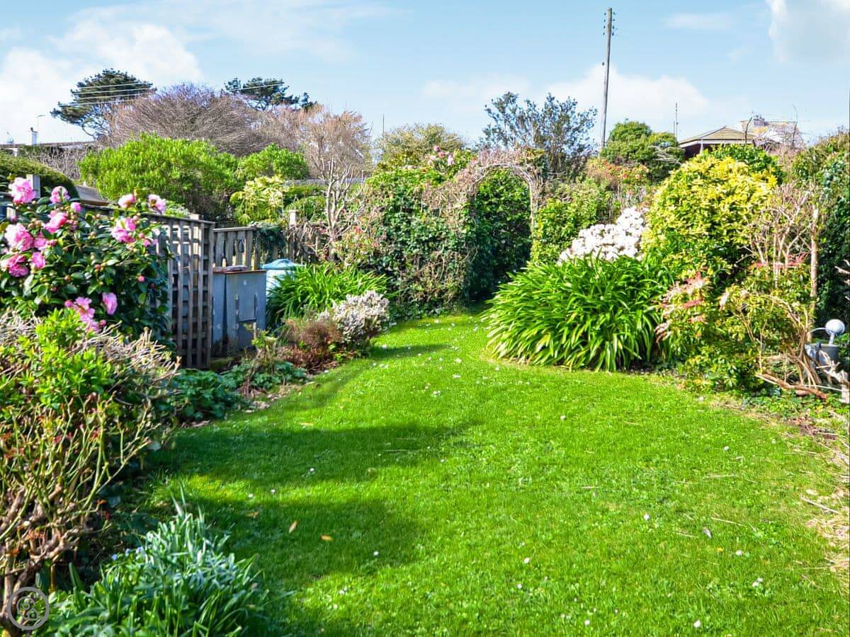 From the front room and the main bedroom upstairs you look straight out to sea. It's a good view. There's a small seating area out front to sit and have a drink and watch it. The garden is at the back, it's got a lawn and some shrubs. There's garden furniture.