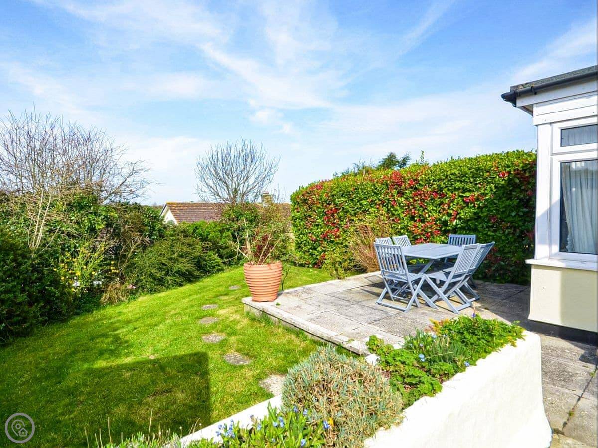 The garden at the back has a patio, a lawn, and some flower beds. It's enclosed. The front has a smaller cottage garden.