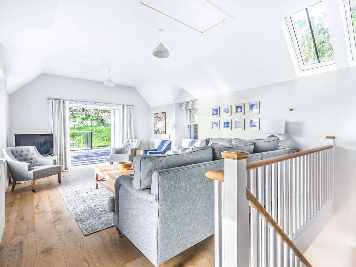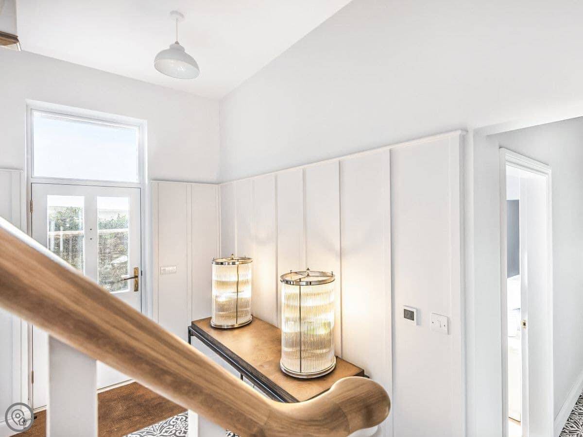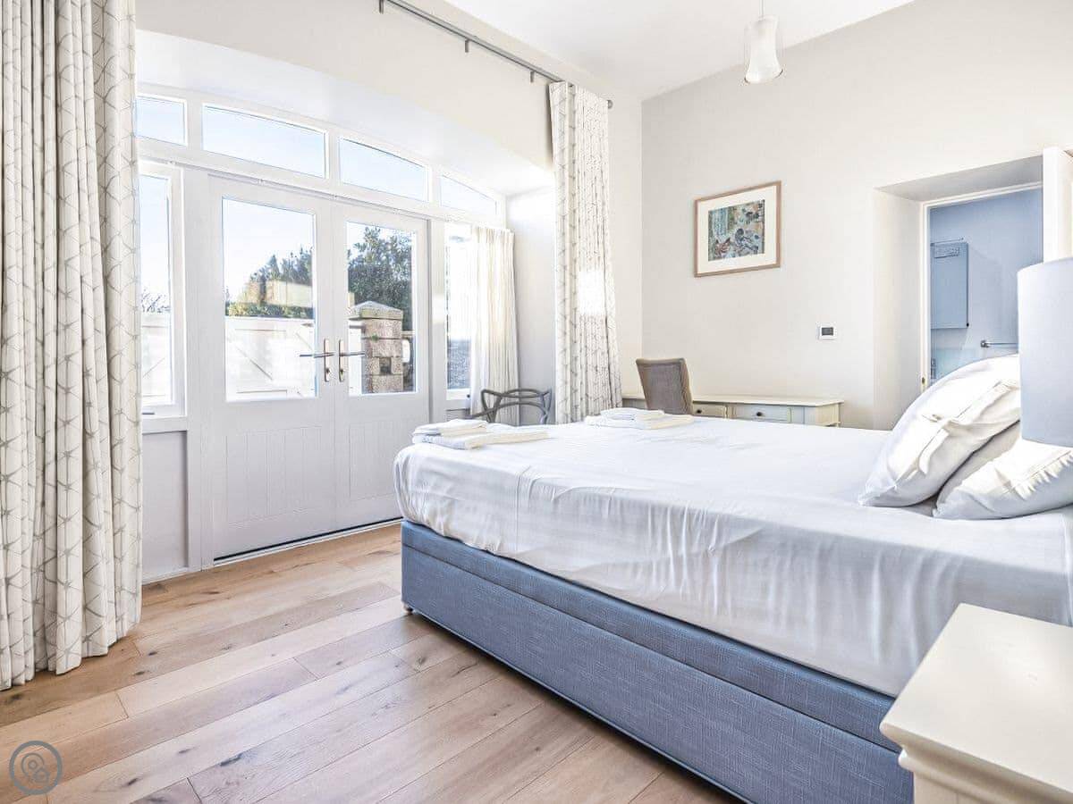It sleeps eight. Four bedrooms, each with its own bathroom. Three are en-suite, and there's a separate family bathroom too. It's got a 5 Star rating, so it's well equipped and comfortable. Everything's included: bedding, towels, WiFi. There's underfloor heating downstairs and an electric car charger on the drive.