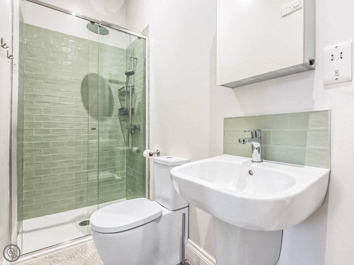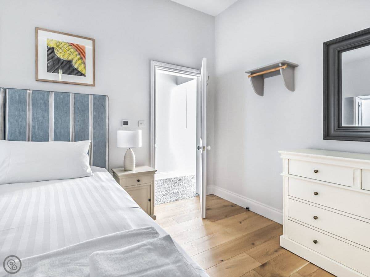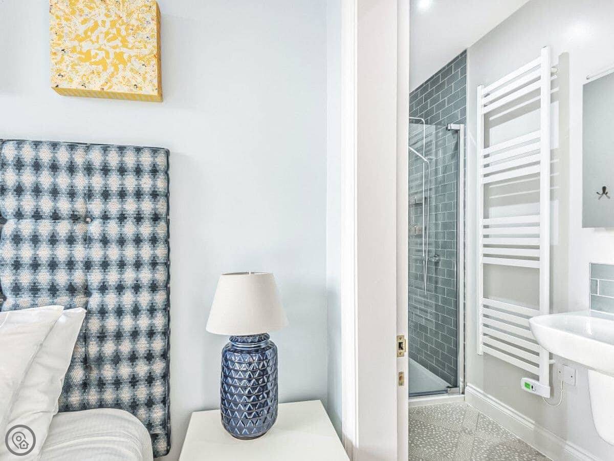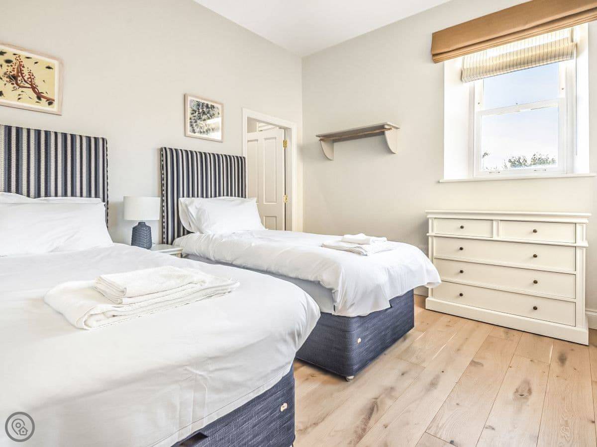 It sleeps eight. Four bedrooms, each with its own bathroom. Three are en-suite, and there's a separate family bathroom too. It's got a 5 Star rating, so it's well equipped and comfortable. Everything's included: bedding, towels, WiFi. There's underfloor heating downstairs and an electric car charger on the drive.