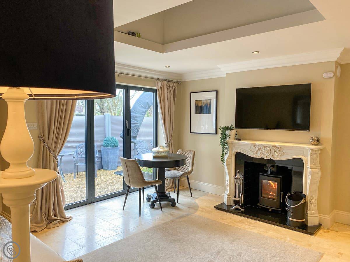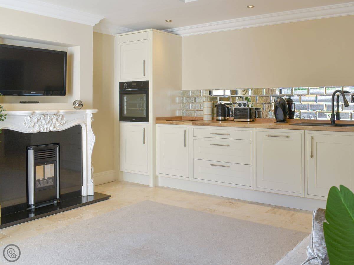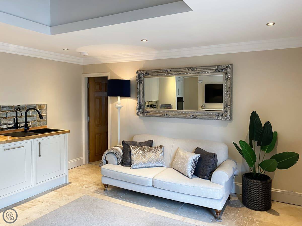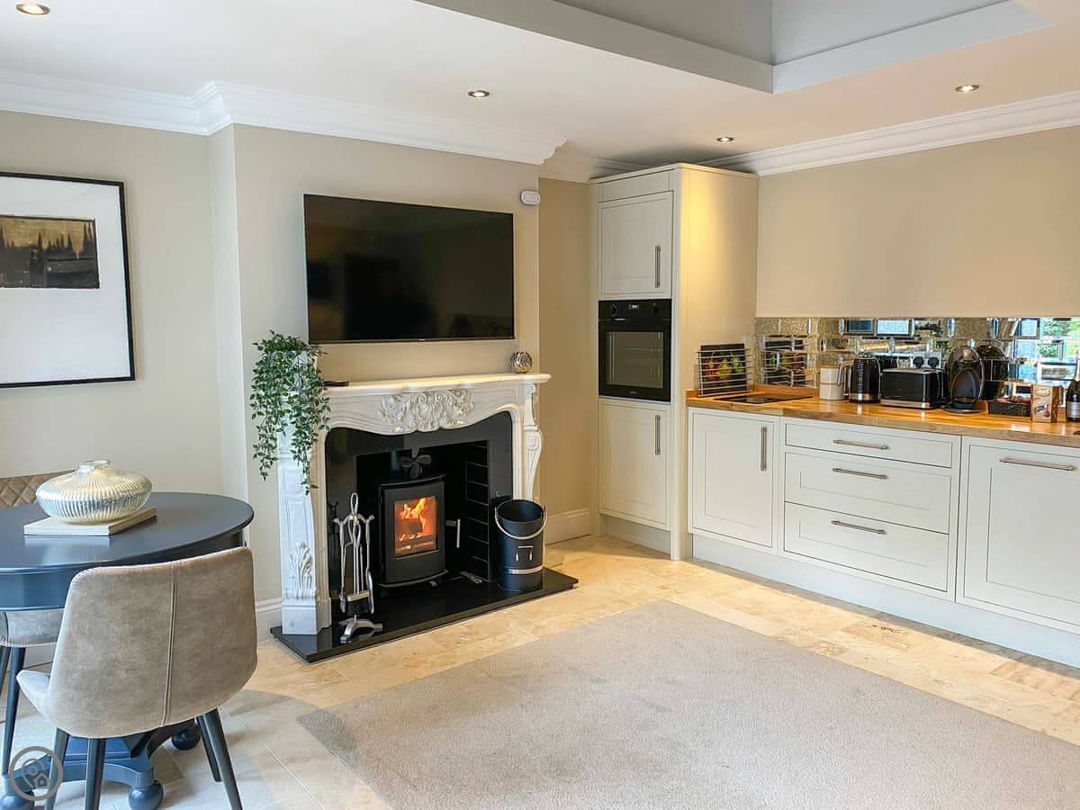 We renovated it last year. It's got a 5 Star rating, which means everything is new and works properly. It's all on one floor, which is handy. The bedroom has an en-suite shower room. The main space is open plan with a kitchen area, a sofa, and a wood burner. The floor is polished concrete, so it can feel a bit cool underfoot. There are rugs.