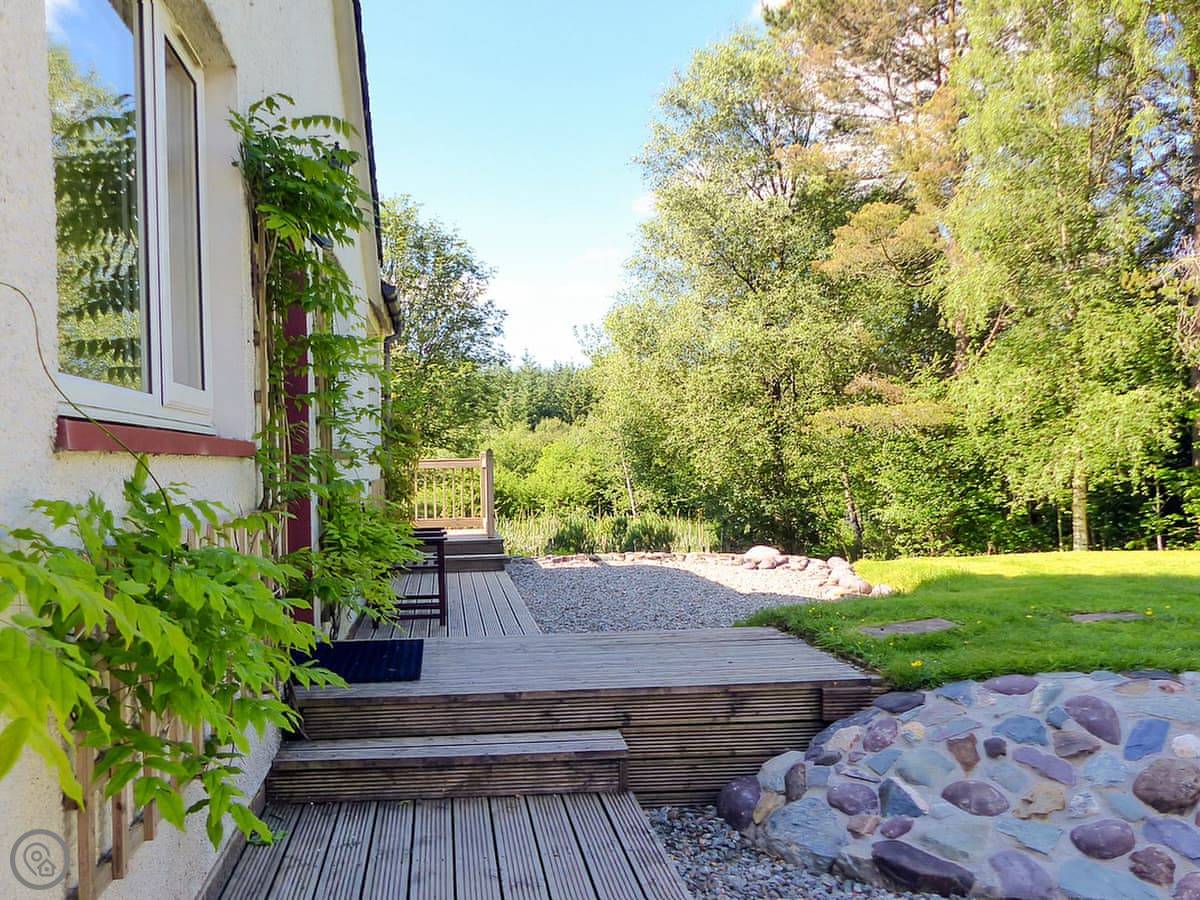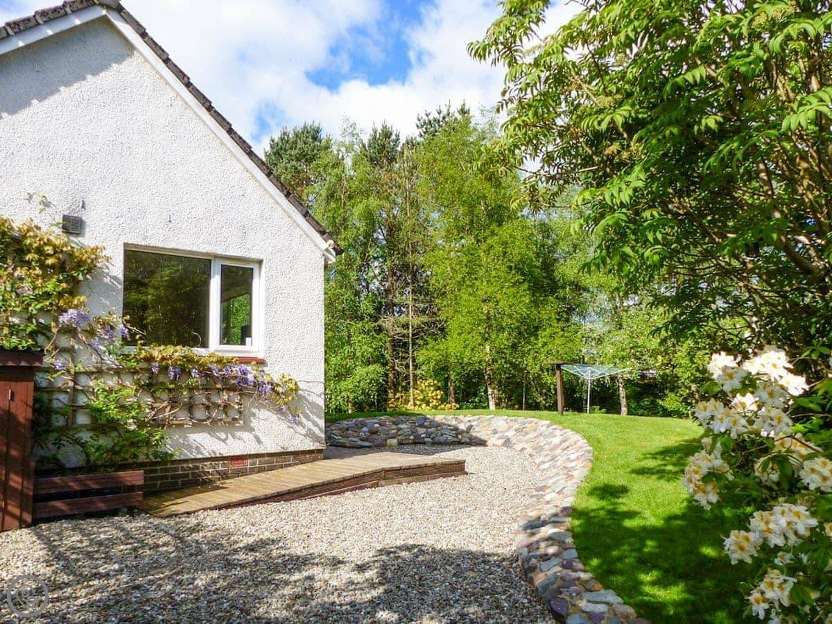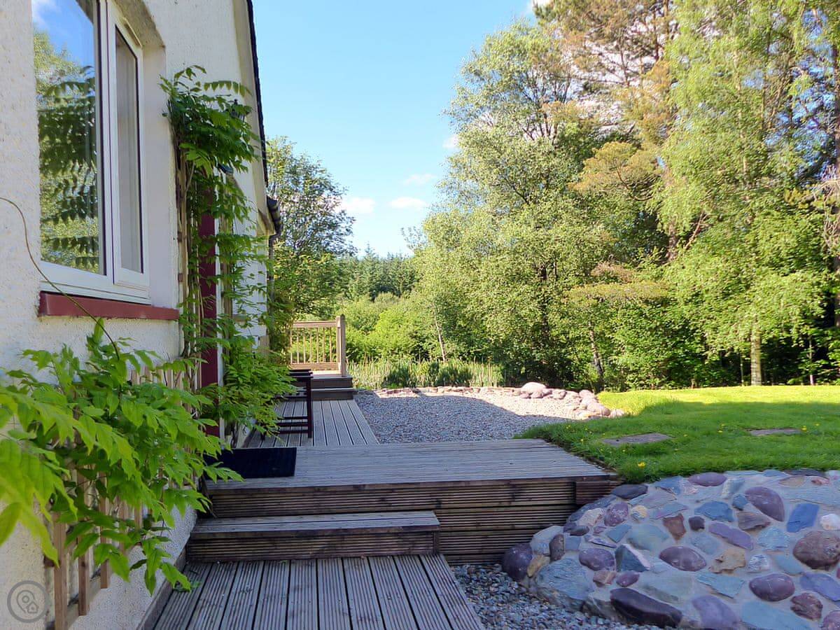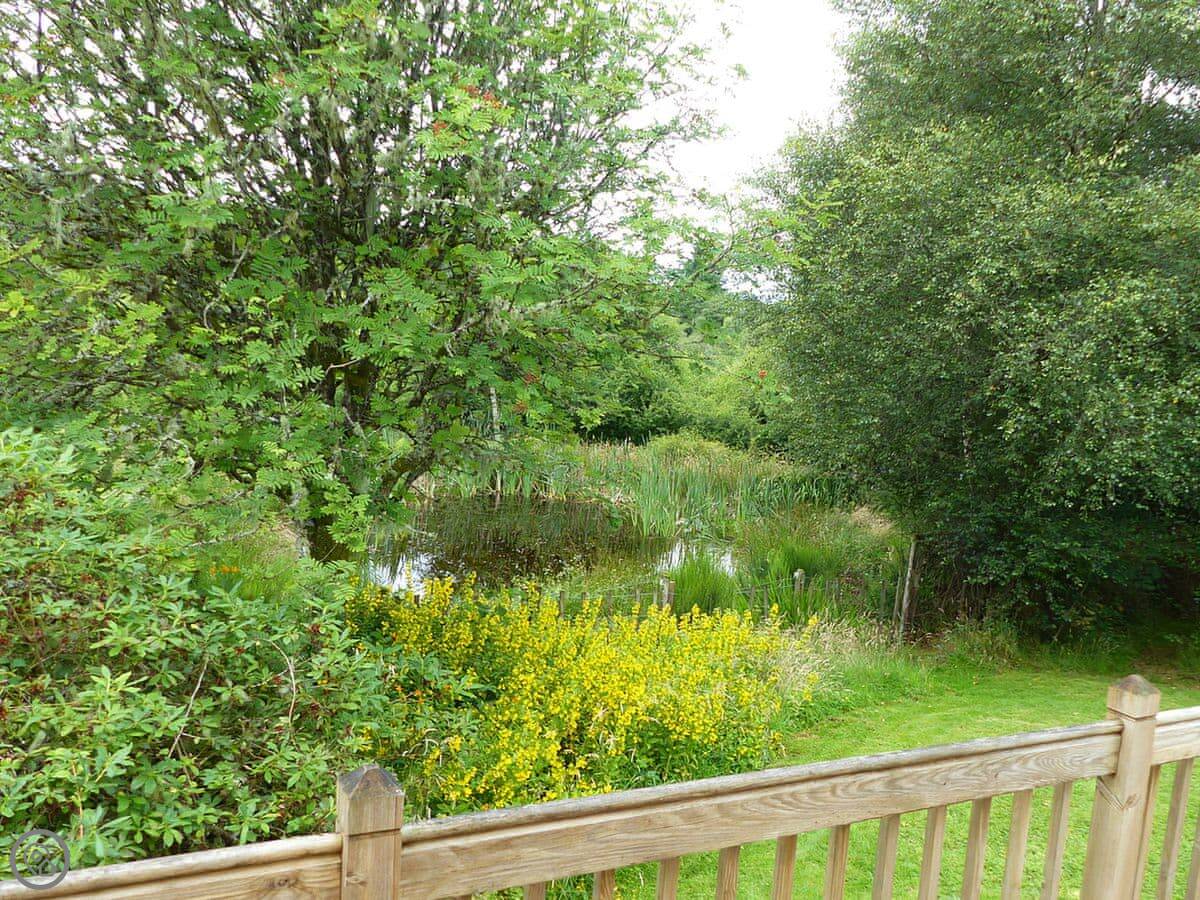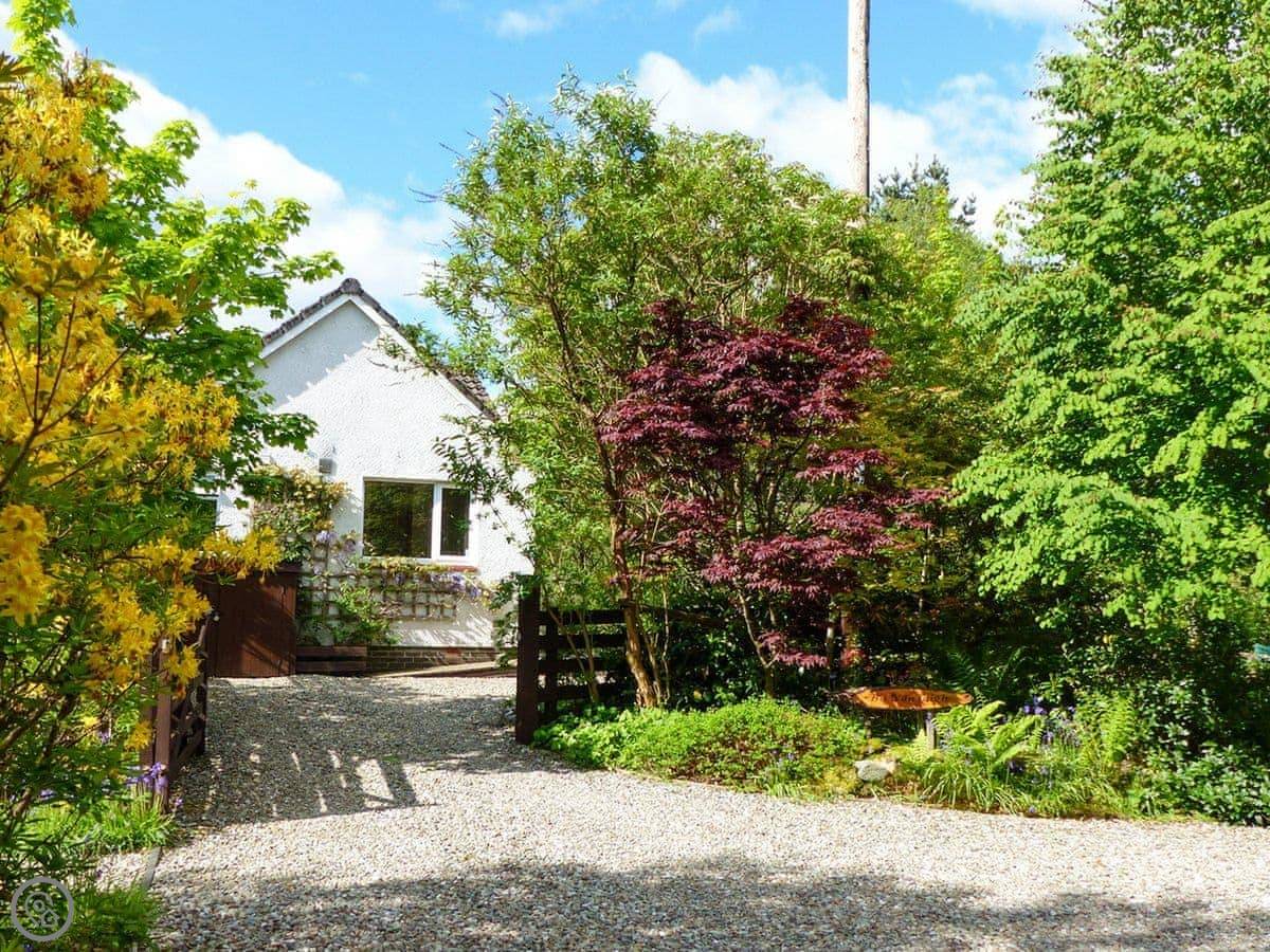 This is Bo Nan Taigh Cottage. It's on the edge of Aberfoyle, in the Queen Elizabeth Forest Park. It's quiet here. You look out over woods and a wildlife pond from the garden.