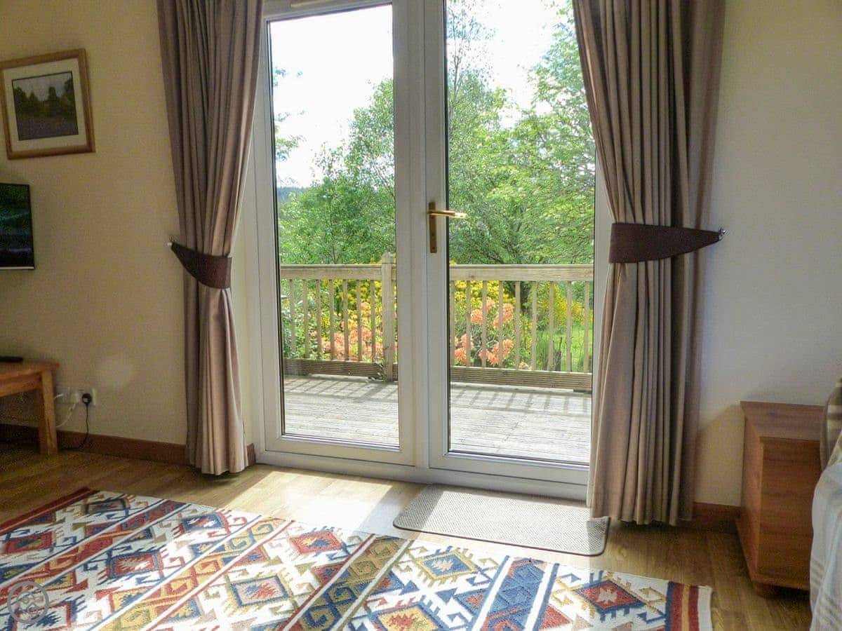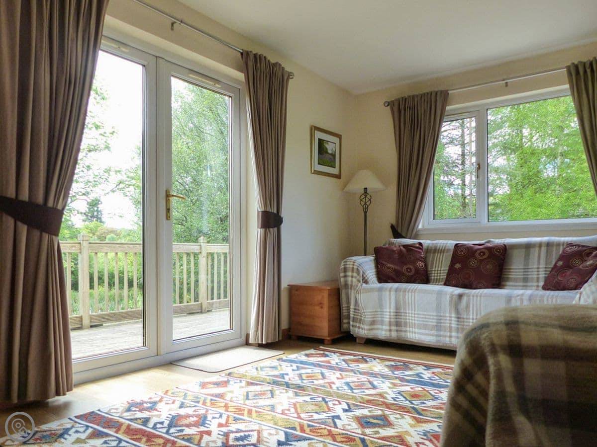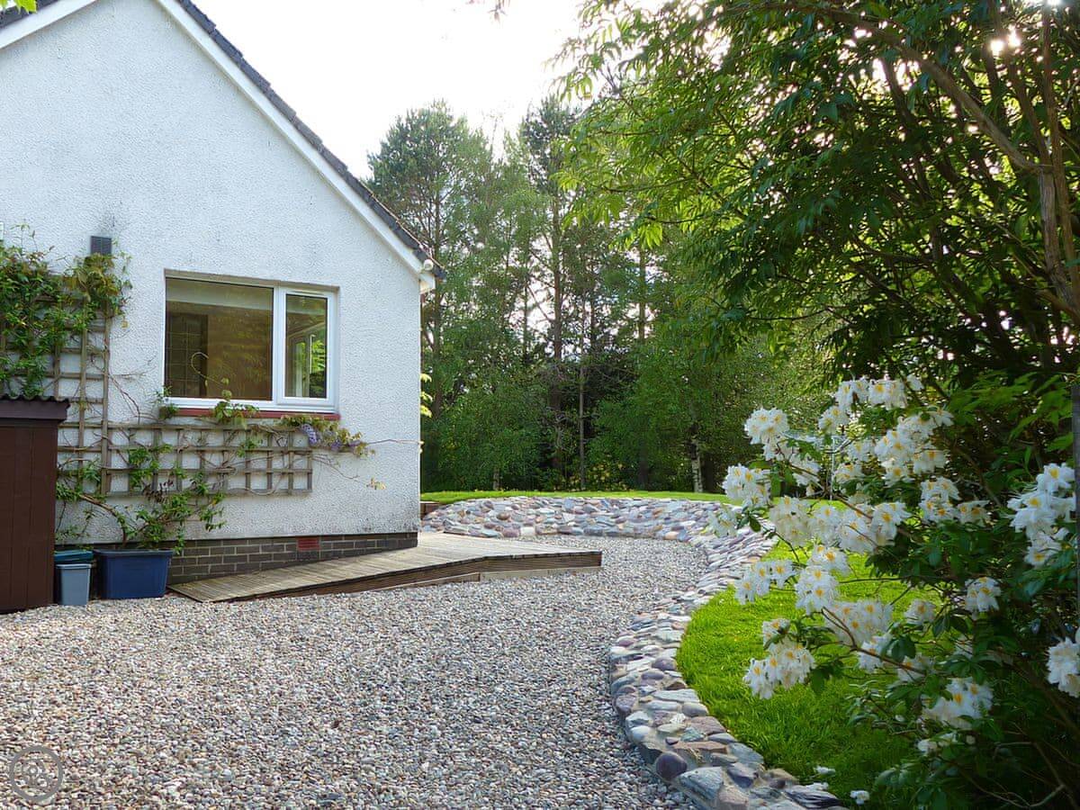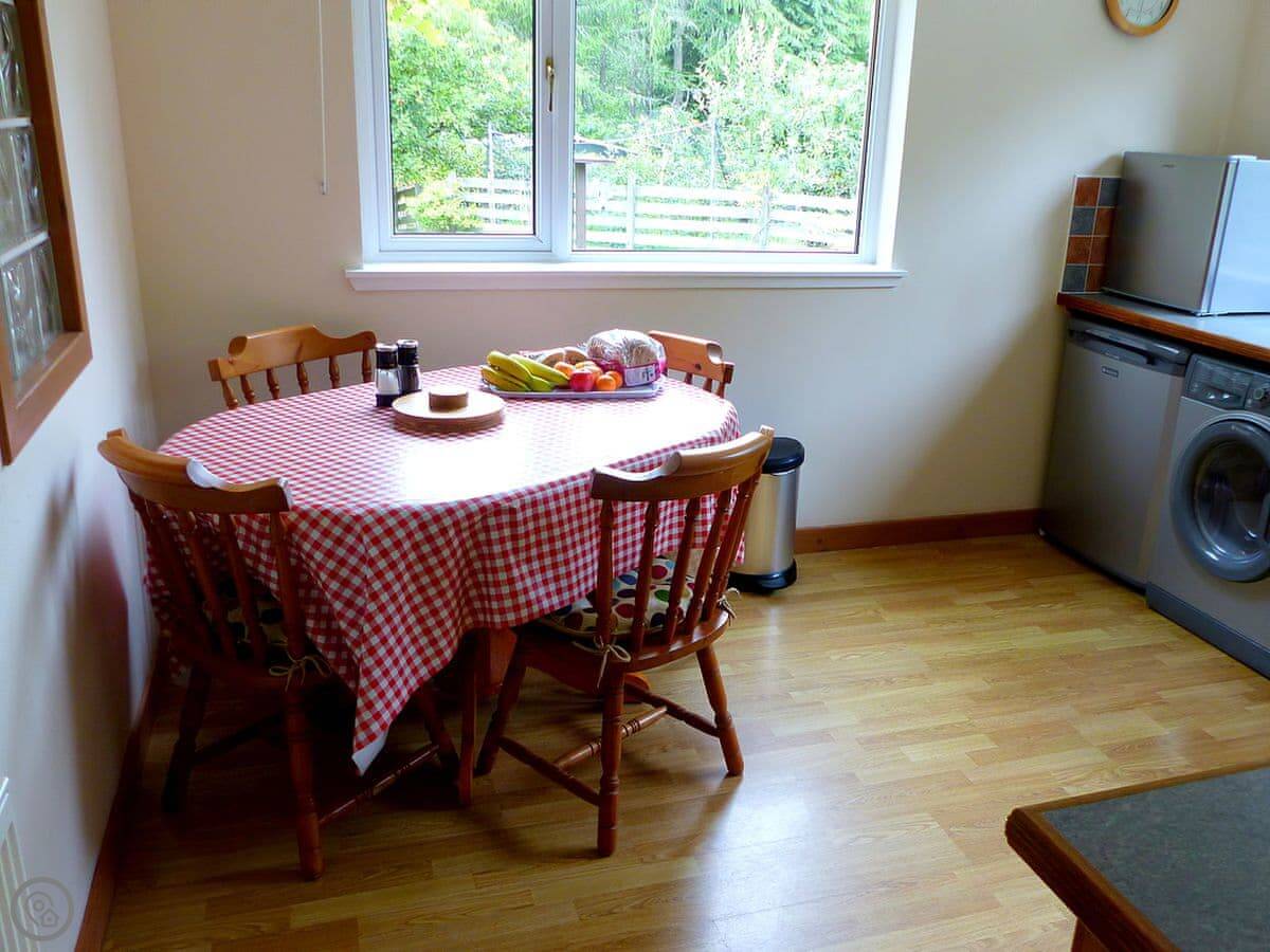 This is Bo Nan Taigh Cottage. It's on the edge of Aberfoyle, in the Queen Elizabeth Forest Park. It's quiet here. You look out over woods and a wildlife pond from the garden.
