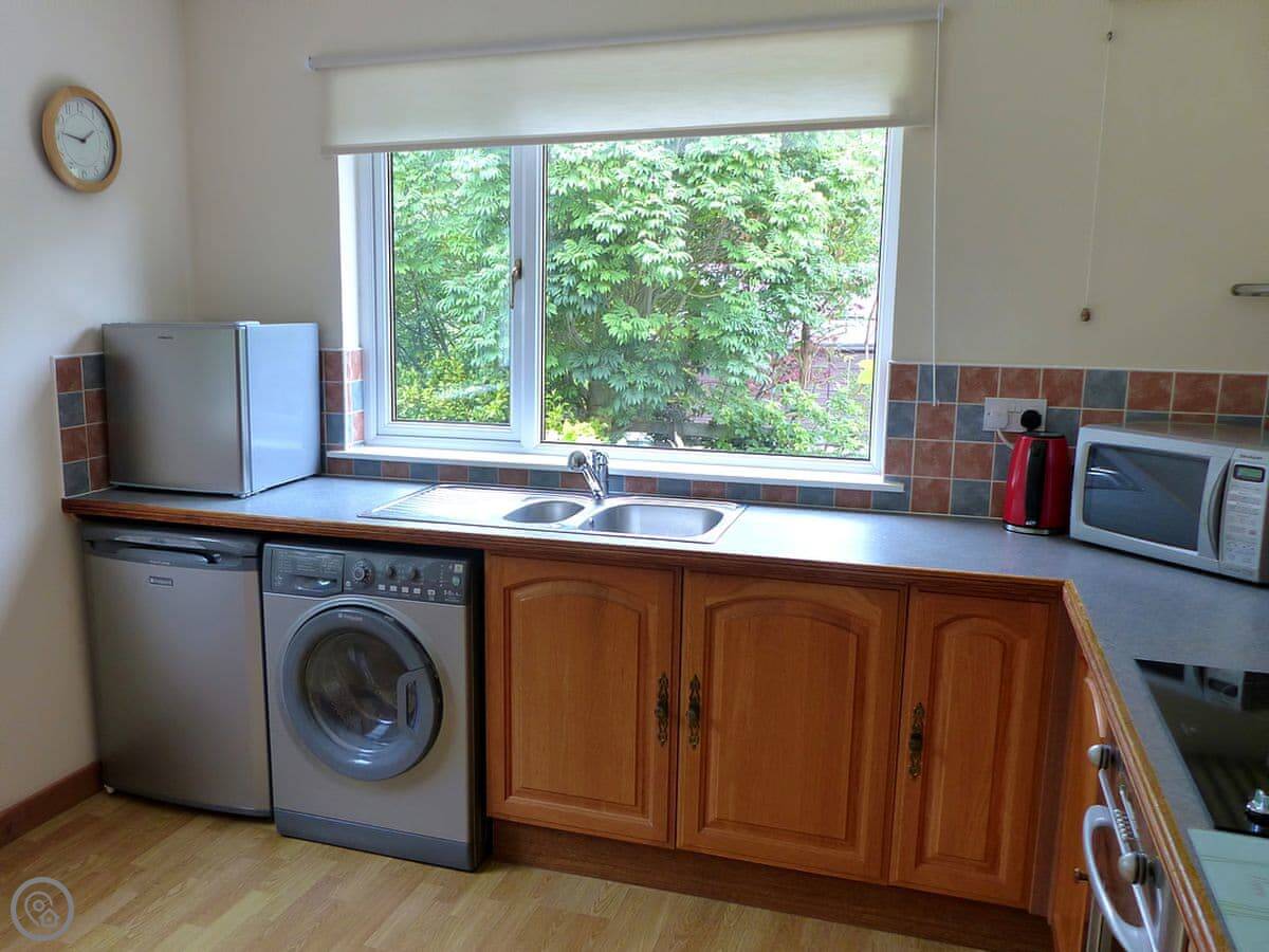 Inside, you've got a washing machine, dishwasher, Wi-Fi, and TV. Bedding and towels are included. It is wheelchair accessible at the entrance and has some grab rails. You can bring up to two dogs.